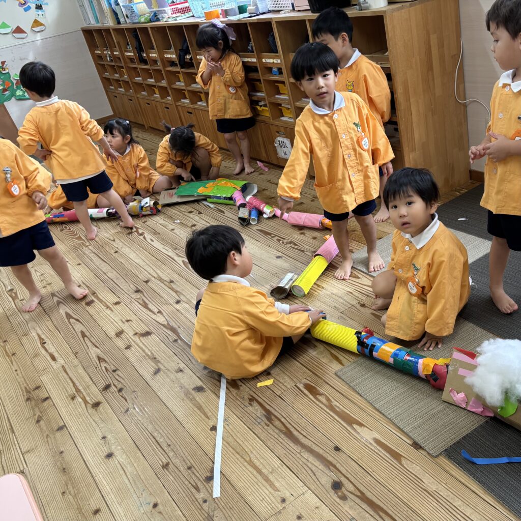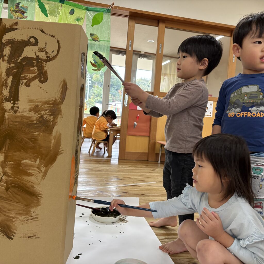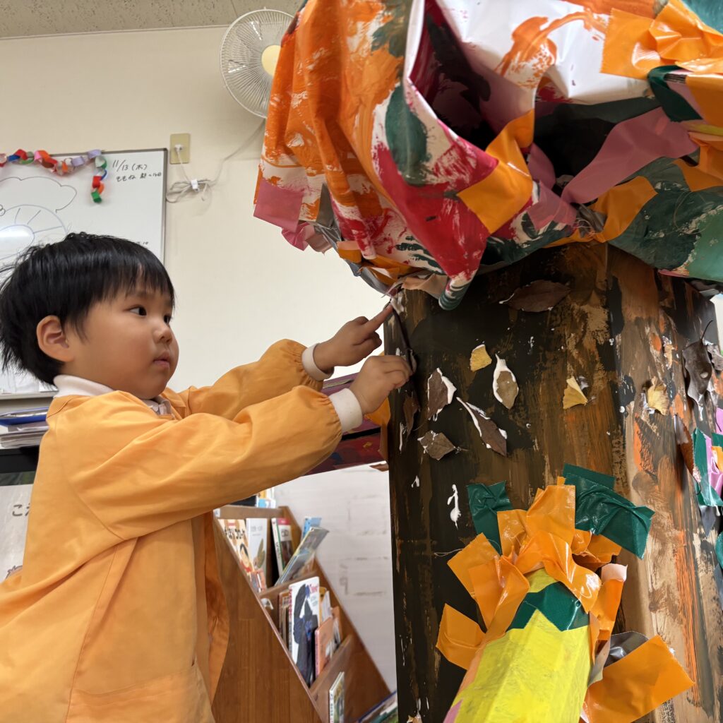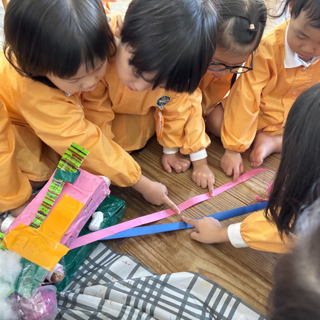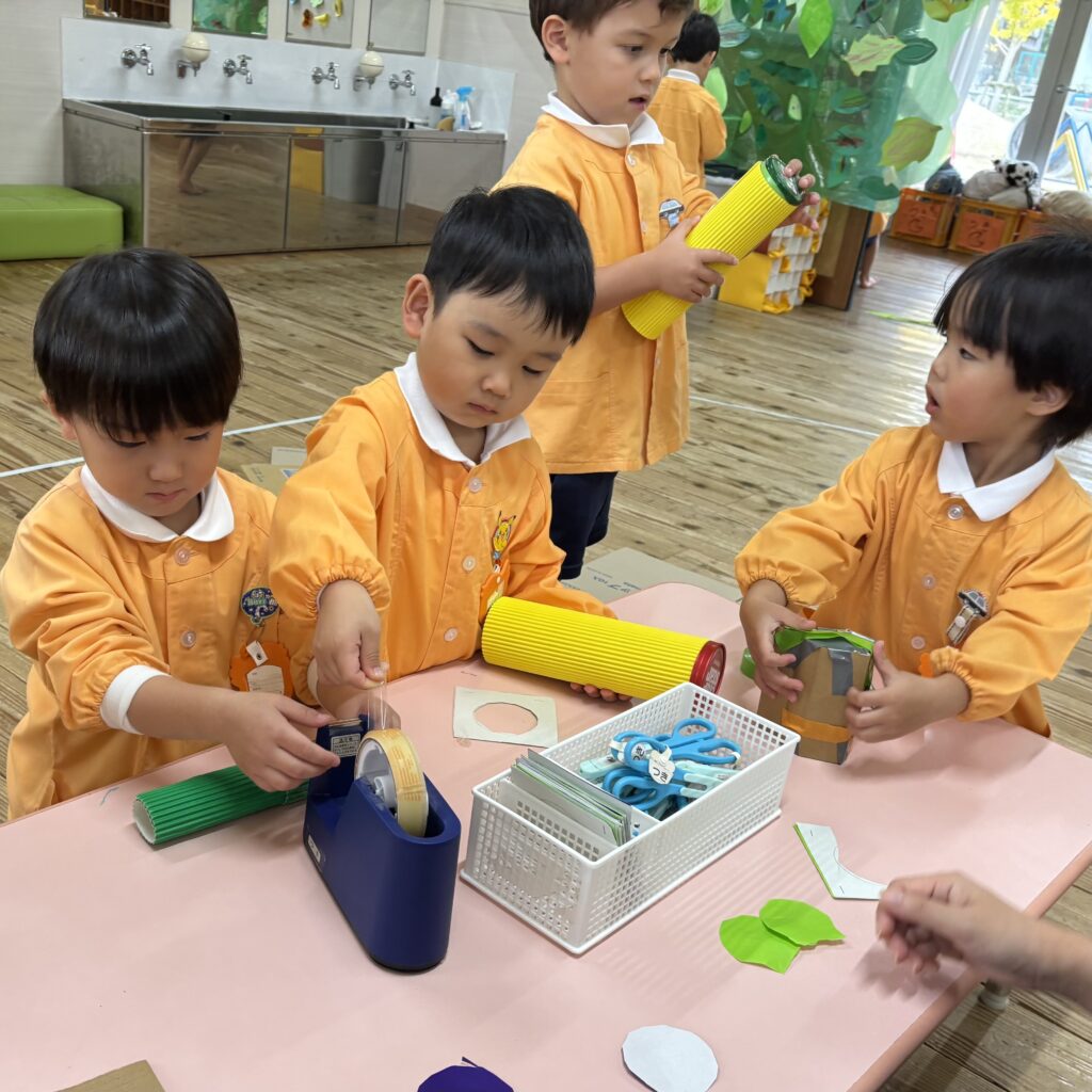 「みんなでヘビ、どうやって作ろう?」とグループで集まり相談する中で、まず初めに取り組んだのは“設計図”作り。「ながーーくしようよ!!山口先生より長く!」「ベロもあって、目も“秋のもの”で作ろうよ」と、遠足で持ち帰ってきたどんぐりや園庭の銀杏の葉なども使うことに決めました。「みんなが作った身体、どんどんつなげたら長くなるかも!」「テープでつけたらいいんじゃない?」と、話し合いの時から子どもたちのアイデアは泉のように溢れ出て、それぞれの案を合わせていく過程を大事に進めていきました。