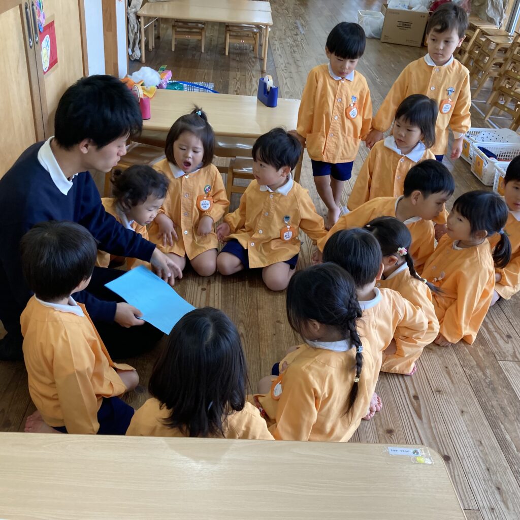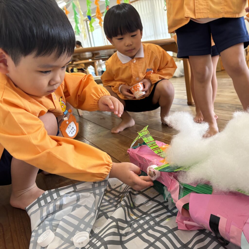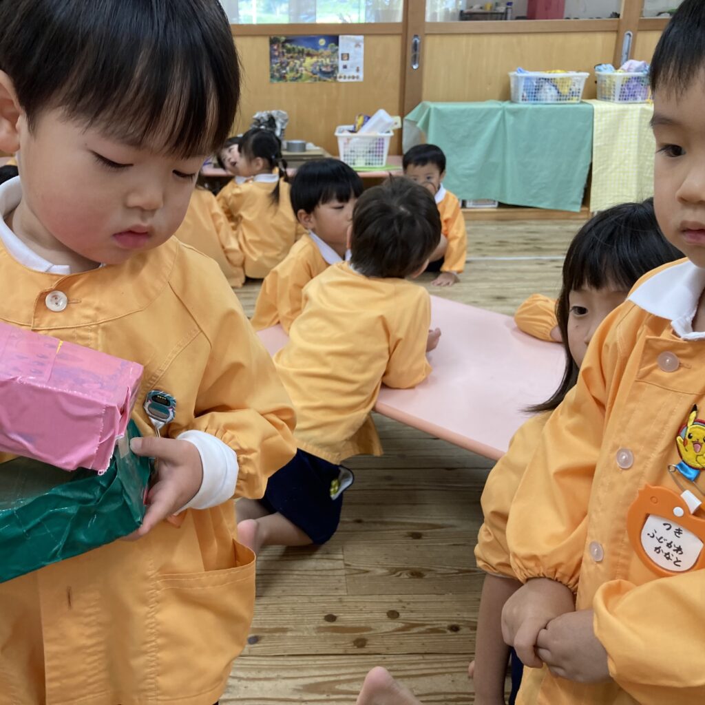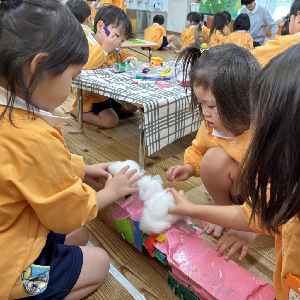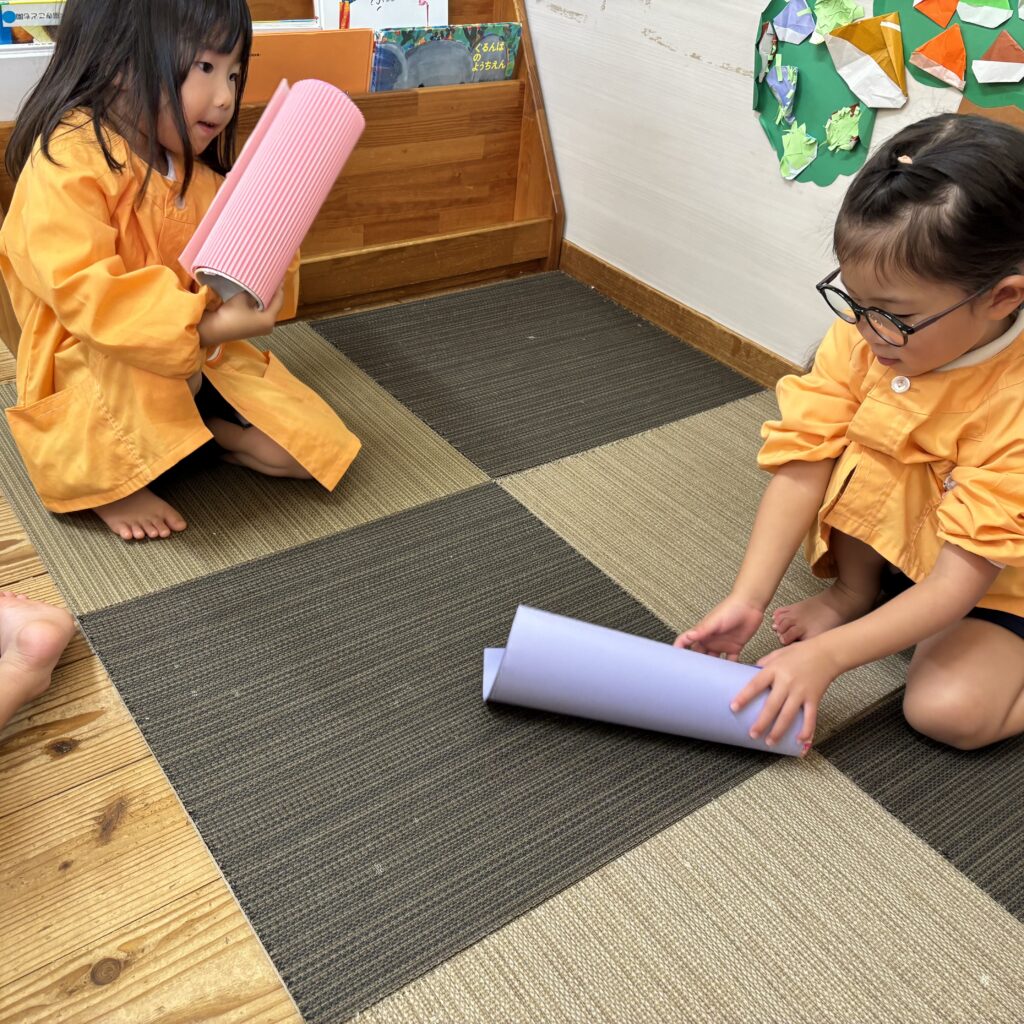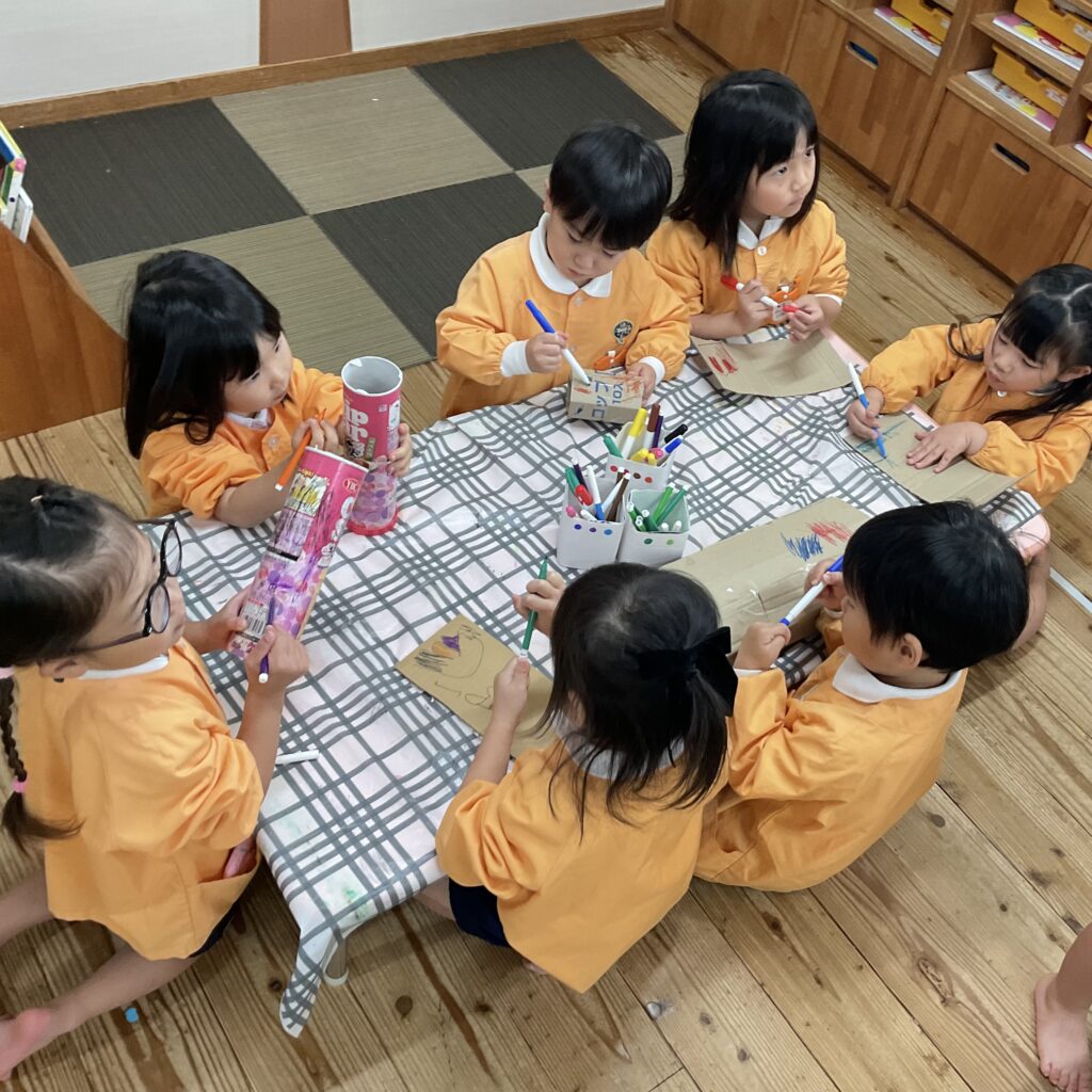 「みんなでヘビ、どうやって作ろう?」とグループで集まり相談する中で、まず初めに取り組んだのは“設計図”作り。「ながーーくしようよ!!山口先生より長く!」「ベロもあって、目も“秋のもの”で作ろうよ」と、遠足で持ち帰ってきたどんぐりや園庭の銀杏の葉なども使うことに決めました。「みんなが作った身体、どんどんつなげたら長くなるかも!」「テープでつけたらいいんじゃない?」と、話し合いの時から子どもたちのアイデアは泉のように溢れ出て、それぞれの案を合わせていく過程を大事に進めていきました。