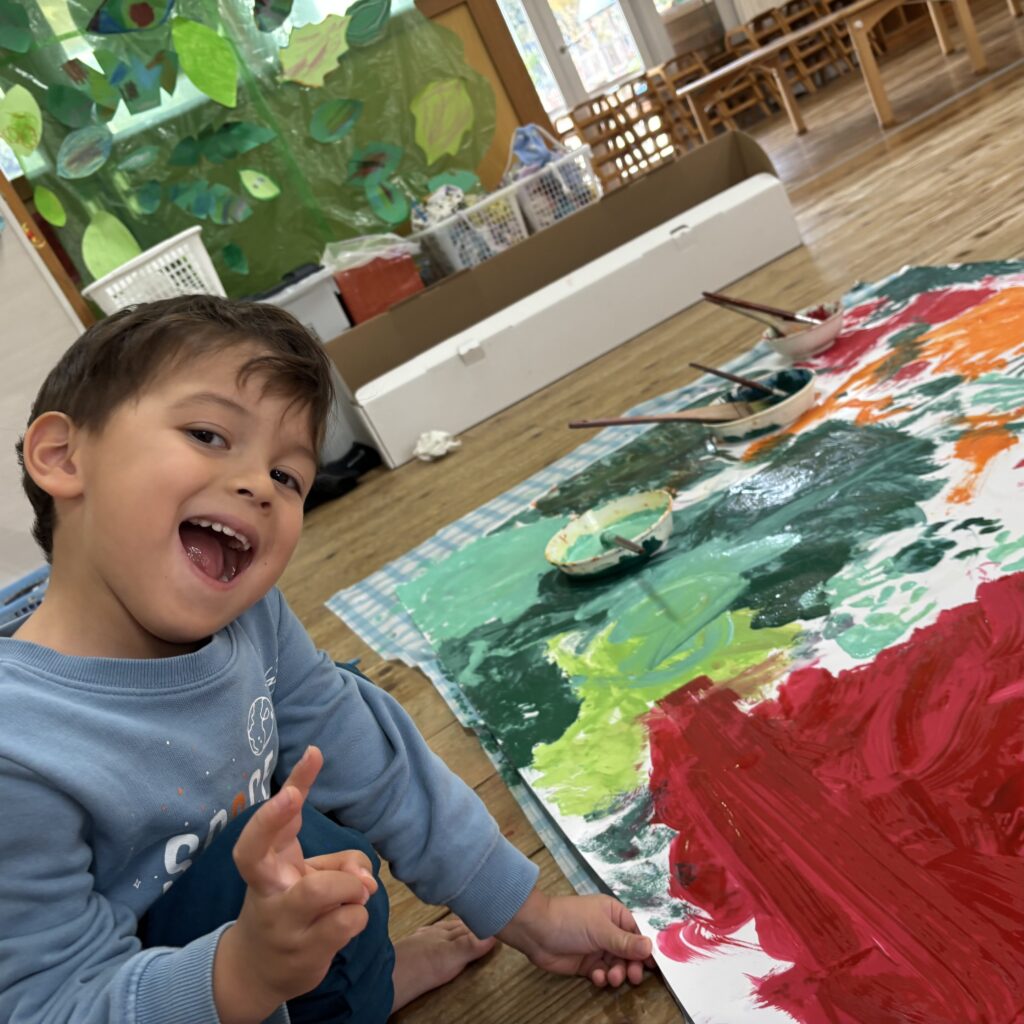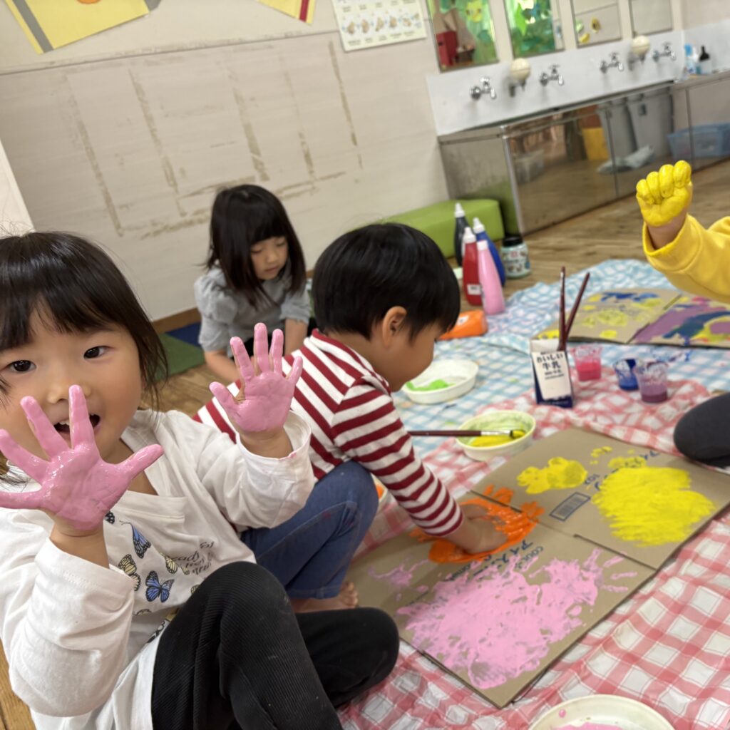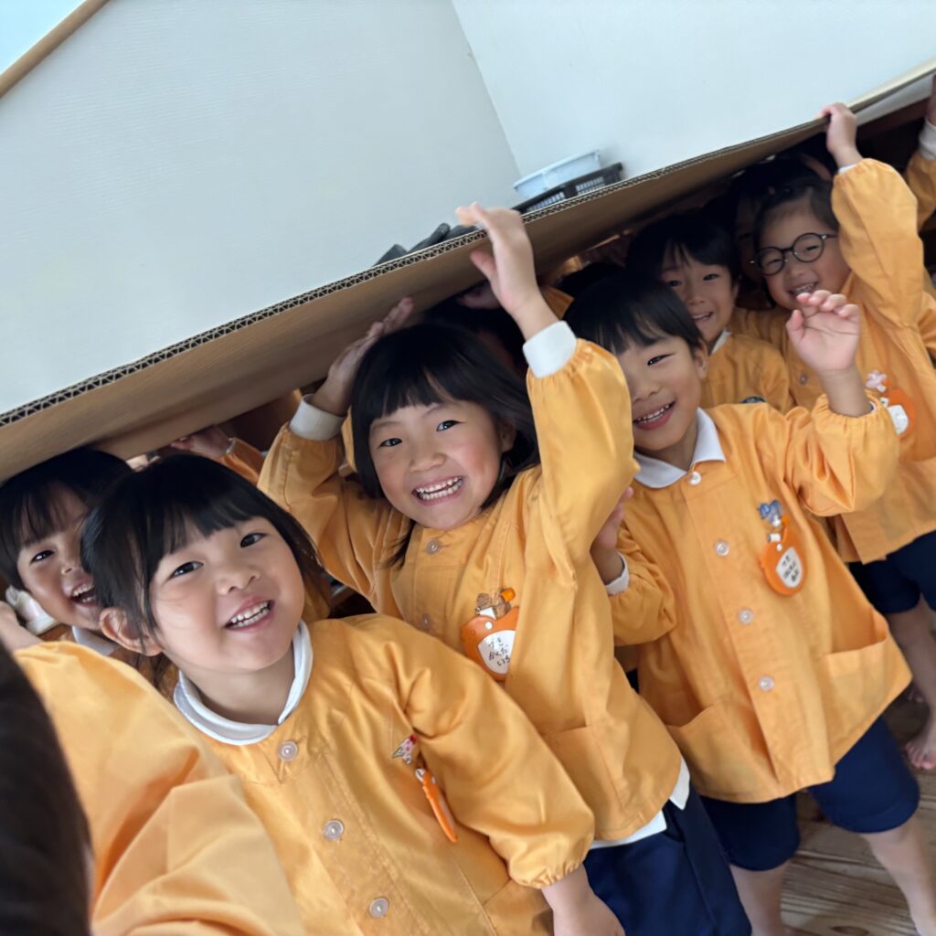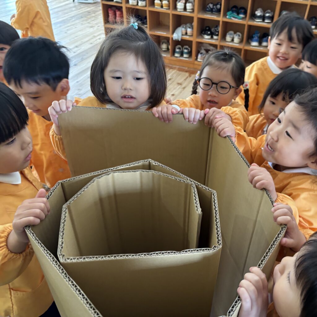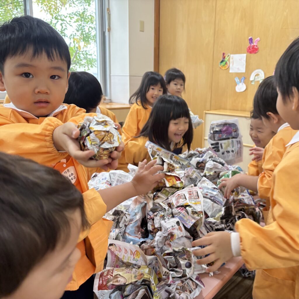 「みんなでヘビ、どうやって作ろう?」とグループで集まり相談する中で、まず初めに取り組んだのは“設計図”作り。「ながーーくしようよ!!山口先生より長く!」「ベロもあって、目も“秋のもの”で作ろうよ」と、遠足で持ち帰ってきたどんぐりや園庭の銀杏の葉なども使うことに決めました。「みんなが作った身体、どんどんつなげたら長くなるかも!」「テープでつけたらいいんじゃない?」と、話し合いの時から子どもたちのアイデアは泉のように溢れ出て、それぞれの案を合わせていく過程を大事に進めていきました。