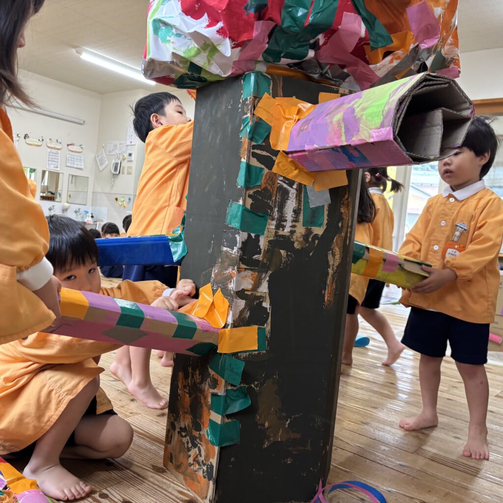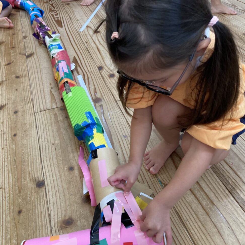 グループの取り組みの中で、子どもたちの口から自然に出てきていたのは“巻き巻き”という言葉。ダンボールを巻いたり紙を巻いたりテープで留めたり、最後は「ヘビを木に巻き巻きしよう」と、出来上がったヘビもそのまま飾るのではなく、このグループオリジナルの木に巻きついちゃってます♡子どもたちのアイデアが至る所に詰まった超大作!一関節ずつじっくりとご覧ください♪