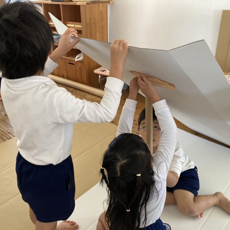 柱をつけたり滑り台に色をつけたり、ハシゴを作ったりみんなで協力して作っていきました。完成も間近!?と思ったある朝、滑り台を見にいくとぺっちゃんこになっていました。それを見た子どもたちはびっくり!!