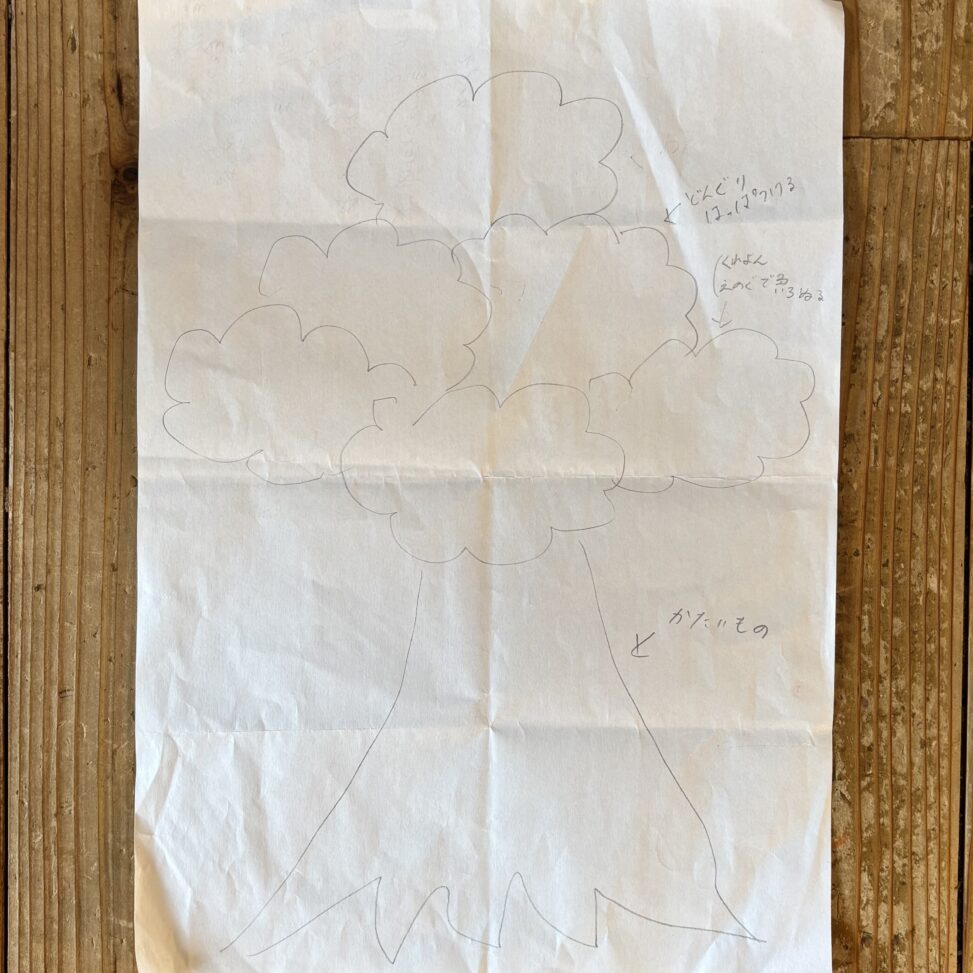おたまじゃくしかえるグループでは、キャンプ場に置く“木”を作ることになり、まず設計図づくりから始めました。テントづくりの経験を思い出し、「幹は大きいダンボールにしよ!」とすぐに決まりました。葉っぱはどうする?と話し合いながら材料を探しました。