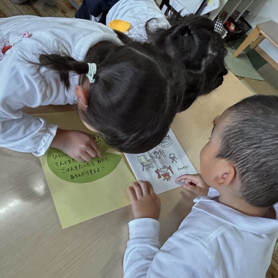 “10匹のかえる”からもらった本を読んでいると、山の中を走る電車を見つけた子どもたち。「私たちのキャンプ場にも電車いるかも!」と、電車作りがスタート!箱やトイレットペーパーの芯で高さを出してみたり、ダンボールで繋ぎ合わせたりと工夫いーっぱいの壁。電車の中を覗いてみると、操縦席やハンドルもあります。外見だけでなく、中もじーっくり見ていって下さいね☆