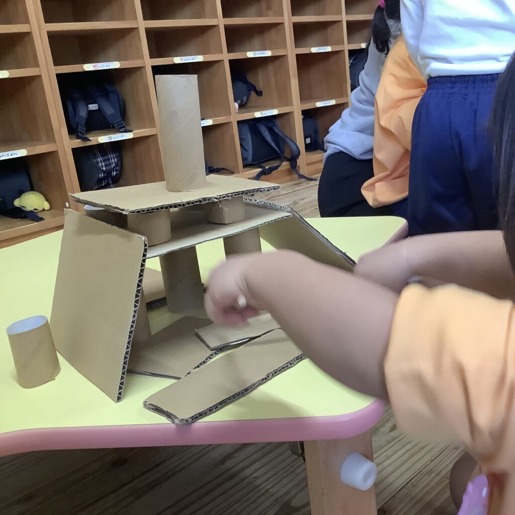 ダンボール、トイレットペーパー芯で遊びました。始めは並べたり積み上げたりして楽しんでいましたが、何回か遊んでいくうちに「おうちみたい」「ここは滑り台」など自分のイメージを持って組み立てるようになりました。