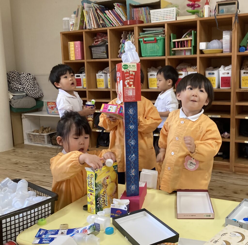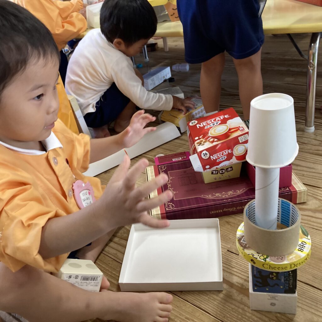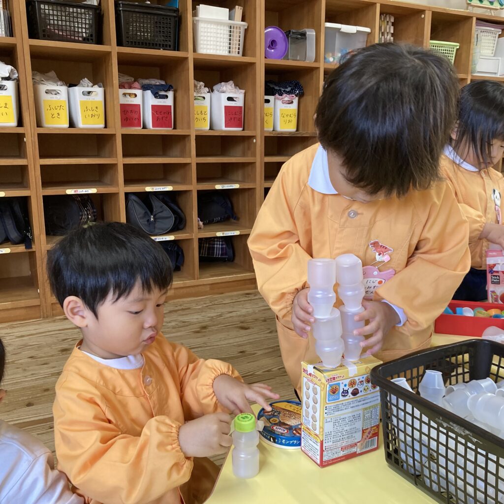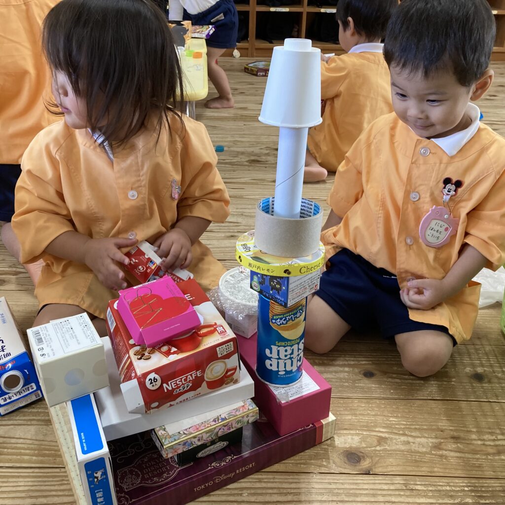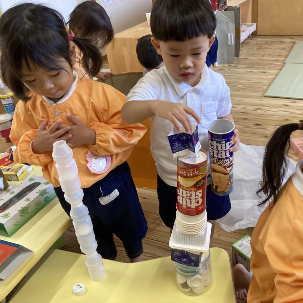ヤクルト容器を高く積み上げてタワーのようにしたり、ポテトチップスの筒箱を重ねて大きな構造物を作ったりと、集中して組み立てる姿が多く見られました。「もっと高くしたい!」と慎重に手を伸ばして積む子の姿や、うまくバランスがとれずに崩れてしまい「あー!」と悔しがる姿もあり、遊びの中でたくさんの試行錯誤を楽しんでいました。