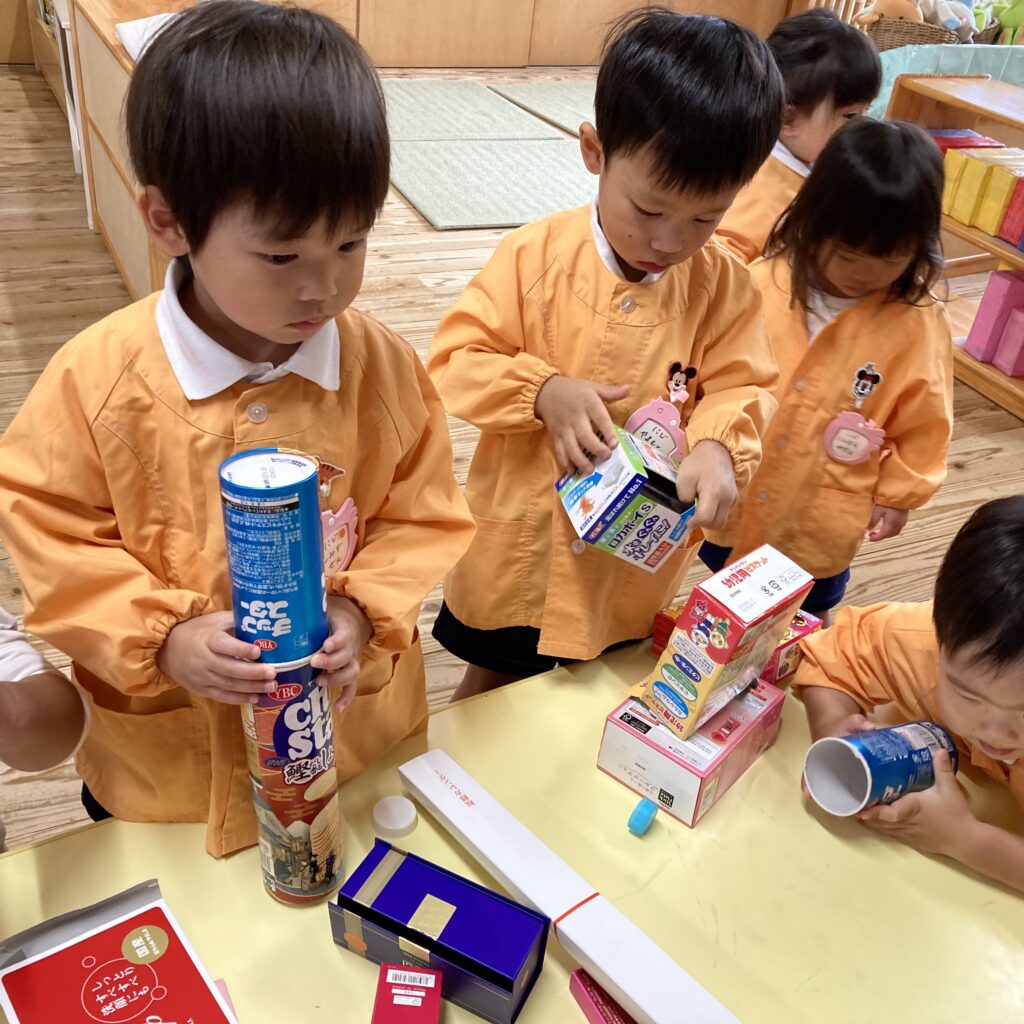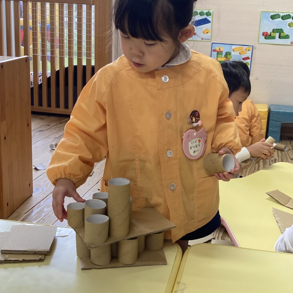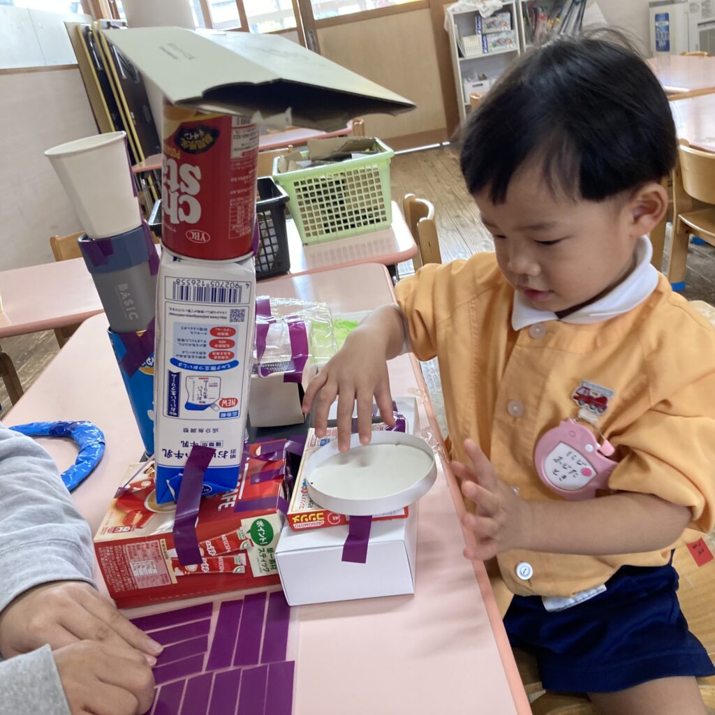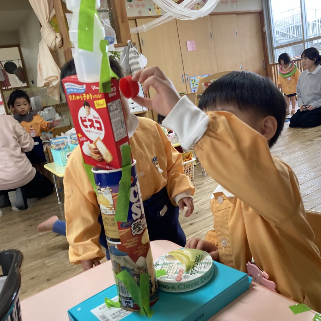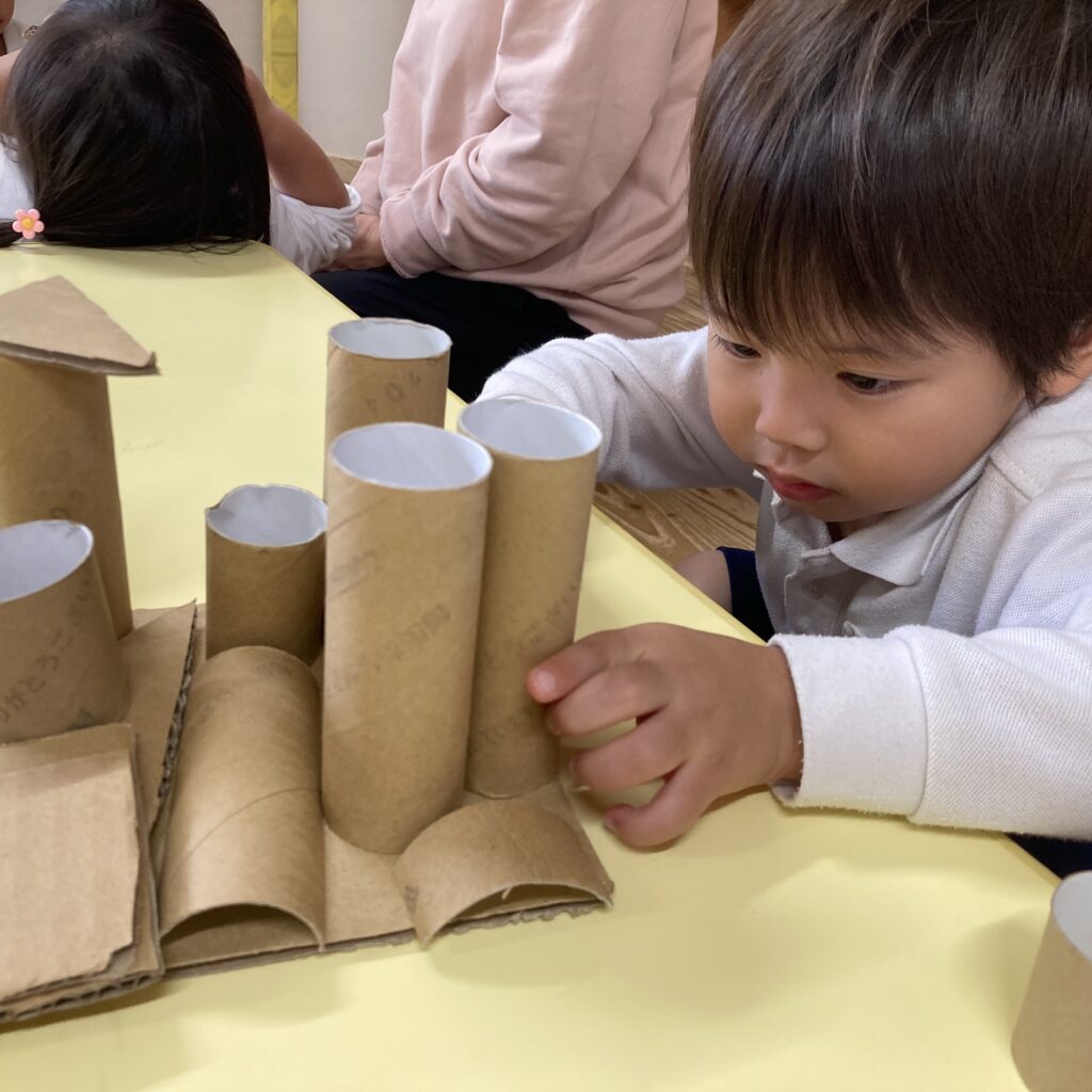ヤクルト容器を高く積み上げてタワーのようにしたり、ポテトチップスの筒箱を重ねて大きな構造物を作ったりと、集中して組み立てる姿が多く見られました。「もっと高くしたい!」と慎重に手を伸ばして積む子の姿や、うまくバランスがとれずに崩れてしまい「あー!」と悔しがる姿もあり、遊びの中でたくさんの試行錯誤を楽しんでいました。
