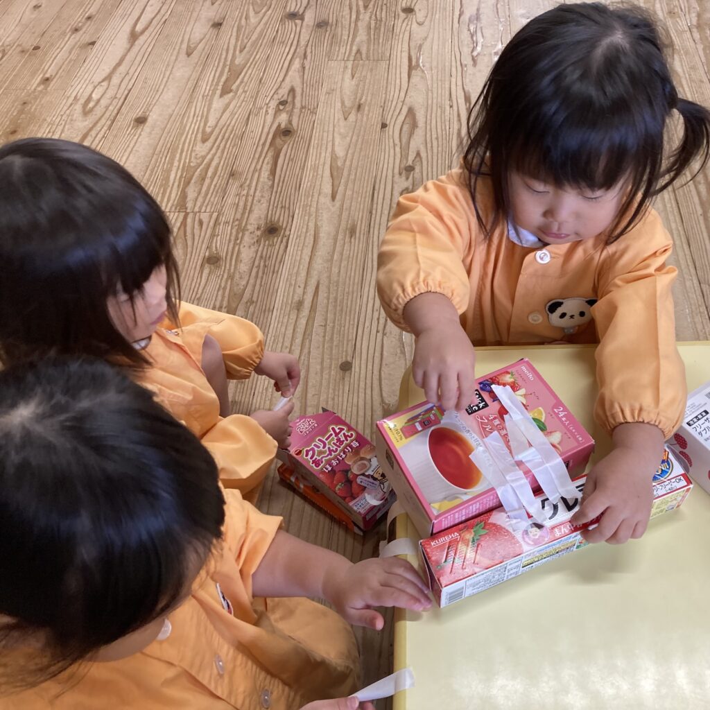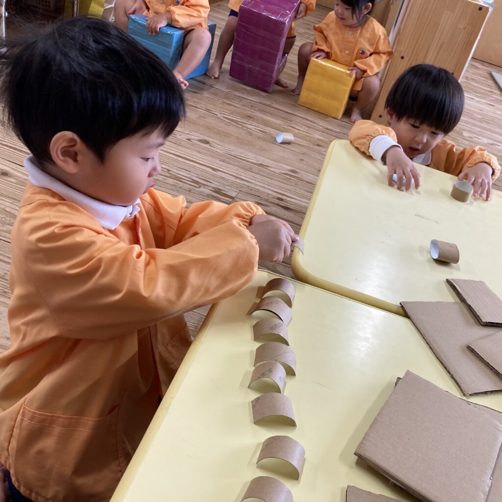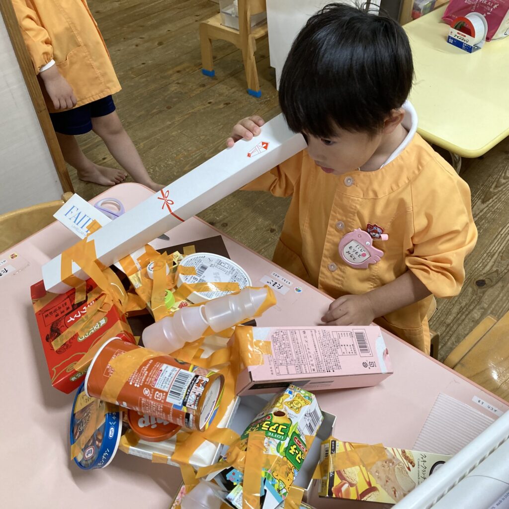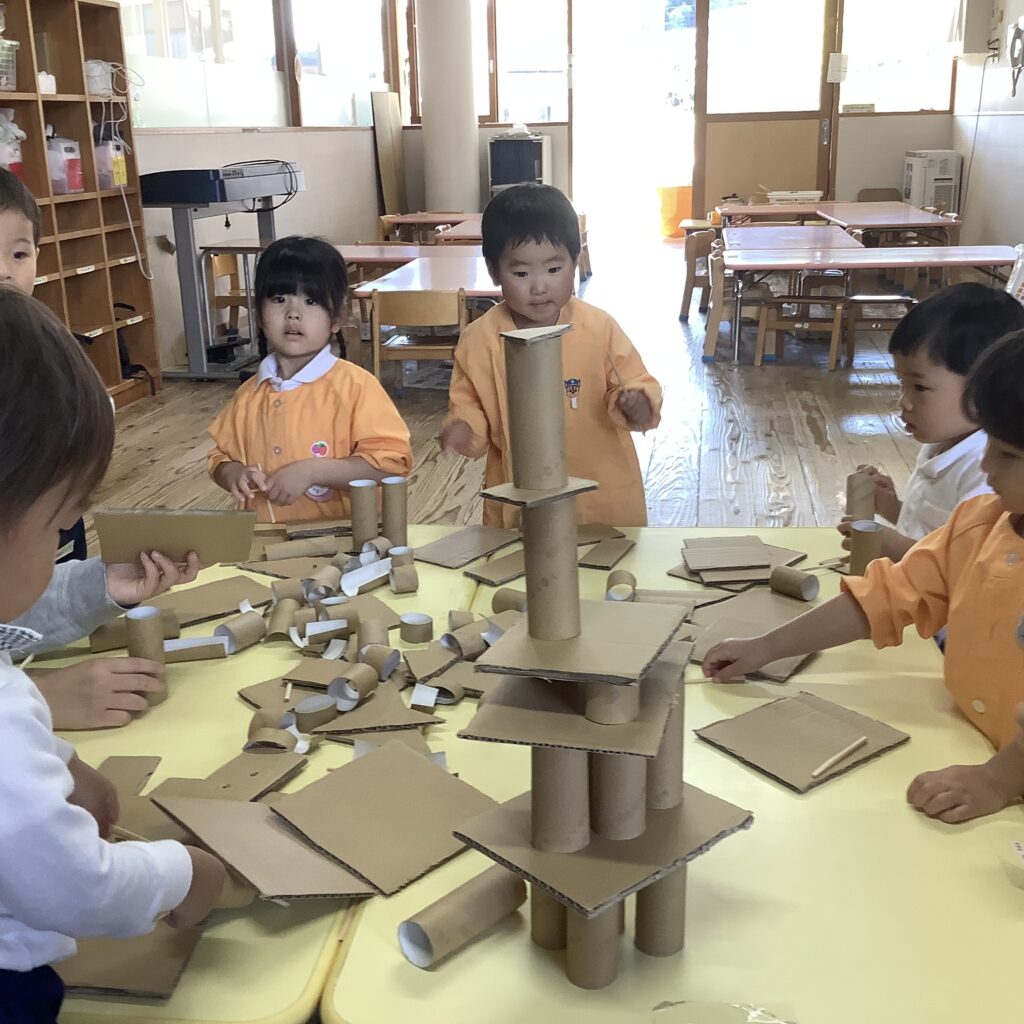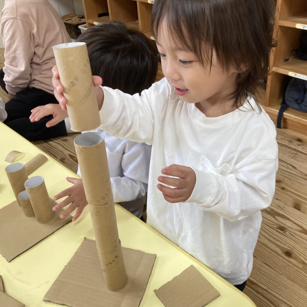 ヤクルト容器を高く積み上げてタワーのようにしたり、ポテトチップスの筒箱を重ねて大きな構造物を作ったりと、集中して組み立てる姿が多く見られました。「もっと高くしたい!」と慎重に手を伸ばして積む子の姿や、うまくバランスがとれずに崩れてしまい「あー!」と悔しがる姿もあり、遊びの中でたくさんの試行錯誤を楽しんでいました。