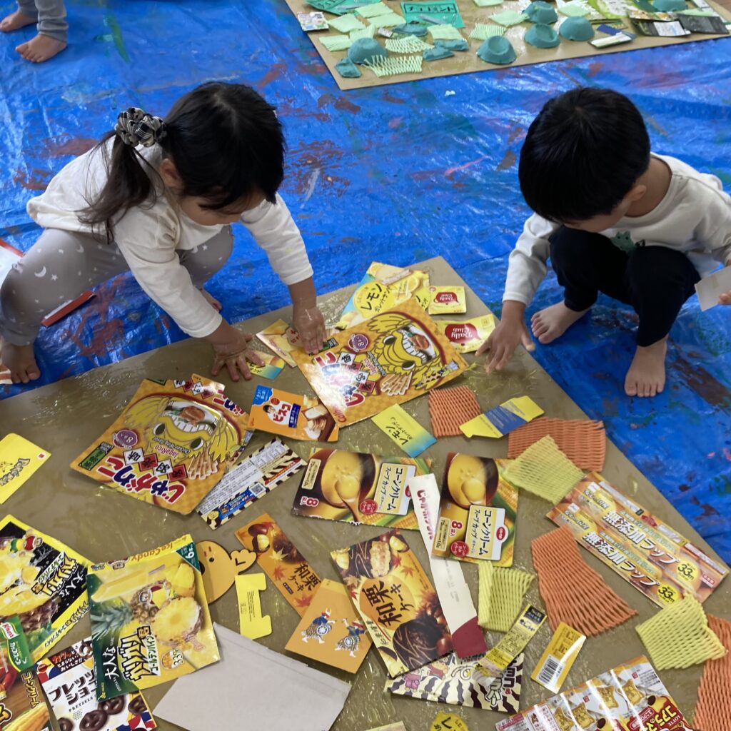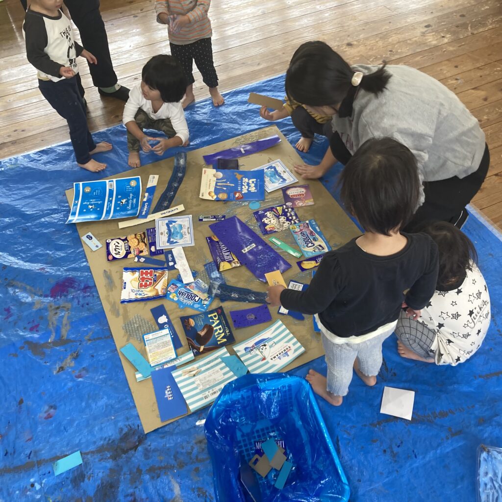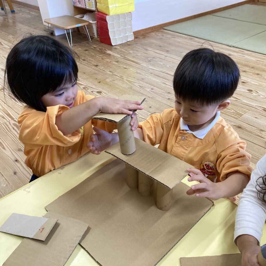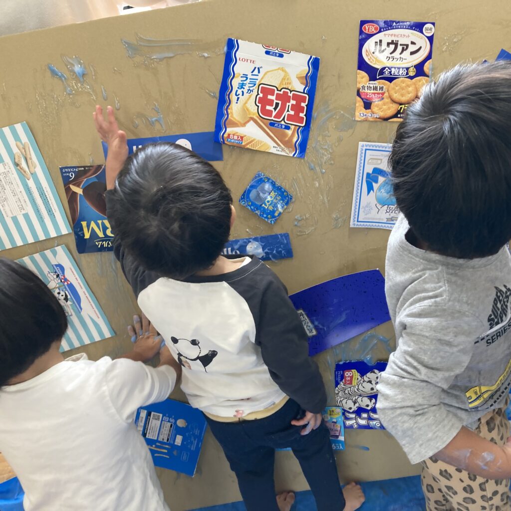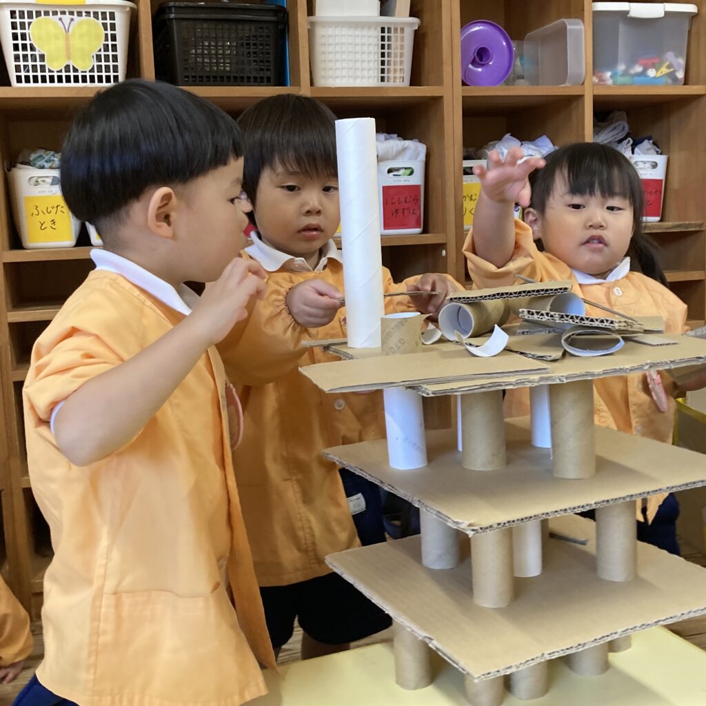 ヤクルト容器を高く積み上げてタワーのようにしたり、ポテトチップスの筒箱を重ねて大きな構造物を作ったりと、集中して組み立てる姿が多く見られました。「もっと高くしたい!」と慎重に手を伸ばして積む子の姿や、うまくバランスがとれずに崩れてしまい「あー!」と悔しがる姿もあり、遊びの中でたくさんの試行錯誤を楽しんでいました。