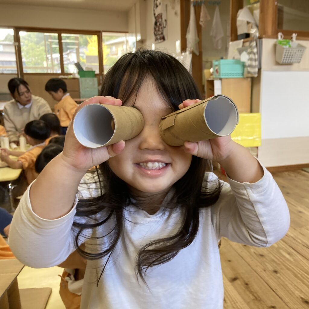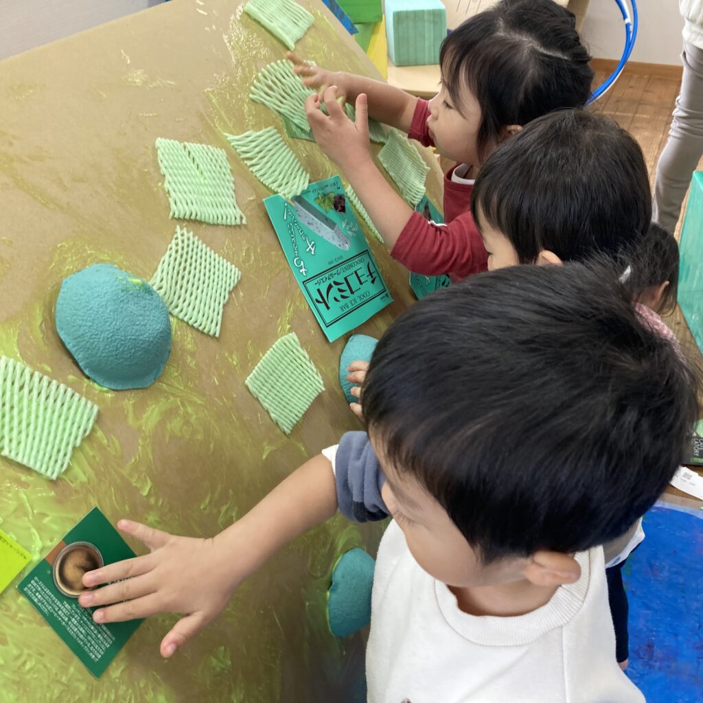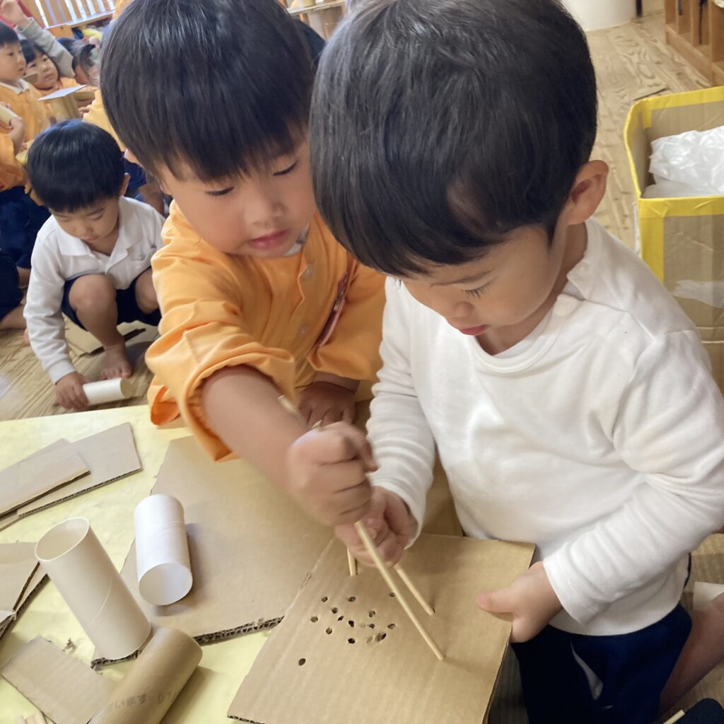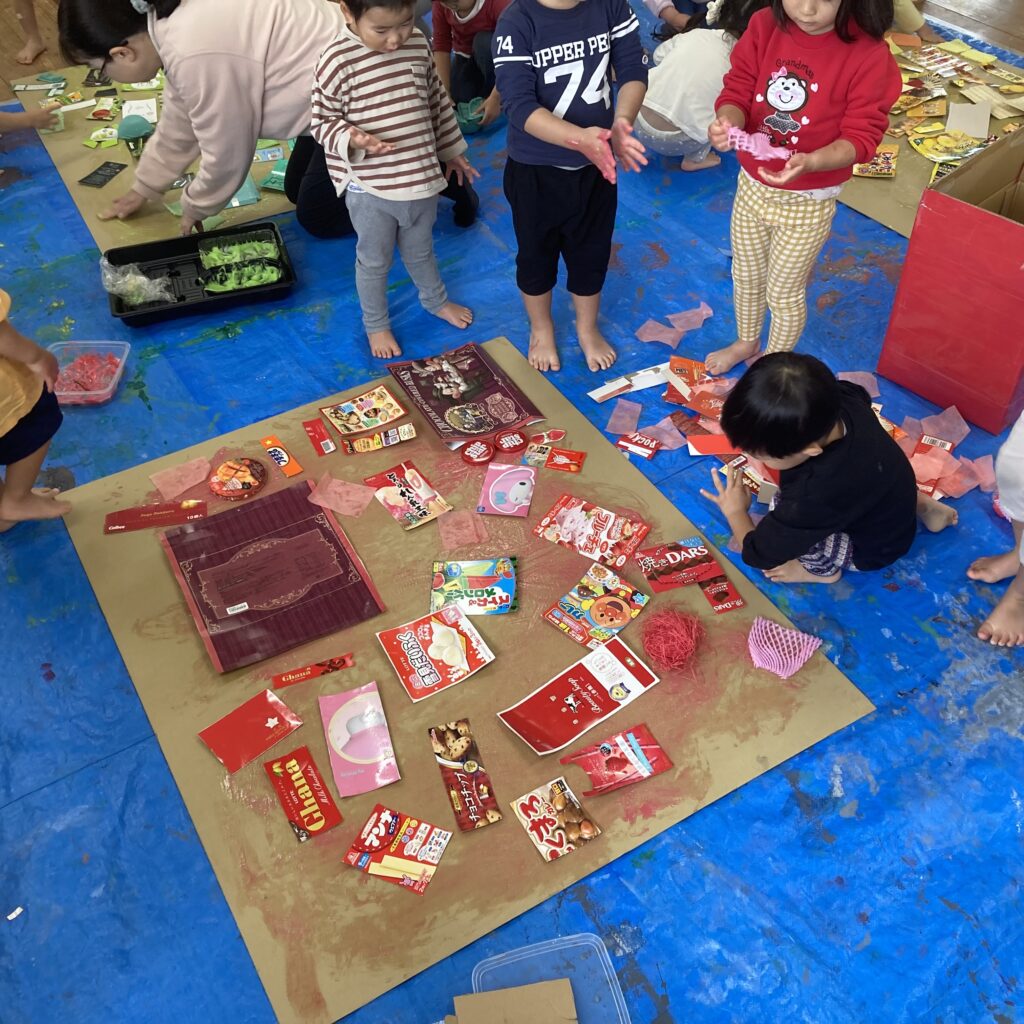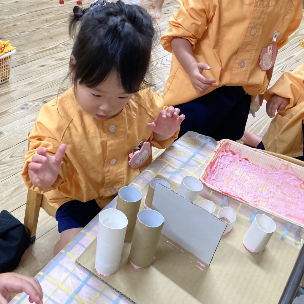 ヤクルト容器を高く積み上げてタワーのようにしたり、ポテトチップスの筒箱を重ねて大きな構造物を作ったりと、集中して組み立てる姿が多く見られました。「もっと高くしたい!」と慎重に手を伸ばして積む子の姿や、うまくバランスがとれずに崩れてしまい「あー!」と悔しがる姿もあり、遊びの中でたくさんの試行錯誤を楽しんでいました。