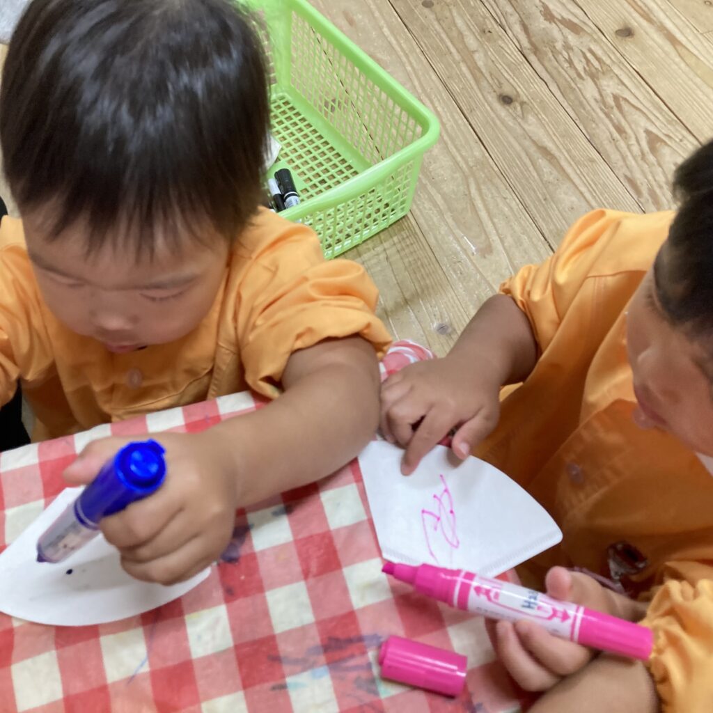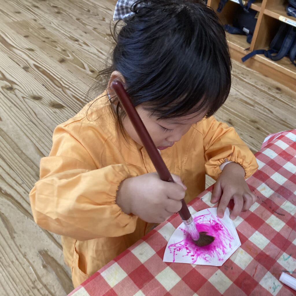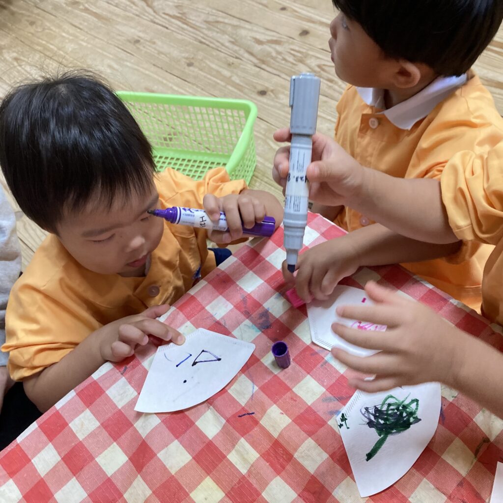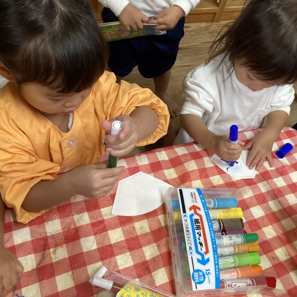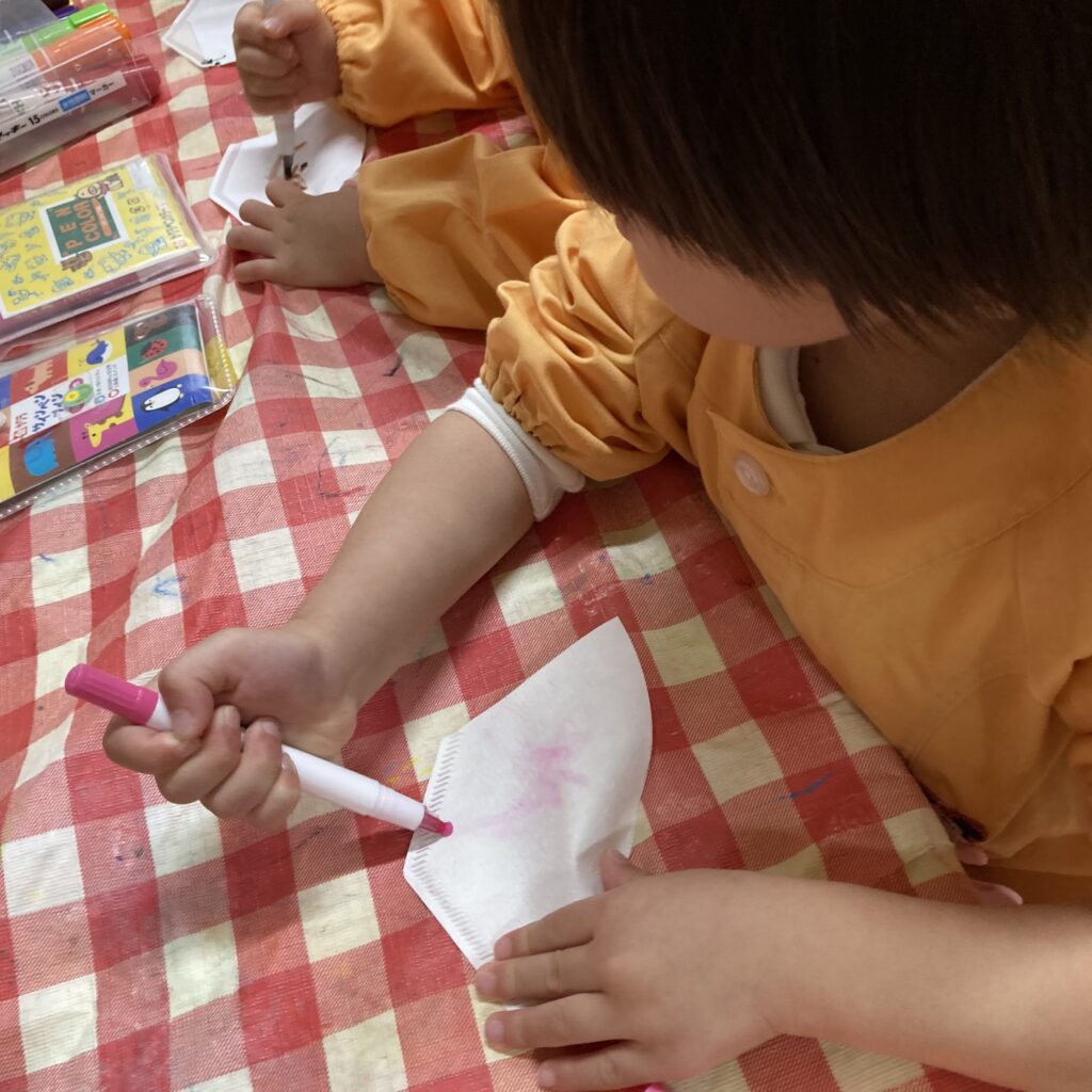 「僕は青がいい!」「ピンクとオレンジで塗ったよー!」など、自分の好きな色をこだわって選ぶ姿も見られ、子どもたちは楽しみながら活動に取り組んでいました。