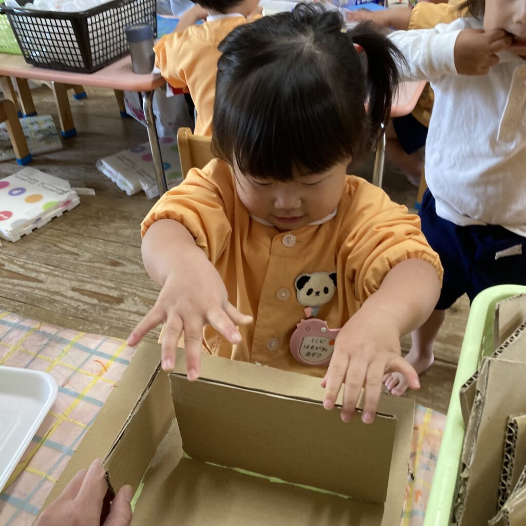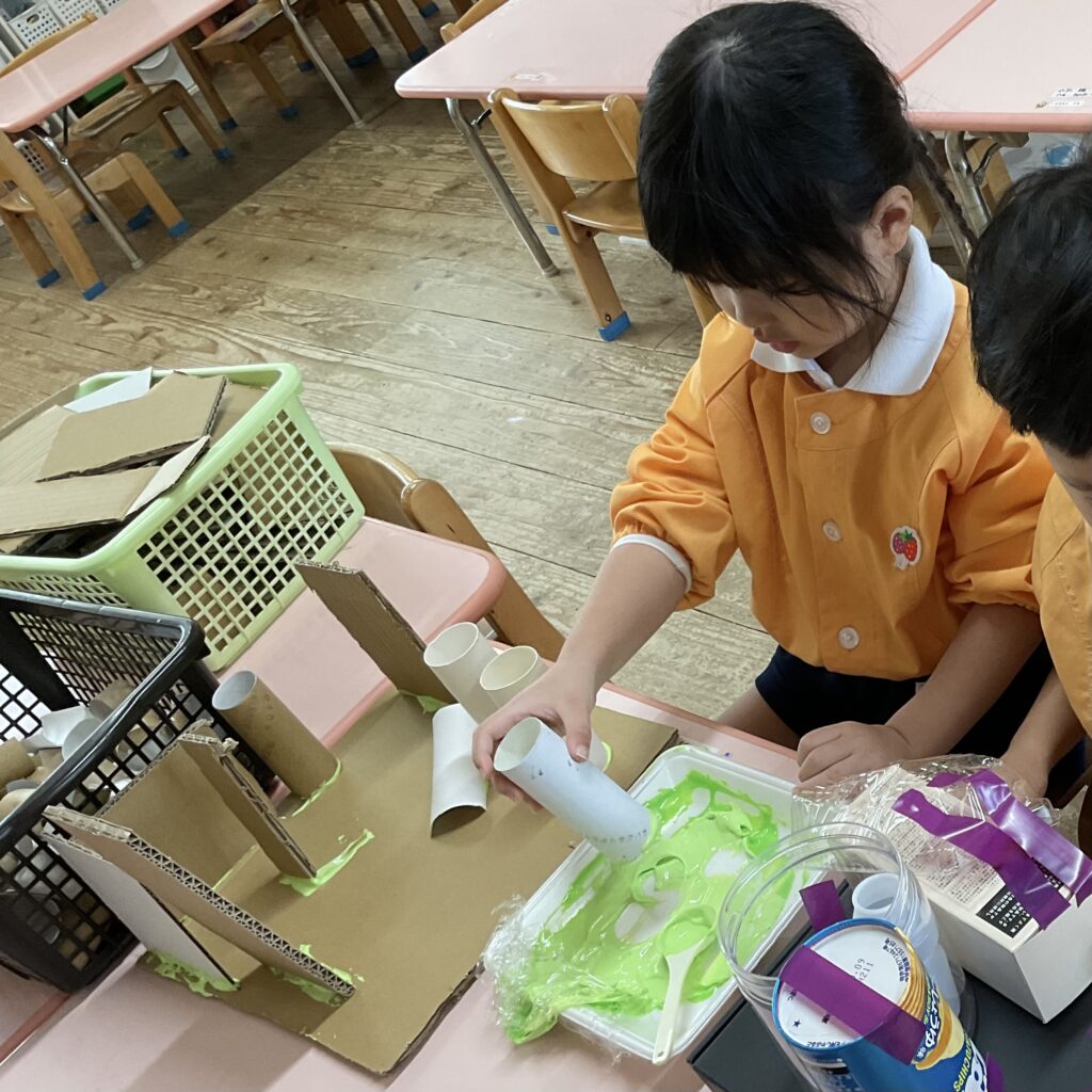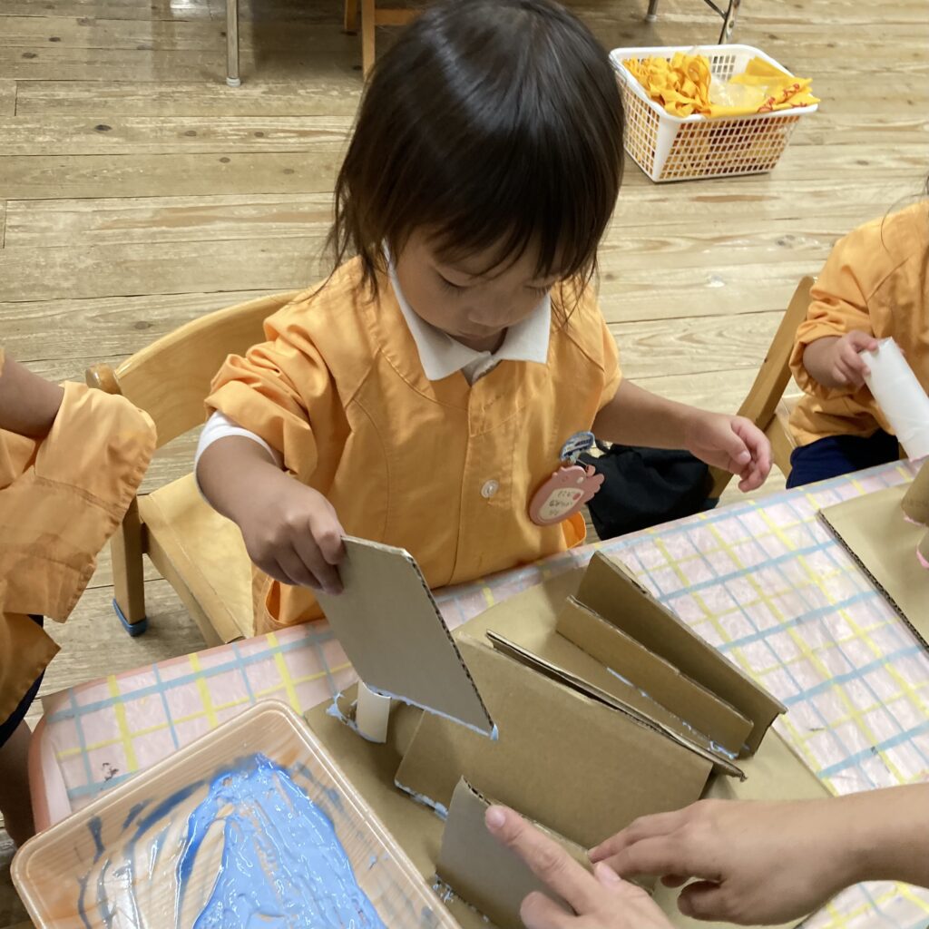 個人製作では、1色のビニールテープを使い、選んだ箱同士をつなげて作品づくりに取り組みました。「ここにつけたい!」と保育者に伝えながらテープを貼る子、固定の仕方に悩みつつ何度も貼り直す子など、それぞれが自分の工夫を発揮し、最後まで集中して素敵な作品を作り上げることができました。