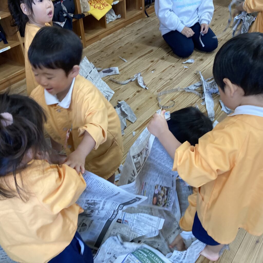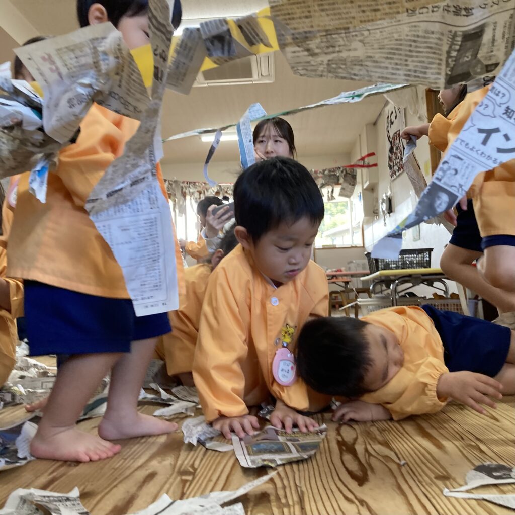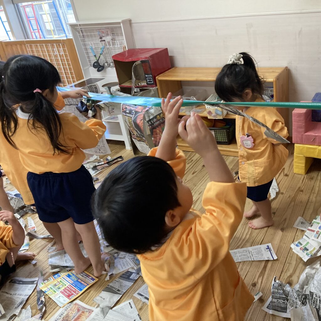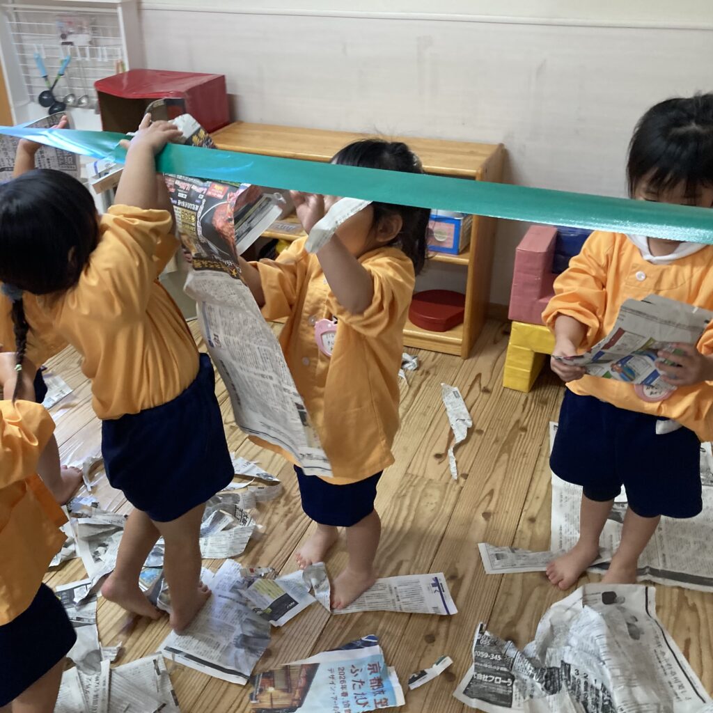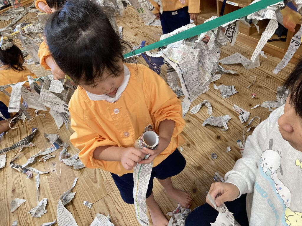 新聞紙を手で長くちぎってみたり、丸めて投げたりして、いろんな遊びを楽しんでいました。子どもたちは、ちぎった新聞紙をふわふわと空に投げるのが大好きで、みんなで「わ〜!」と声をあげて喜んでいました。また、保育者が新聞紙を持って、子どもたちに“グーパンチで穴を開けてみよう!”と言うと、みんな元気にグーパンチして、新聞紙に穴を開け、「もう一回して!」と何度も楽しんでいました。その後、保育者が長いテープを用意して、新聞紙をペタペタくっつけていく遊びが始まりました。貼り方にも個性がたくさんで、みんなでひとつの大きな新聞紙作品ができました。