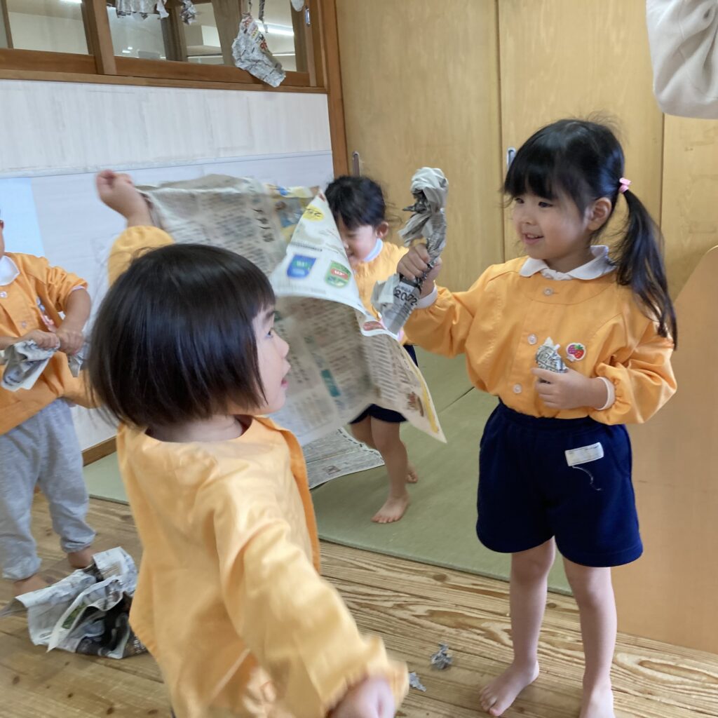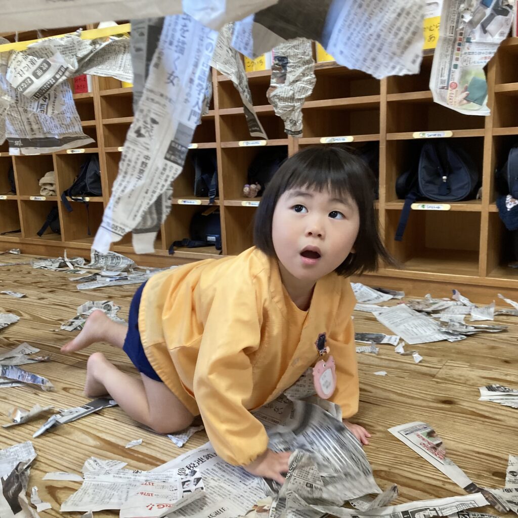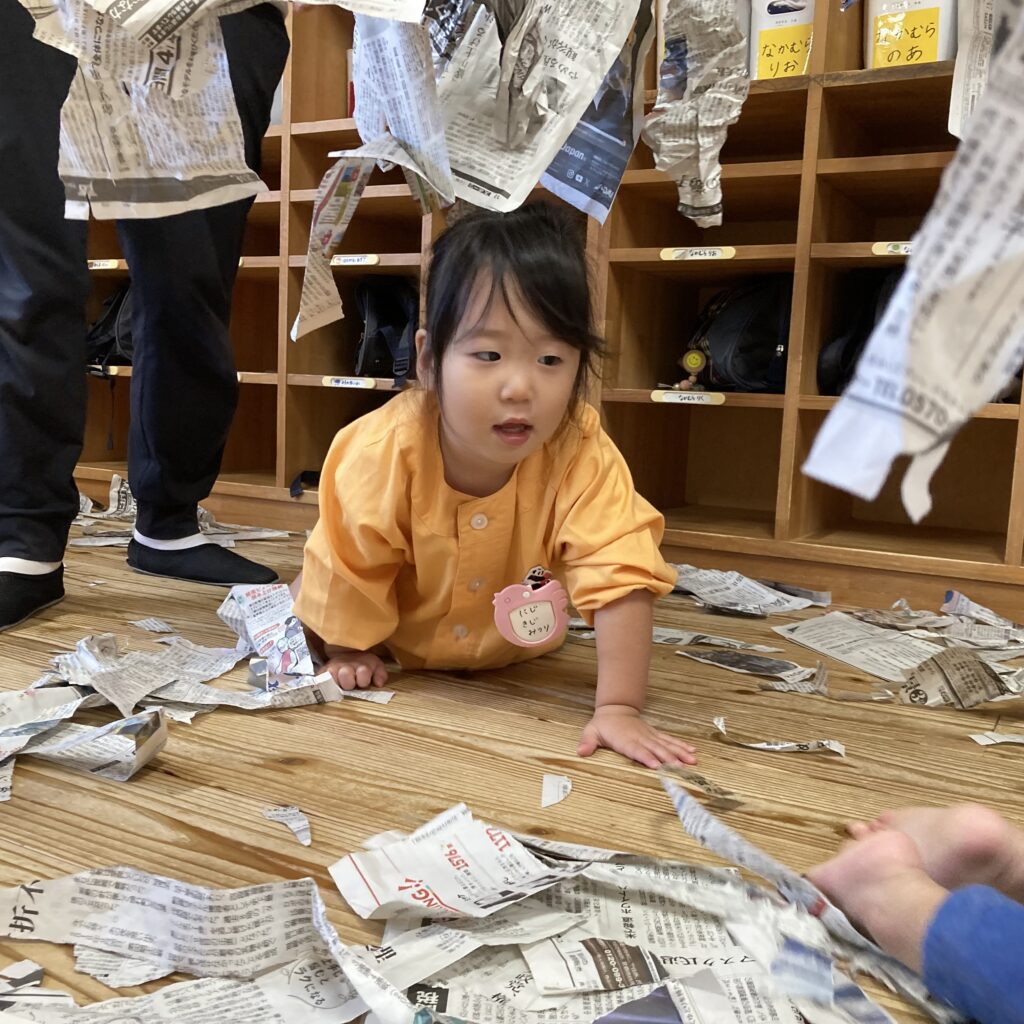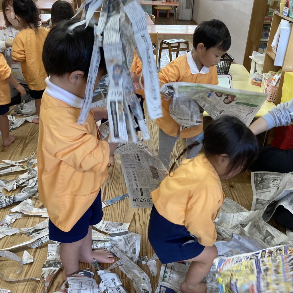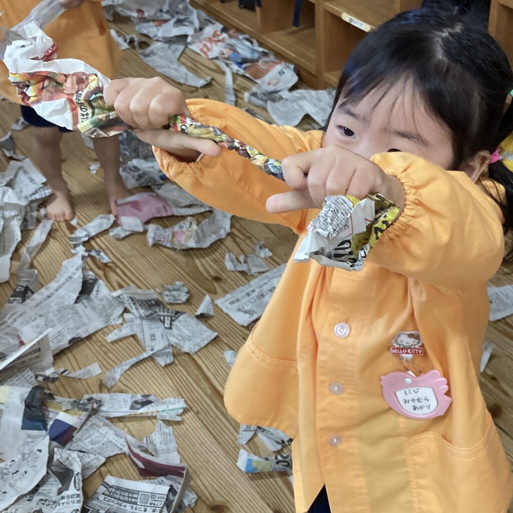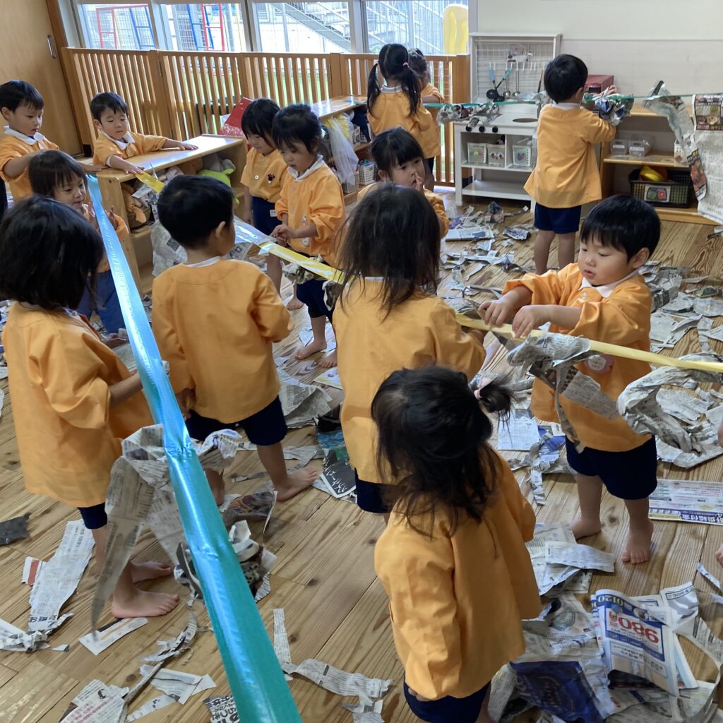 新聞紙を手で長くちぎってみたり、丸めて投げたりして、いろんな遊びを楽しんでいました。子どもたちは、ちぎった新聞紙をふわふわと空に投げるのが大好きで、みんなで「わ〜!」と声をあげて喜んでいました。また、保育者が新聞紙を持って、子どもたちに“グーパンチで穴を開けてみよう!”と言うと、みんな元気にグーパンチして、新聞紙に穴を開け、「もう一回して!」と何度も楽しんでいました。その後、保育者が長いテープを用意して、新聞紙をペタペタくっつけていく遊びが始まりました。貼り方にも個性がたくさんで、みんなでひとつの大きな新聞紙作品ができました。