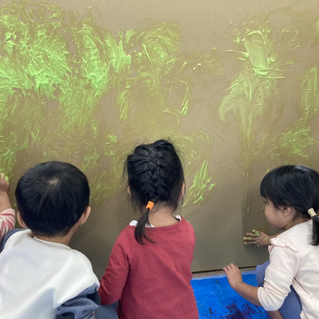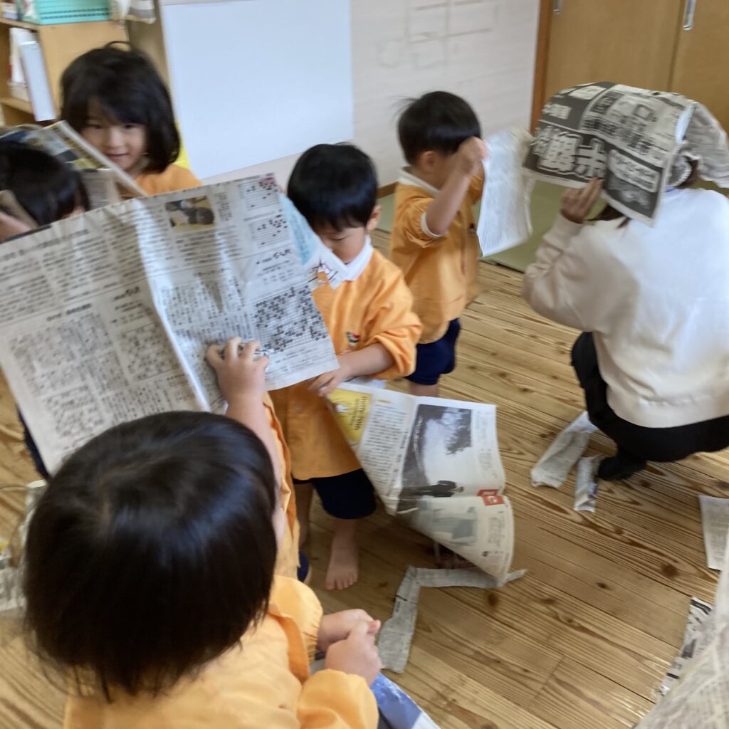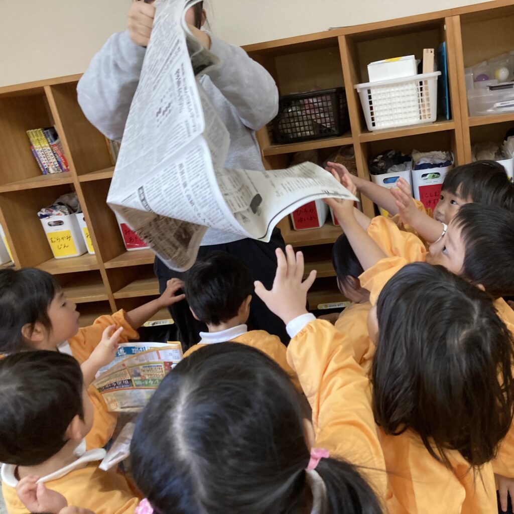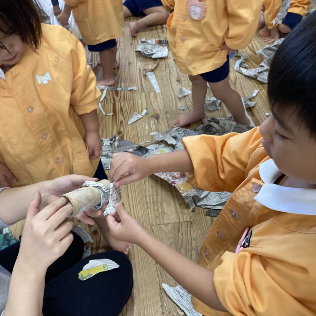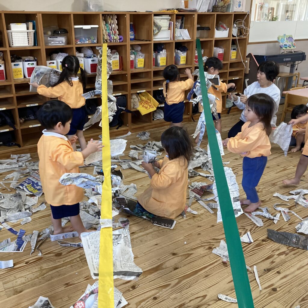 新聞紙を手で長くちぎってみたり、丸めて投げたりして、いろんな遊びを楽しんでいました。子どもたちは、ちぎった新聞紙をふわふわと空に投げるのが大好きで、みんなで「わ〜!」と声をあげて喜んでいました。また、保育者が新聞紙を持って、子どもたちに“グーパンチで穴を開けてみよう!”と言うと、みんな元気にグーパンチして、新聞紙に穴を開け、「もう一回して!」と何度も楽しんでいました。その後、保育者が長いテープを用意して、新聞紙をペタペタくっつけていく遊びが始まりました。貼り方にも個性がたくさんで、みんなでひとつの大きな新聞紙作品ができました。