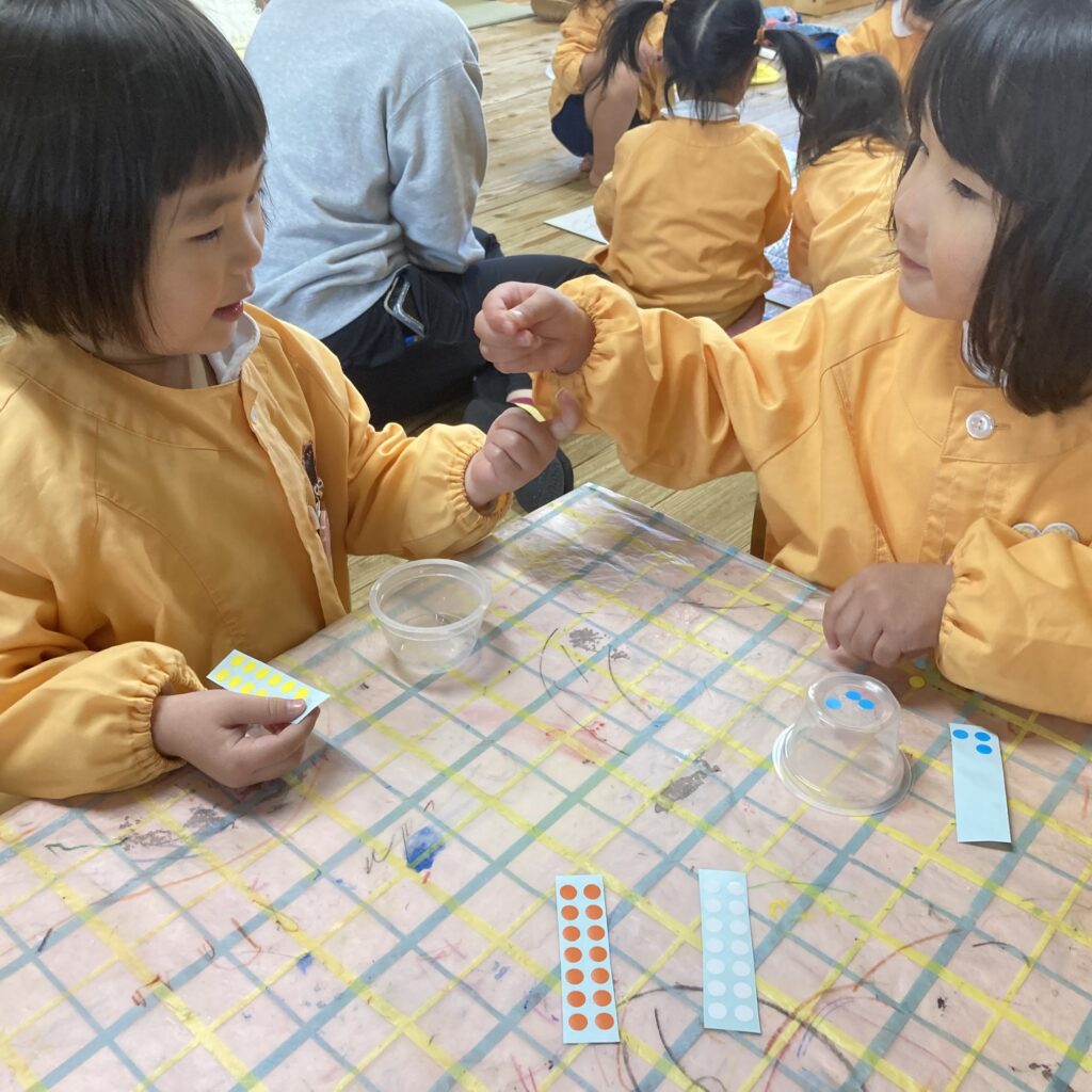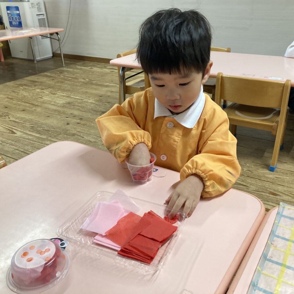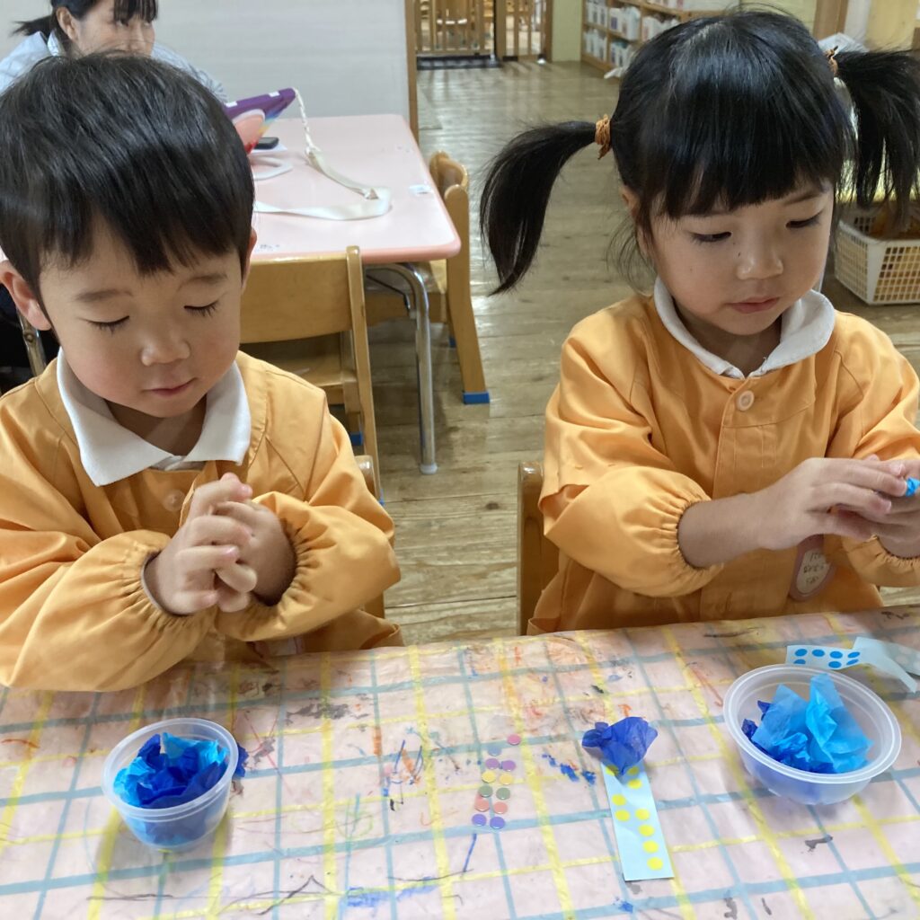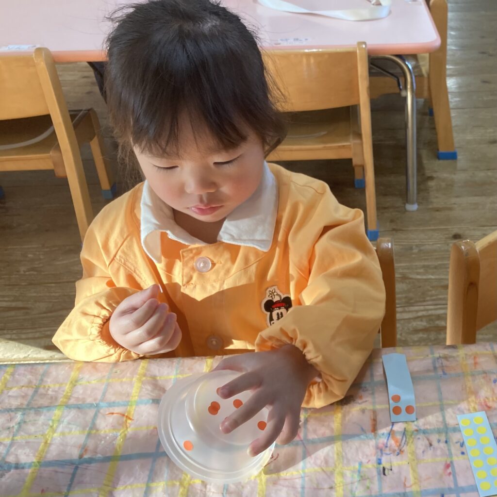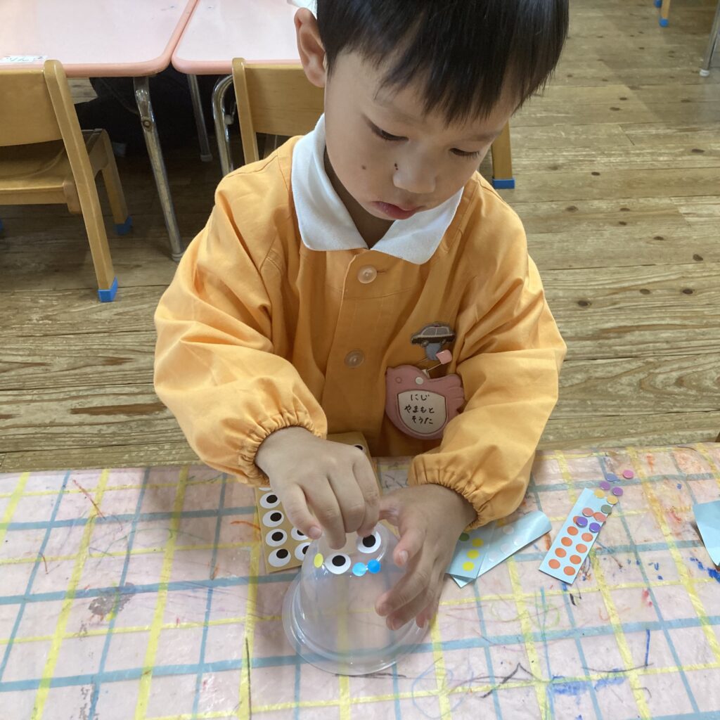 プリンカップやゼリーカップにお花紙を丸めて入れ、シール貼りをしました。お花紙やシールは指先を使った細かい作業となるので、みんな集中して取り組んでいました。お花紙は丸める力加減で大きさが変わるので、自分で調節しながら丸めていました。また、シールはどこにどうやって貼ろうか考えながら貼っていて、それぞれのてんとう虫が完成しました。