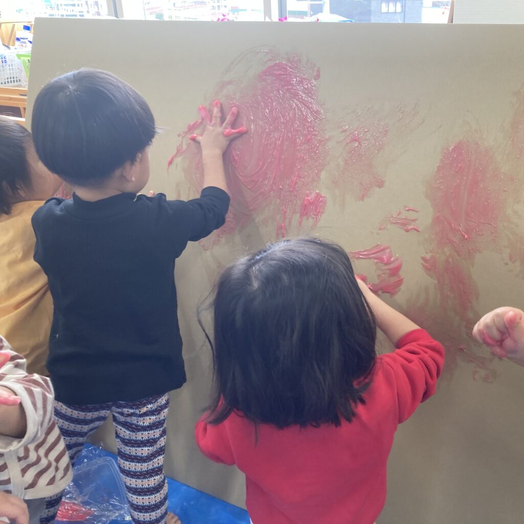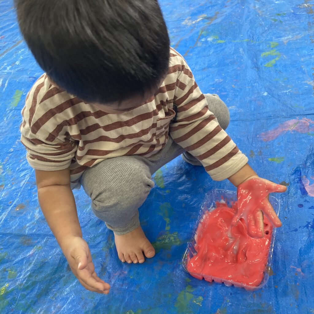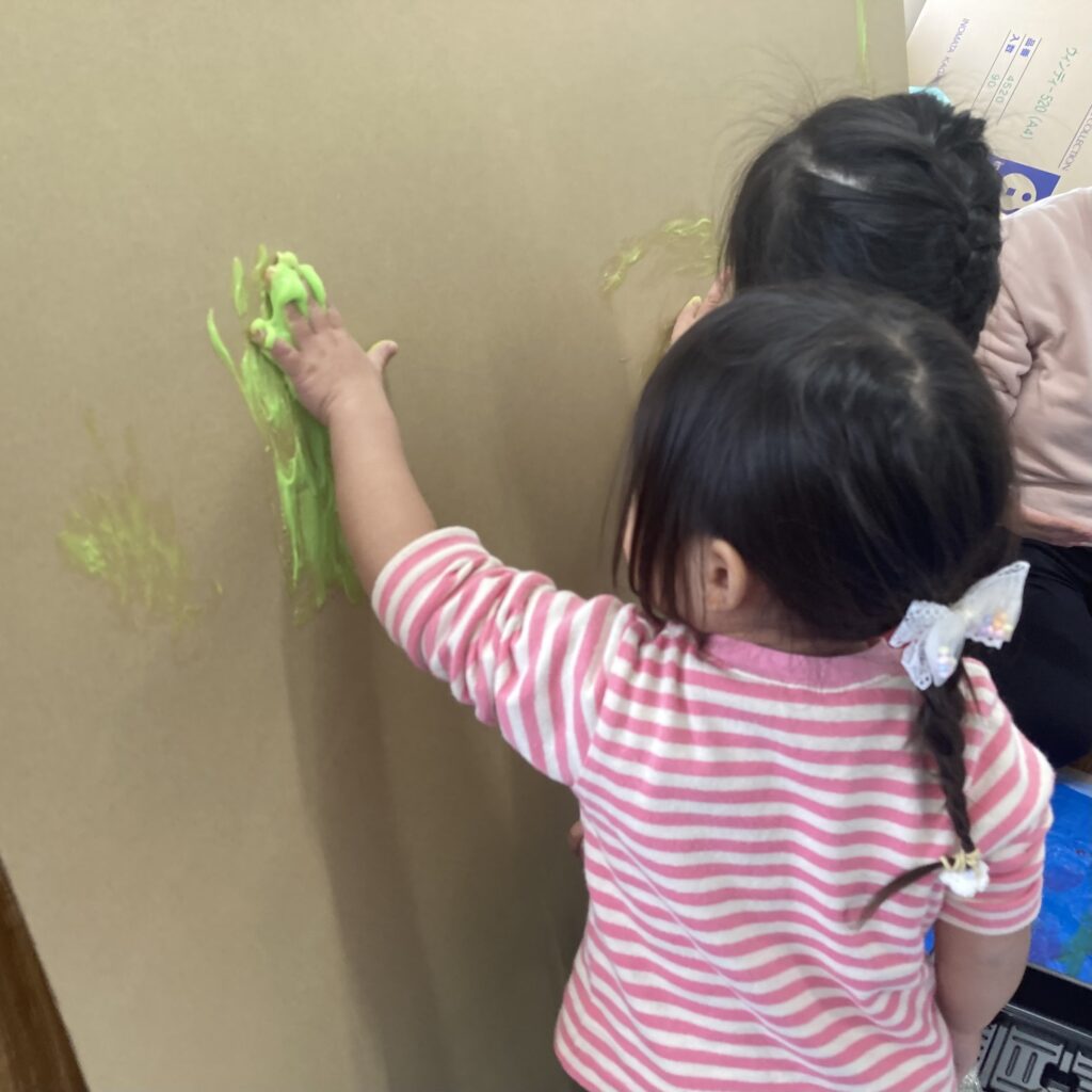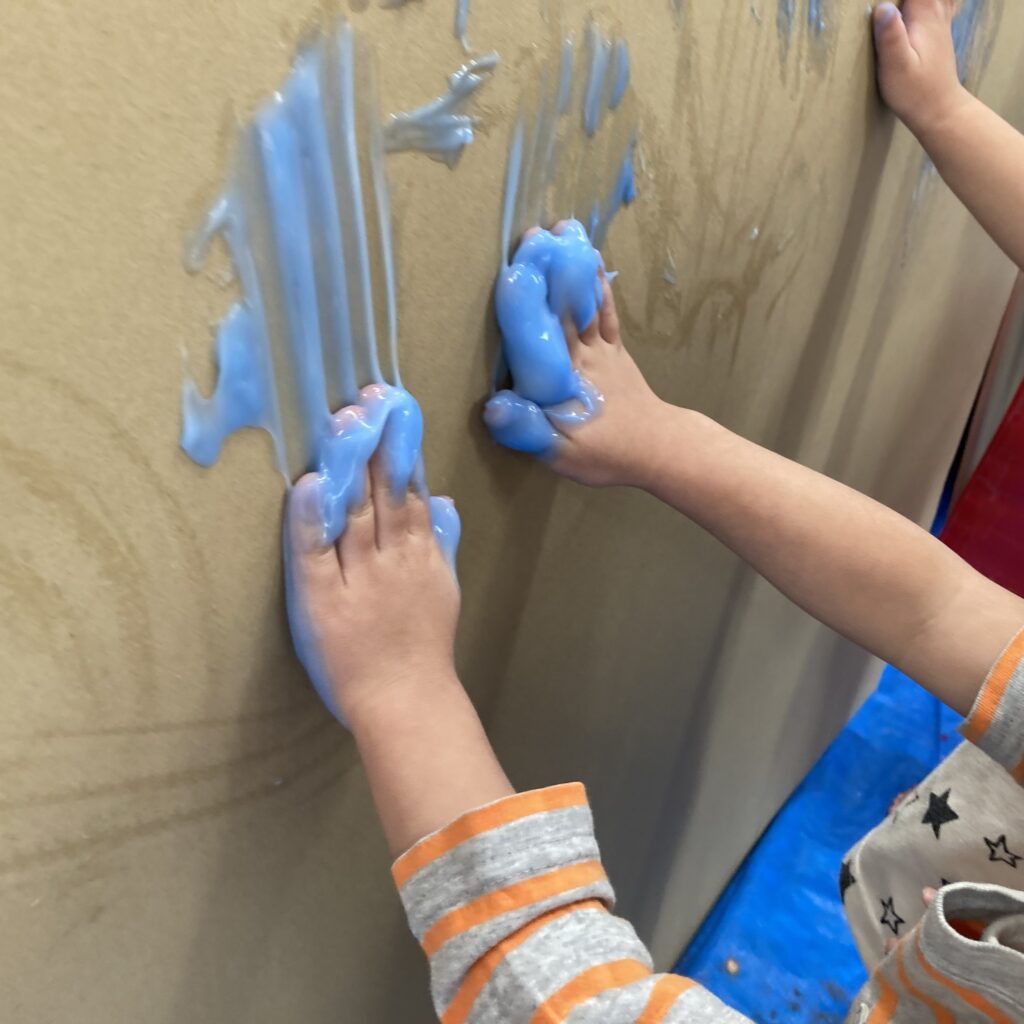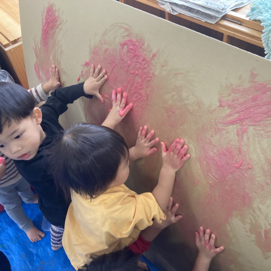 色分けをした後は、大きな段ボールにのりを使って貼りました。のりの感触にも少しずつ慣れ、手のひらを使って色のついたのりを広げることを楽しむ姿が見られました。色への興味も広がっています。