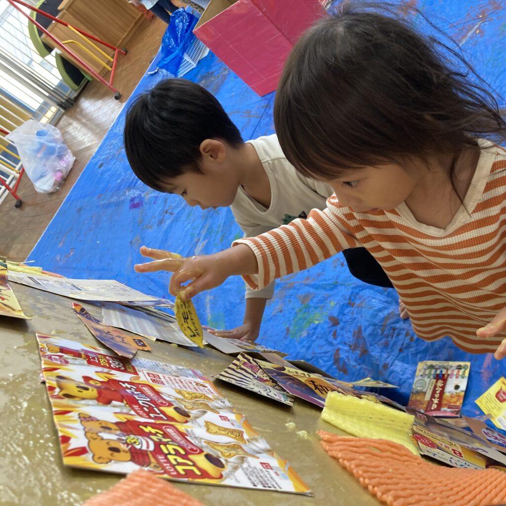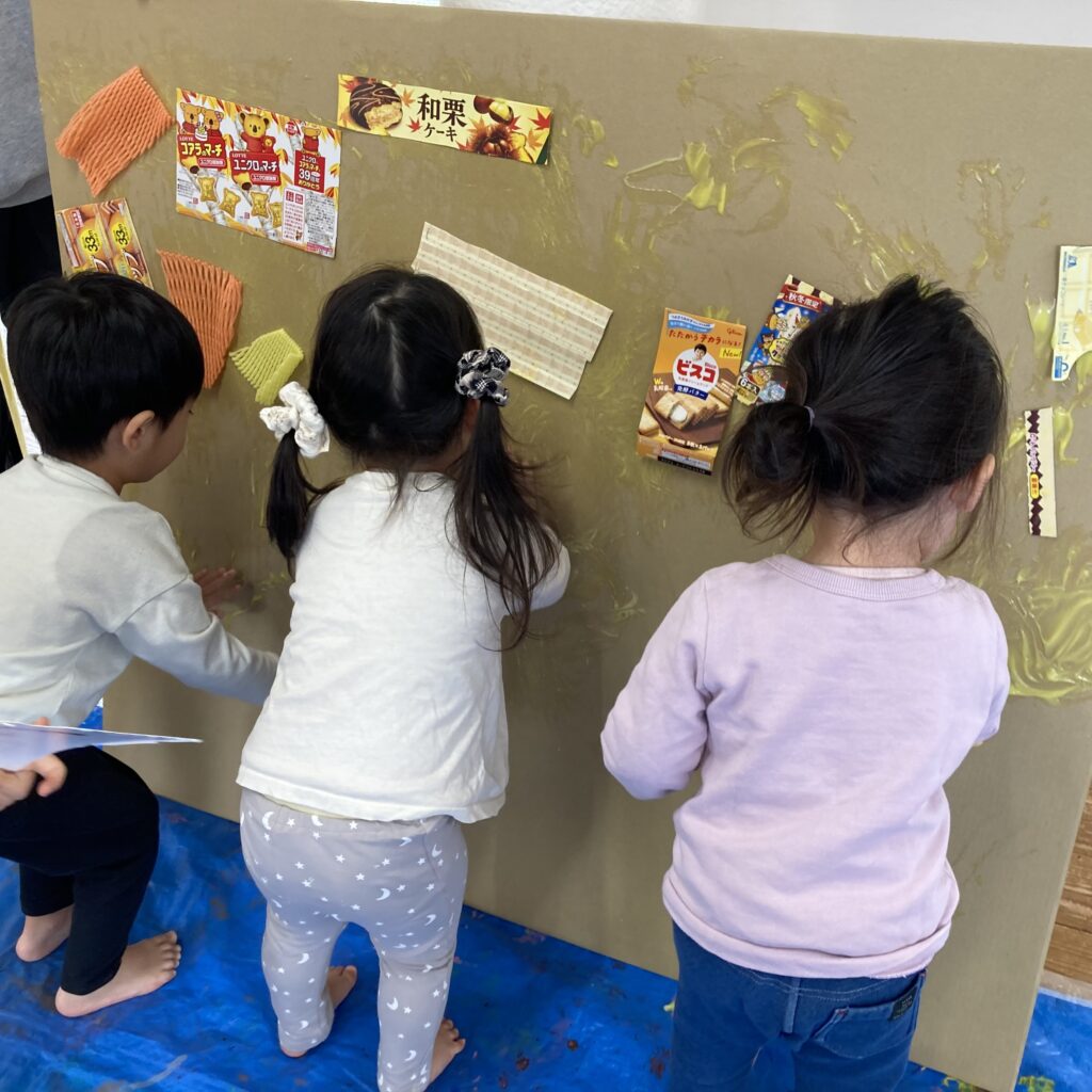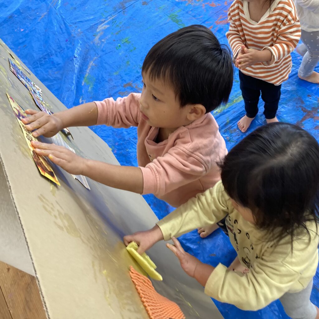何日かじっくりと遊び、最後は色付きのボンドでくっつけていくことにしました。ボンドでくっつくことに面白さを感じ、夢中になってどんどん貼り付けていた子ども達。「こうしたい」という思いを形にできるようになった姿に成長を感じます。「できた!」の気持ちが詰まった素敵な作品となりました。