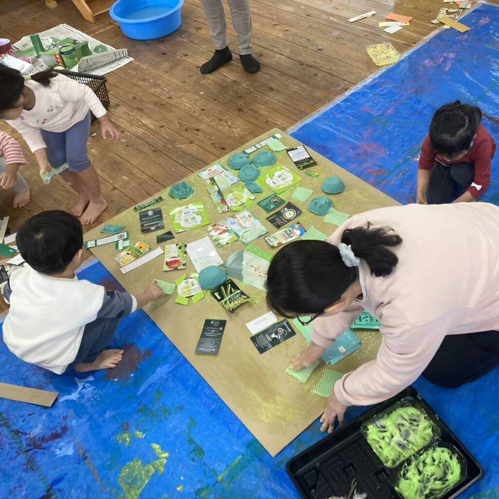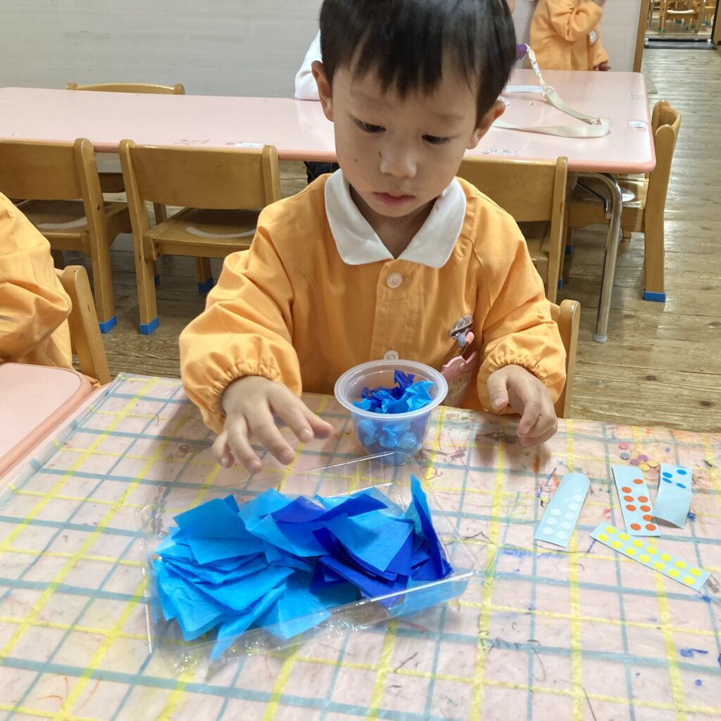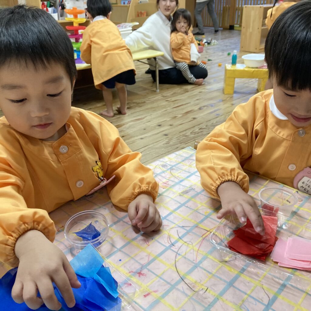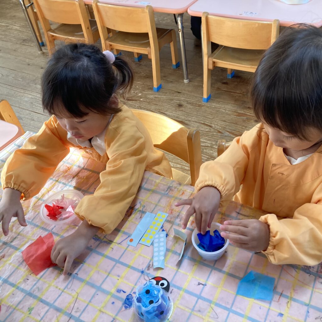 何日かじっくりと遊び、最後は色付きのボンドでくっつけていくことにしました。ボンドでくっつくことに面白さを感じ、夢中になってどんどん貼り付けていた子ども達。「こうしたい」という思いを形にできるようになった姿に成長を感じます。「できた!」の気持ちが詰まった素敵な作品となりました。