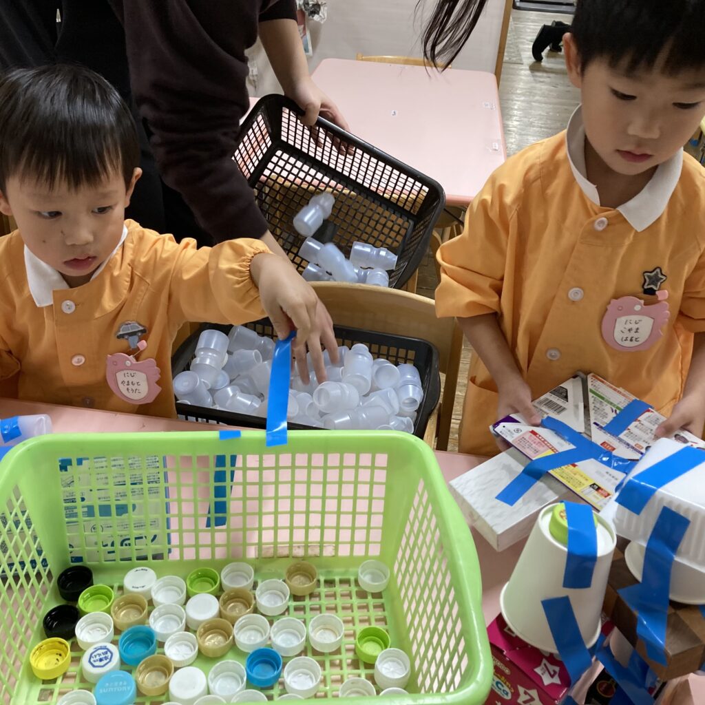 まずは廃材の箱やヤクルト容器、ボトルキャップなど、身近な素材を使って遊び始めました。子どもたちは、机いっぱいに広がる箱や容器を手に取りながら、「どうやって積もうかな?」と考えたり、「これはロケットにしよう!」とイメージを膨らませたりして、思い思いに楽しんでいました。