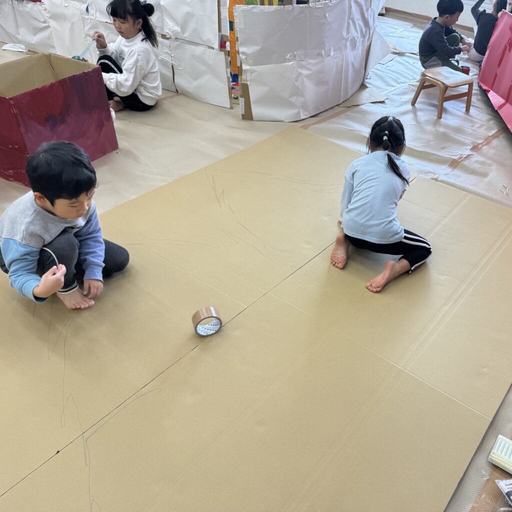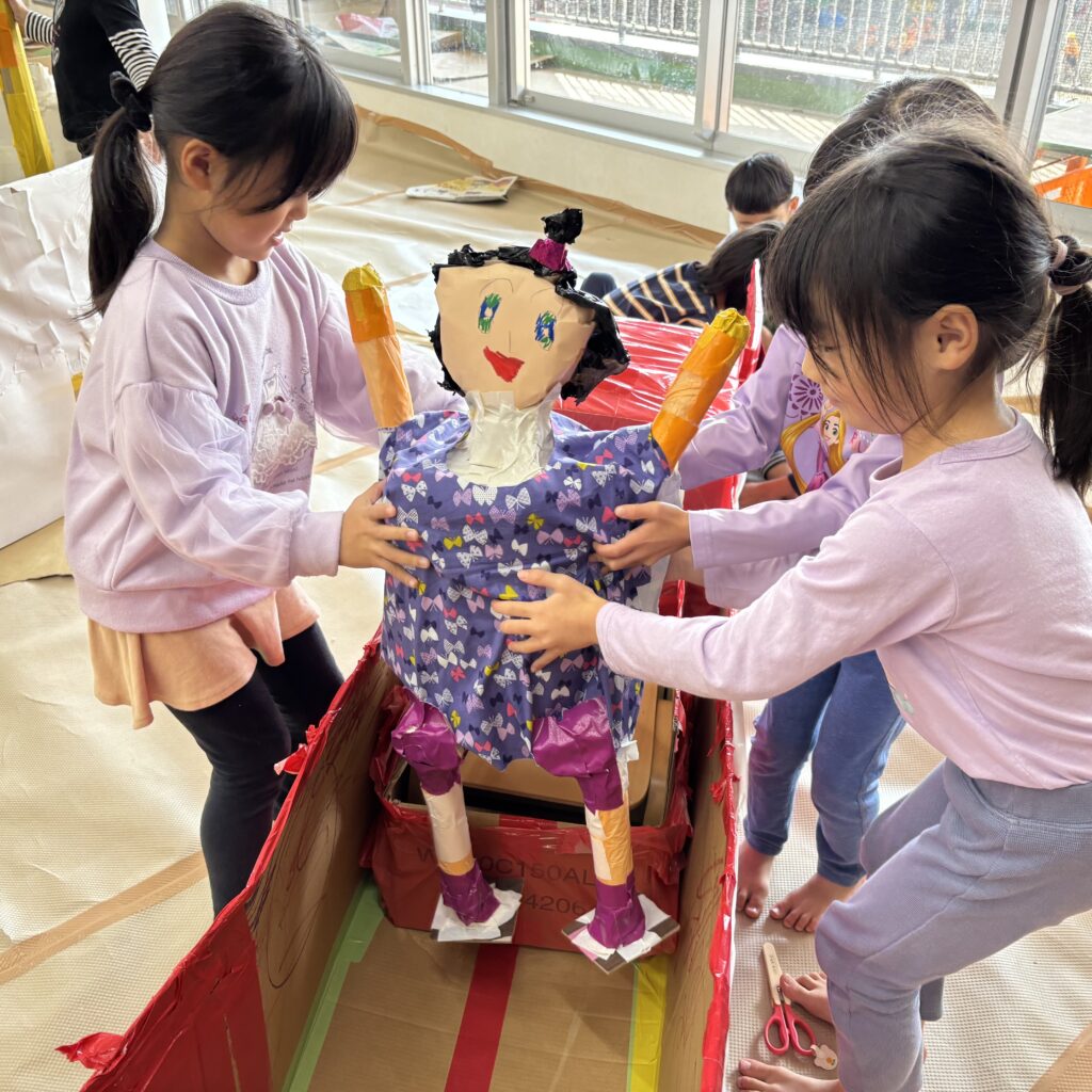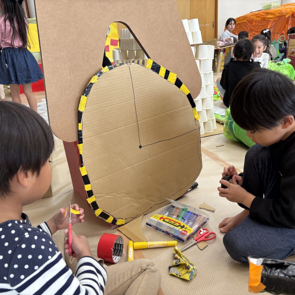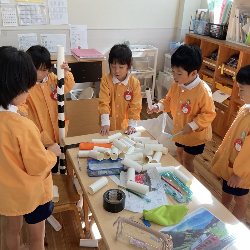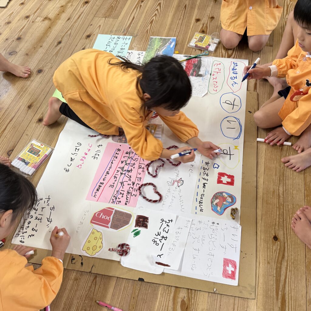 絵本などでいろいろ調べていくと「この大きい山作りたい!」「山の近くにピラトゥス鉄道走らせたい!」とみんなで話し合い、マッターホルン•ピラトゥス鉄道•時計の塔•アルプス少女ハイジ•チョコレート•チーズを作るとにしました。難しいこと、悩んだこともありましたが、その都度友達と話し合い、協力して作り上げてきました。また、時計の色や電車のハンドルや汽笛の音、ハイジの足や服など細かいところまでこだわって取り組んできましたので是非スイスの世界を楽しんでほしいと思います♪