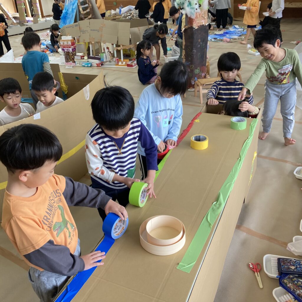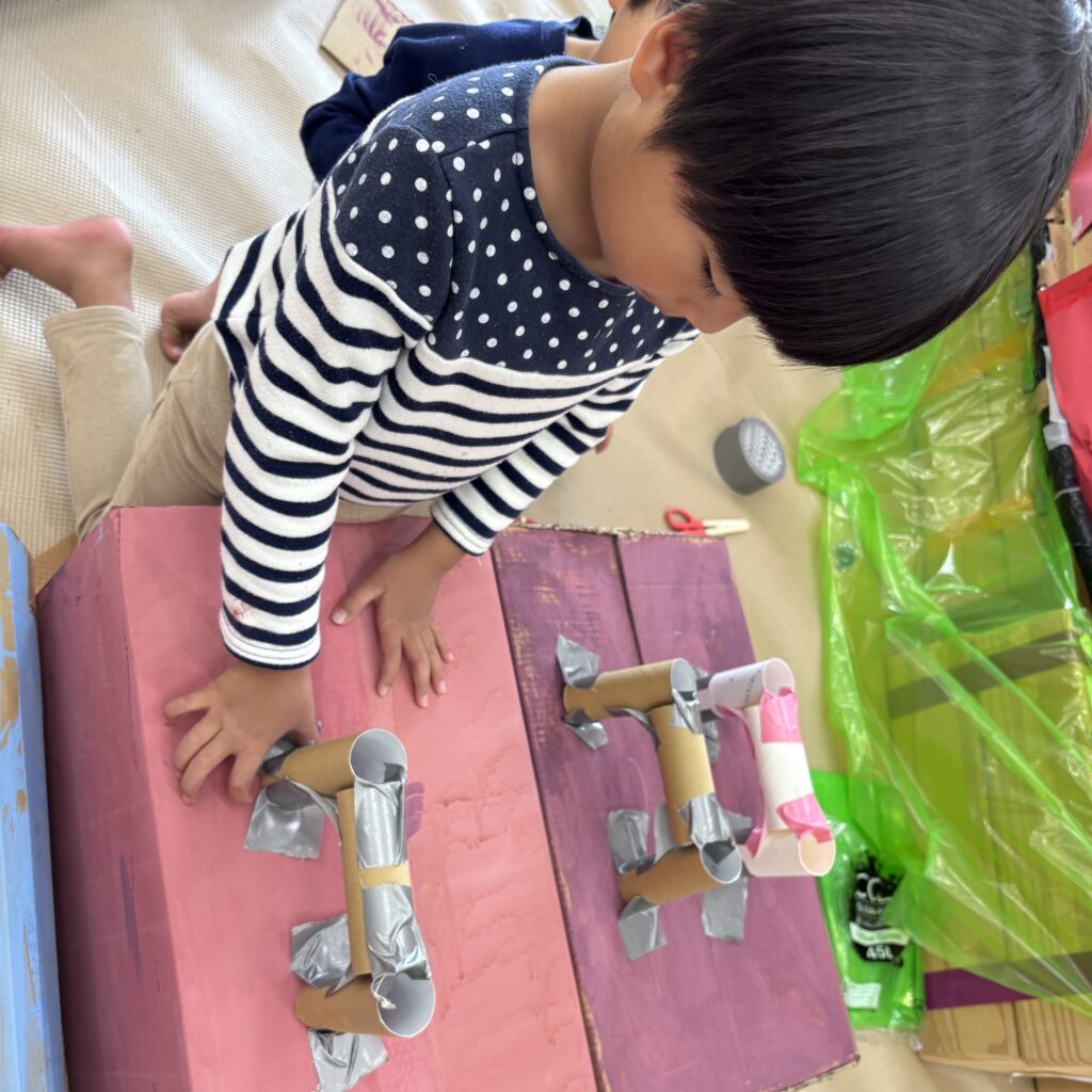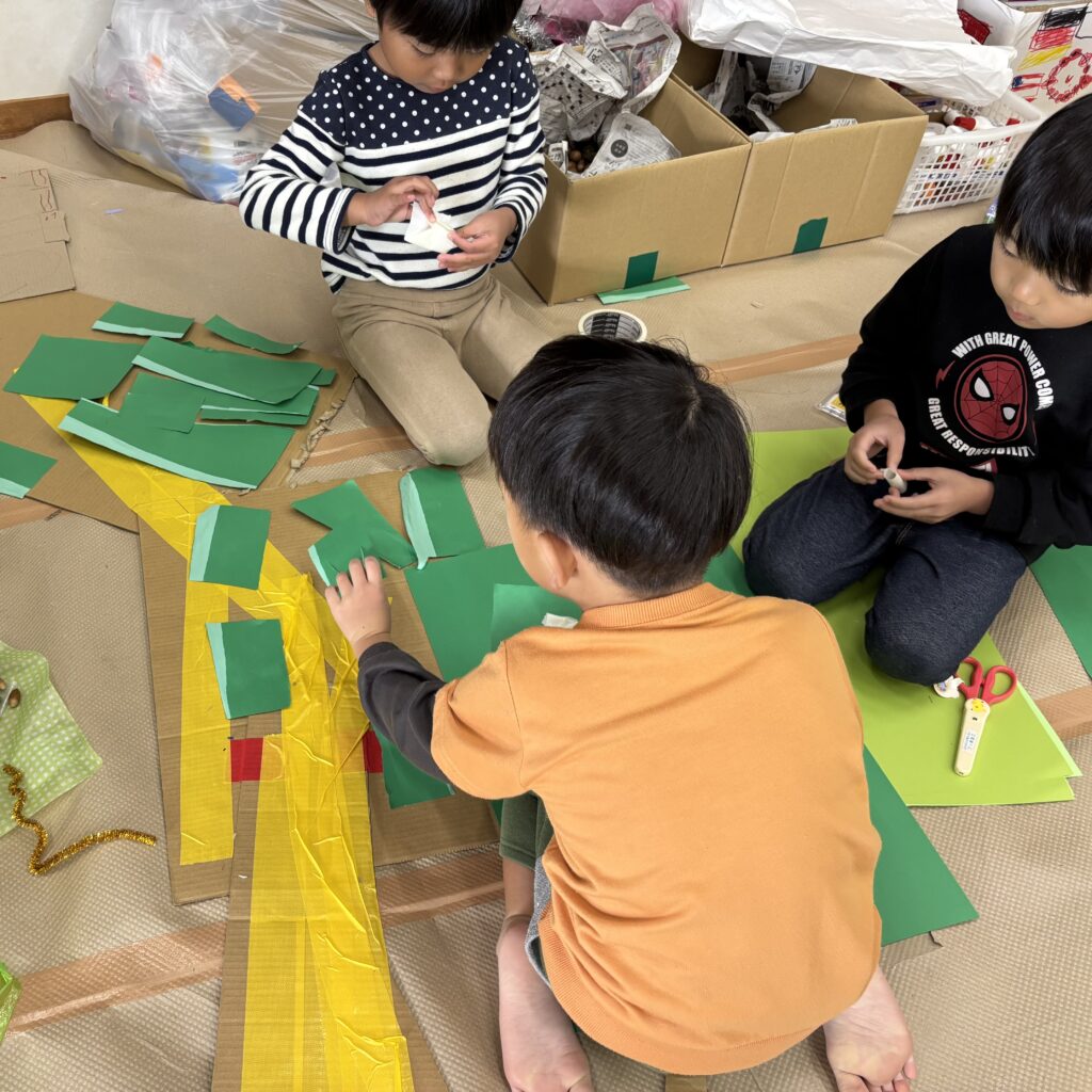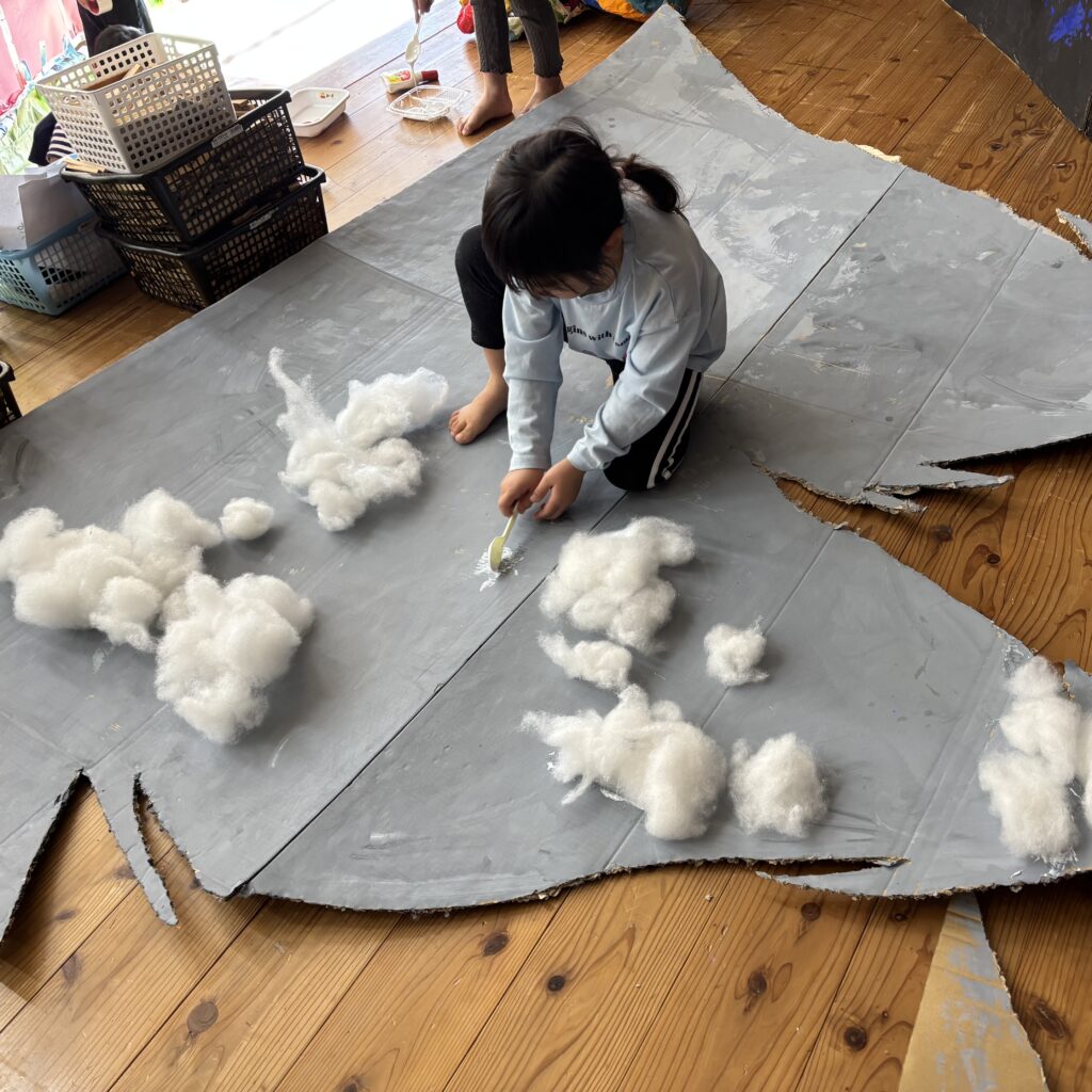 絵本などでいろいろ調べていくと「この大きい山作りたい!」「山の近くにピラトゥス鉄道走らせたい!」とみんなで話し合い、マッターホルン•ピラトゥス鉄道•時計の塔•アルプス少女ハイジ•チョコレート•チーズを作るとにしました。難しいこと、悩んだこともありましたが、その都度友達と話し合い、協力して作り上げてきました。また、時計の色や電車のハンドルや汽笛の音、ハイジの足や服など細かいところまでこだわって取り組んできましたので是非スイスの世界を楽しんでほしいと思います♪