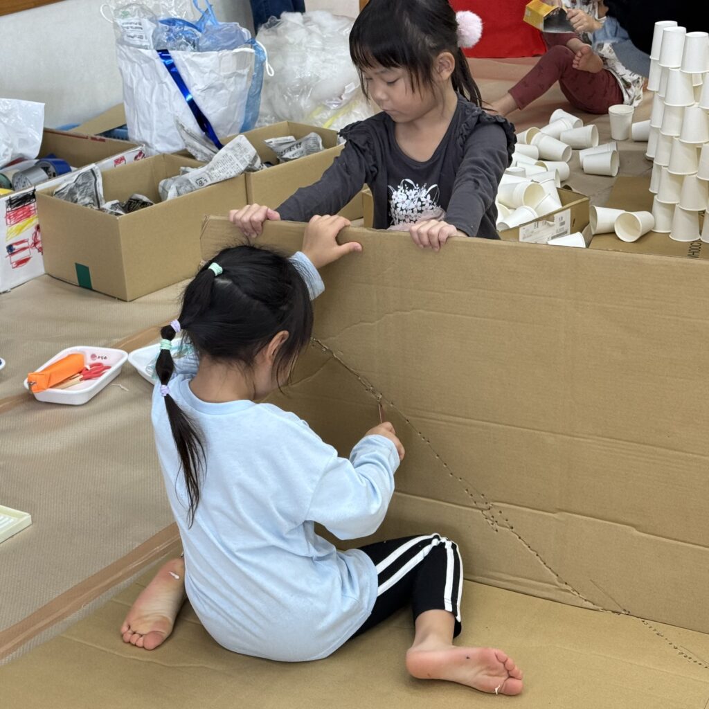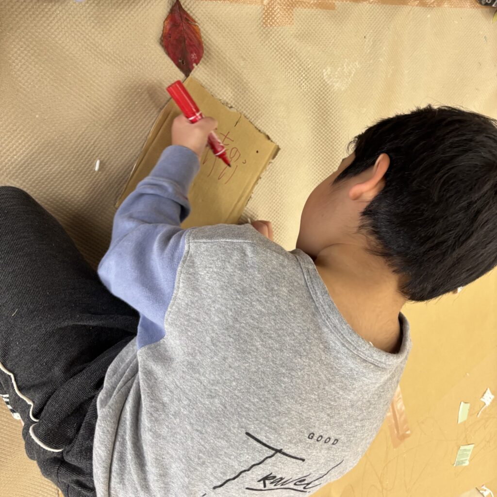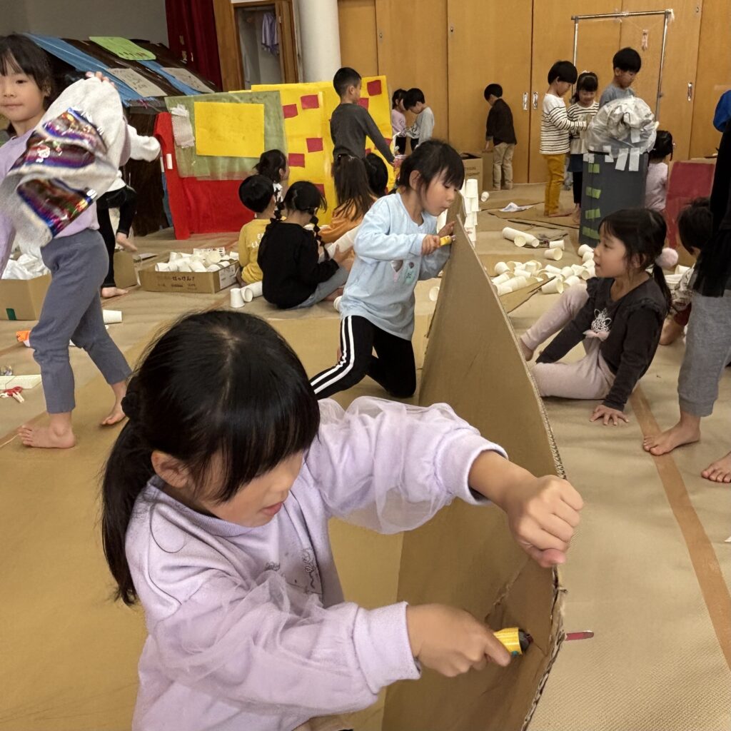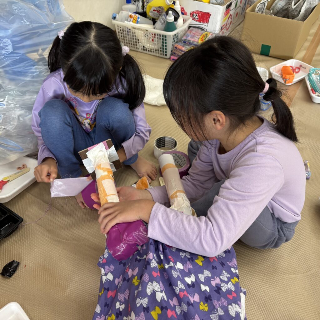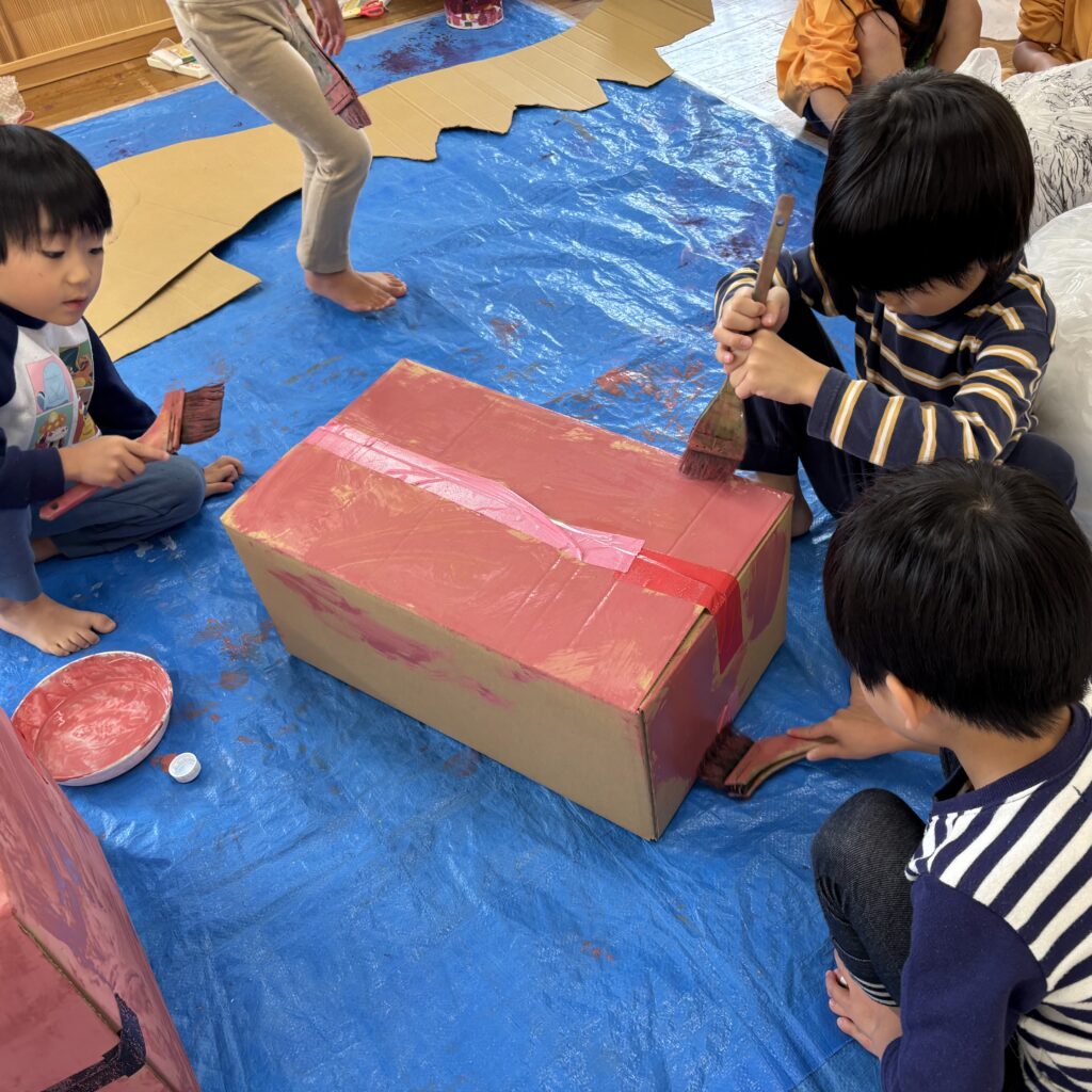 絵本などでいろいろ調べていくと「この大きい山作りたい!」「山の近くにピラトゥス鉄道走らせたい!」とみんなで話し合い、マッターホルン•ピラトゥス鉄道•時計の塔•アルプス少女ハイジ•チョコレート•チーズを作るとにしました。難しいこと、悩んだこともありましたが、その都度友達と話し合い、協力して作り上げてきました。また、時計の色や電車のハンドルや汽笛の音、ハイジの足や服など細かいところまでこだわって取り組んできましたので是非スイスの世界を楽しんでほしいと思います♪