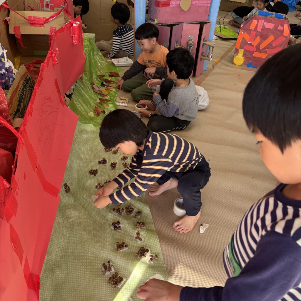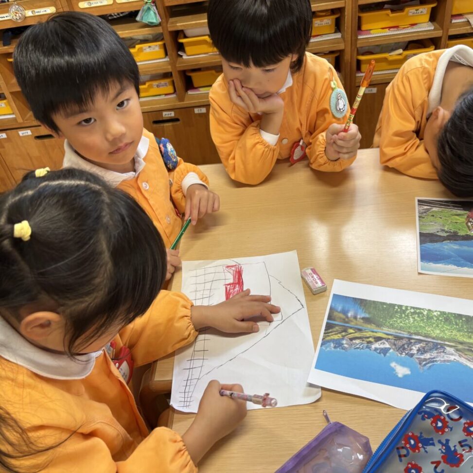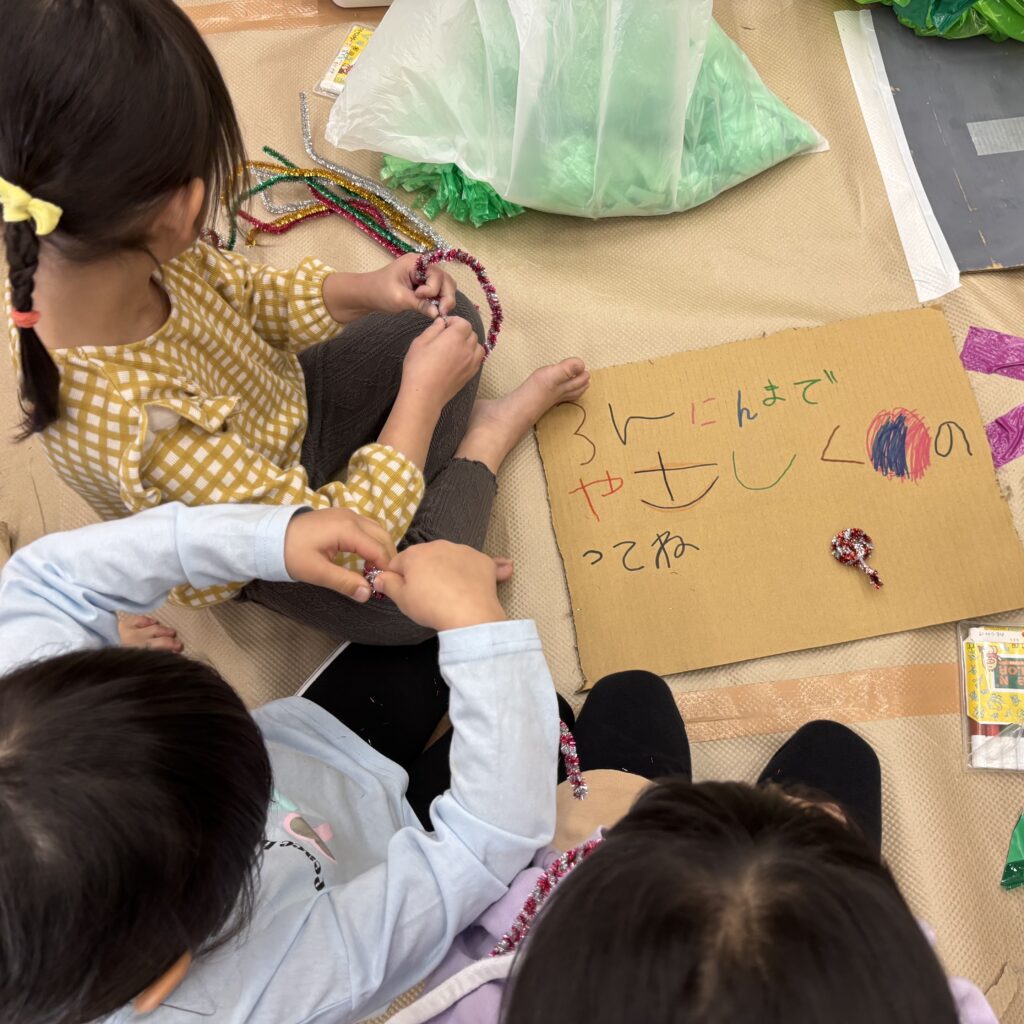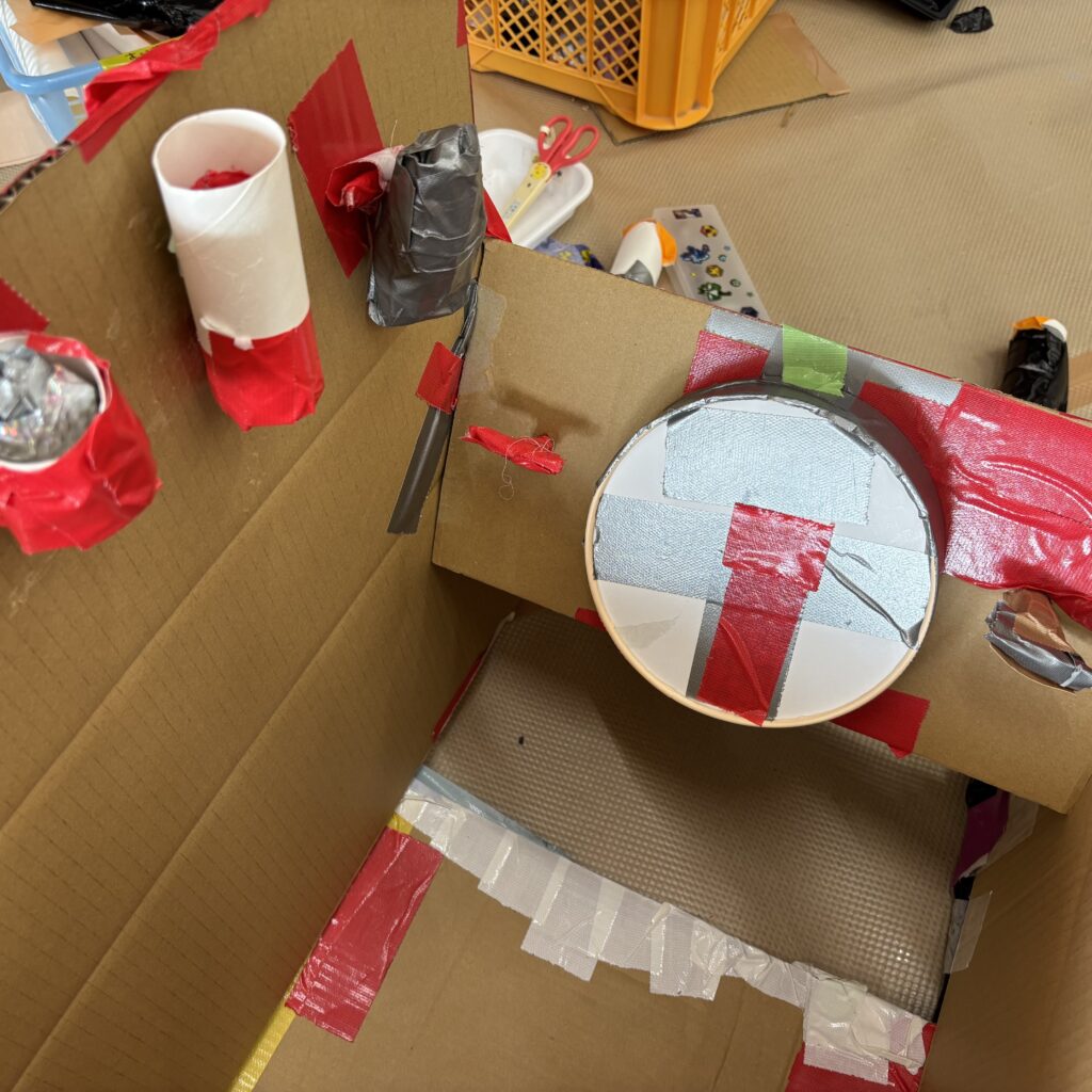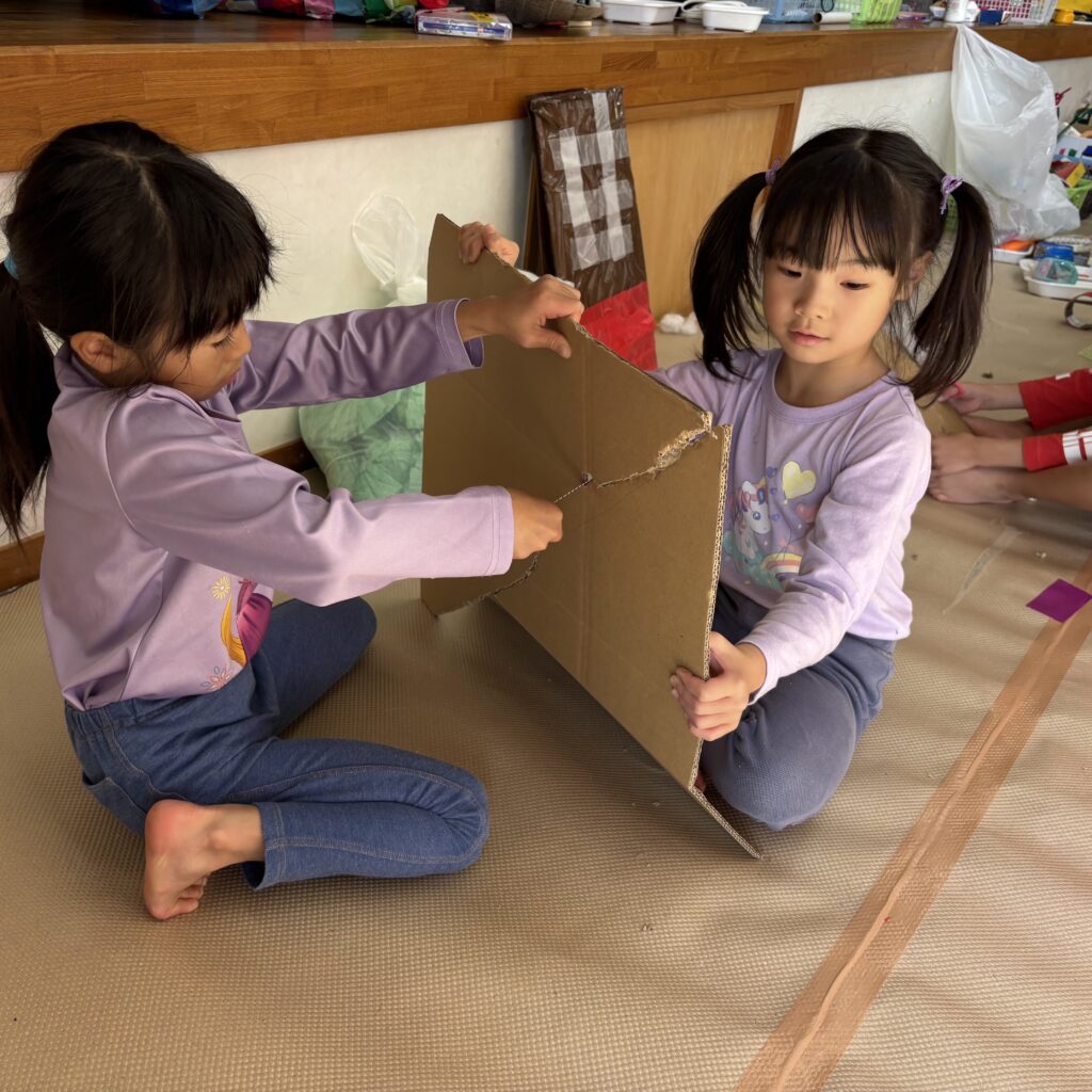 絵本などでいろいろ調べていくと「この大きい山作りたい!」「山の近くにピラトゥス鉄道走らせたい!」とみんなで話し合い、マッターホルン•ピラトゥス鉄道•時計の塔•アルプス少女ハイジ•チョコレート•チーズを作るとにしました。難しいこと、悩んだこともありましたが、その都度友達と話し合い、協力して作り上げてきました。また、時計の色や電車のハンドルや汽笛の音、ハイジの足や服など細かいところまでこだわって取り組んできましたので是非スイスの世界を楽しんでほしいと思います♪