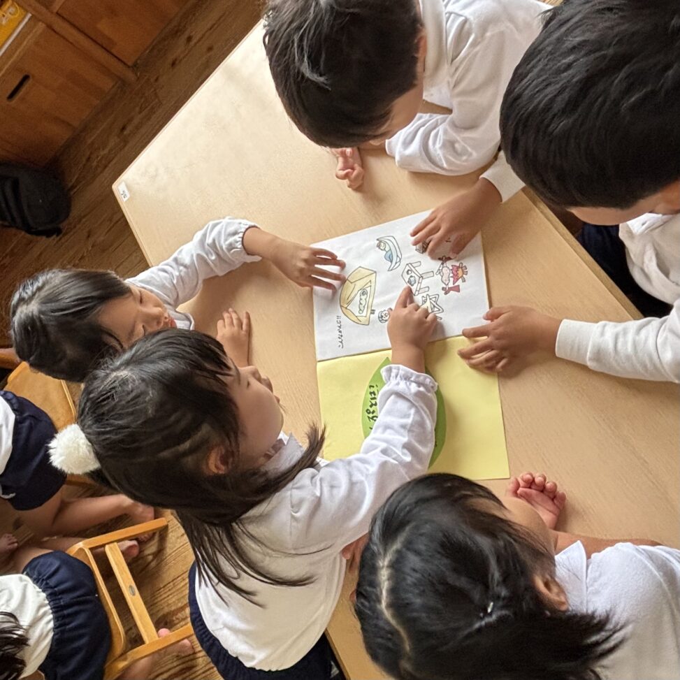 ぴょんぴょんかえるグループでは、みんなで話し合ってボートを作ることになりました。ダンボールでボートを作り、オールも作ろう!と設計図を描いて準備を進めます。作り始めると「みんなが乗れるようにしよう!」となり、名前を書いてそれぞれの専用の座る場所を作りました。