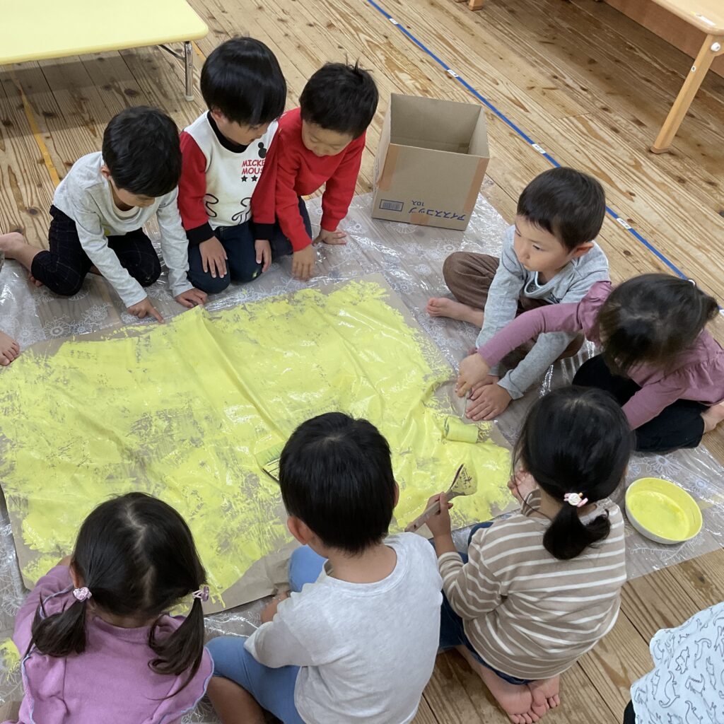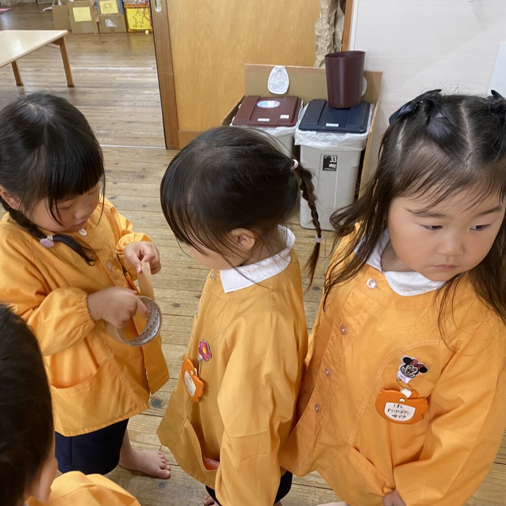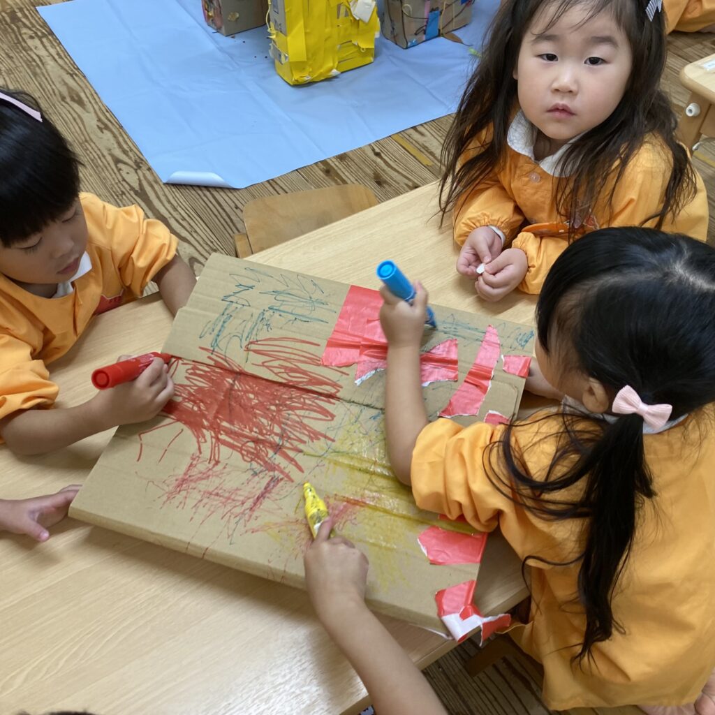 テープをちぎってお友だちに渡して、渡された子はテープを貼りに行ったりなど、子どもたちなりに協力し合いながら製作を楽しみました!子どもたちのアイディアがたくさん詰まったライオンを是非ご覧ください♪