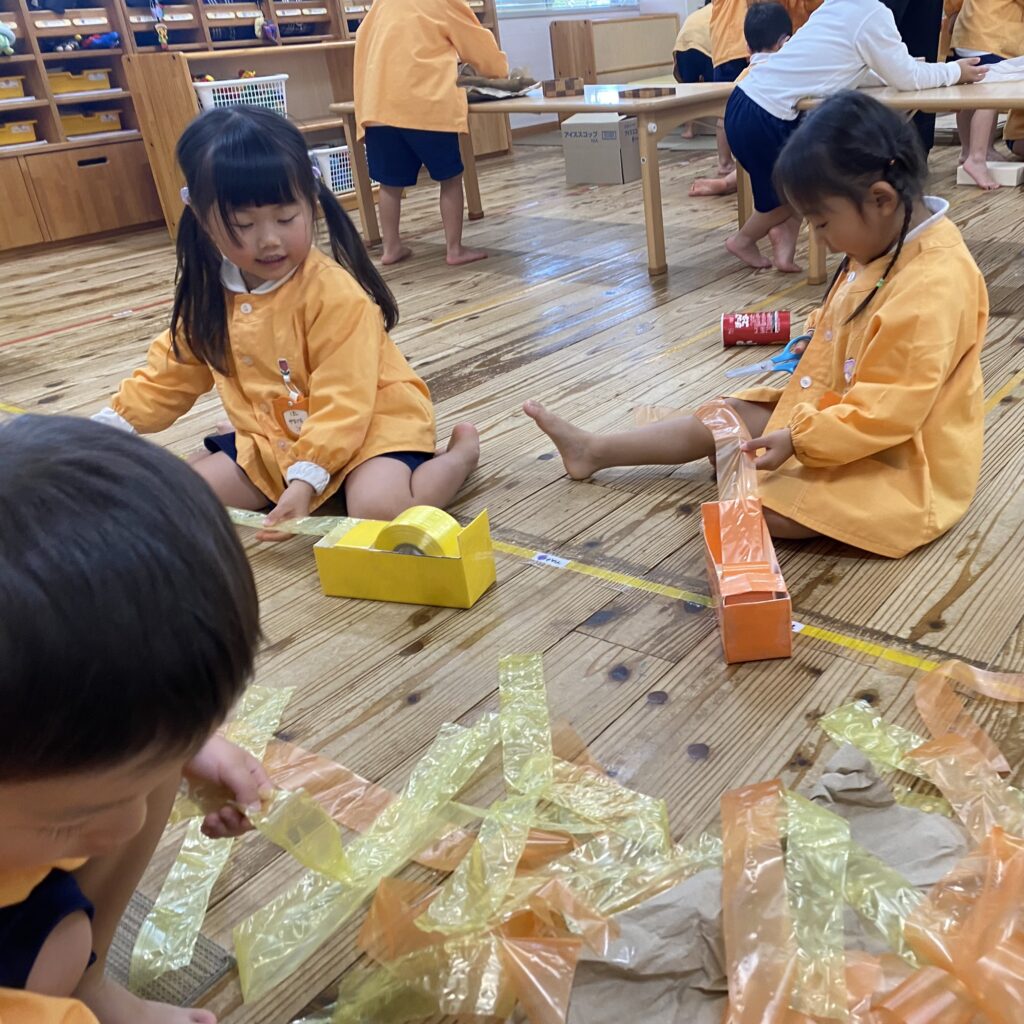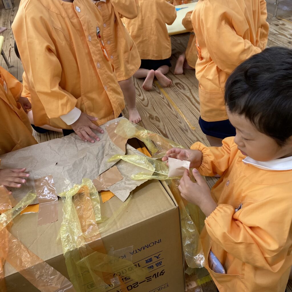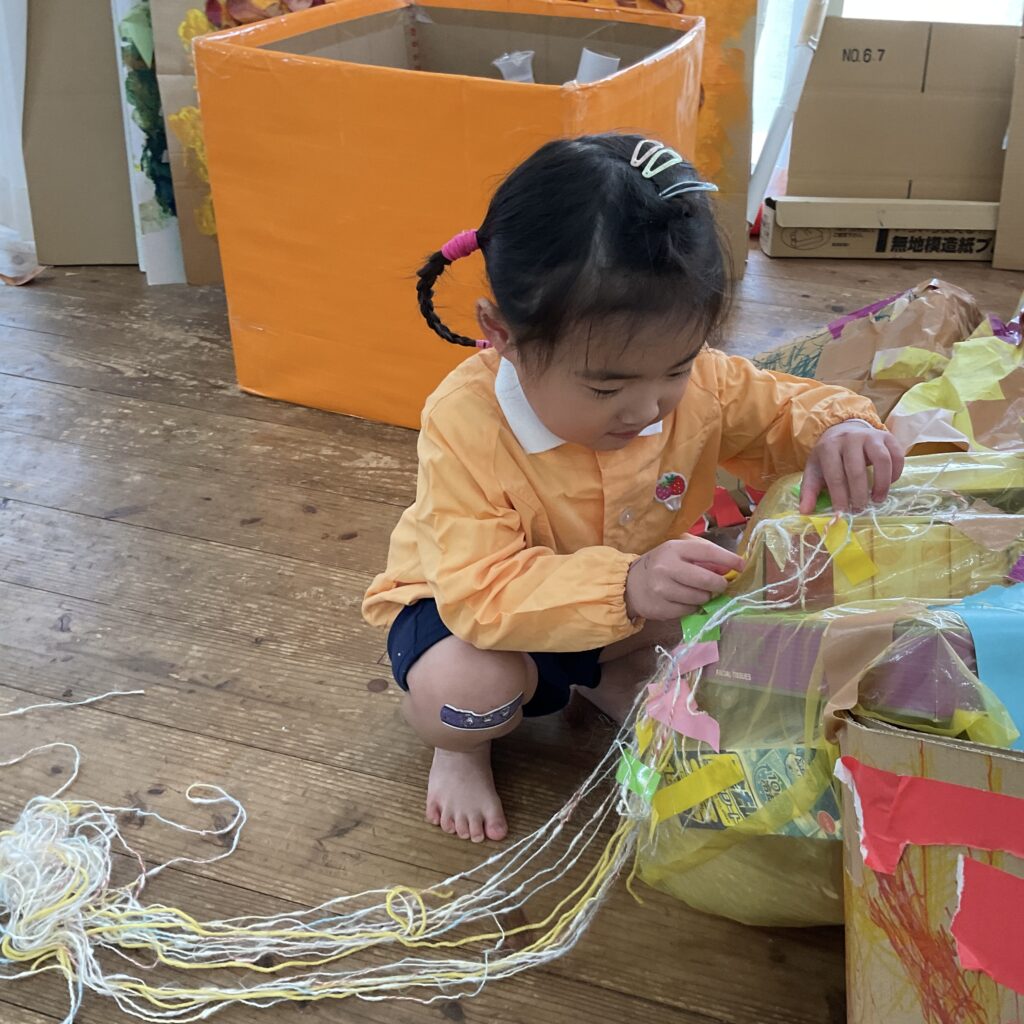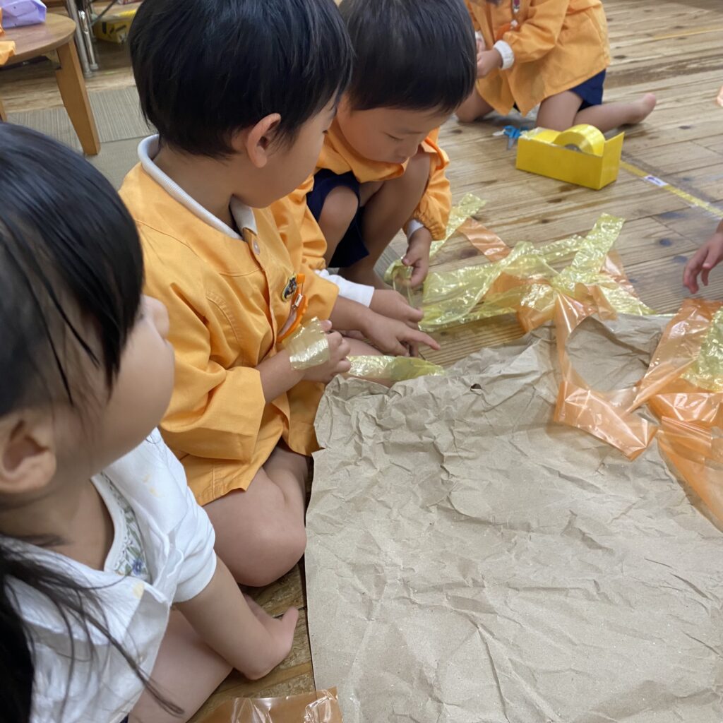 スズランテープをたてがみに見立てて大きな紙に貼るところから始めました。平面の部分から作り始めたので最初の方は立体になるイメージがつかない子もいましたが、廃材入りのポリ袋をつなぎ合わせたりして形が出来上がっていくにつれて「ライオンっぽくなってきた!」「もっとふくろのなかに箱(廃材)をいれたら大きくなるかも!」と少しずつ立体的なライオンを作るイメージを膨らませていきました。