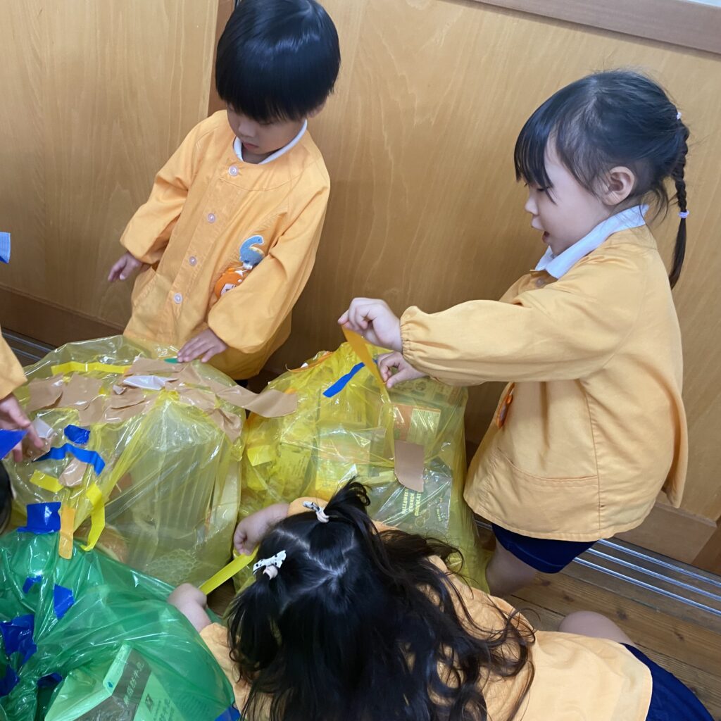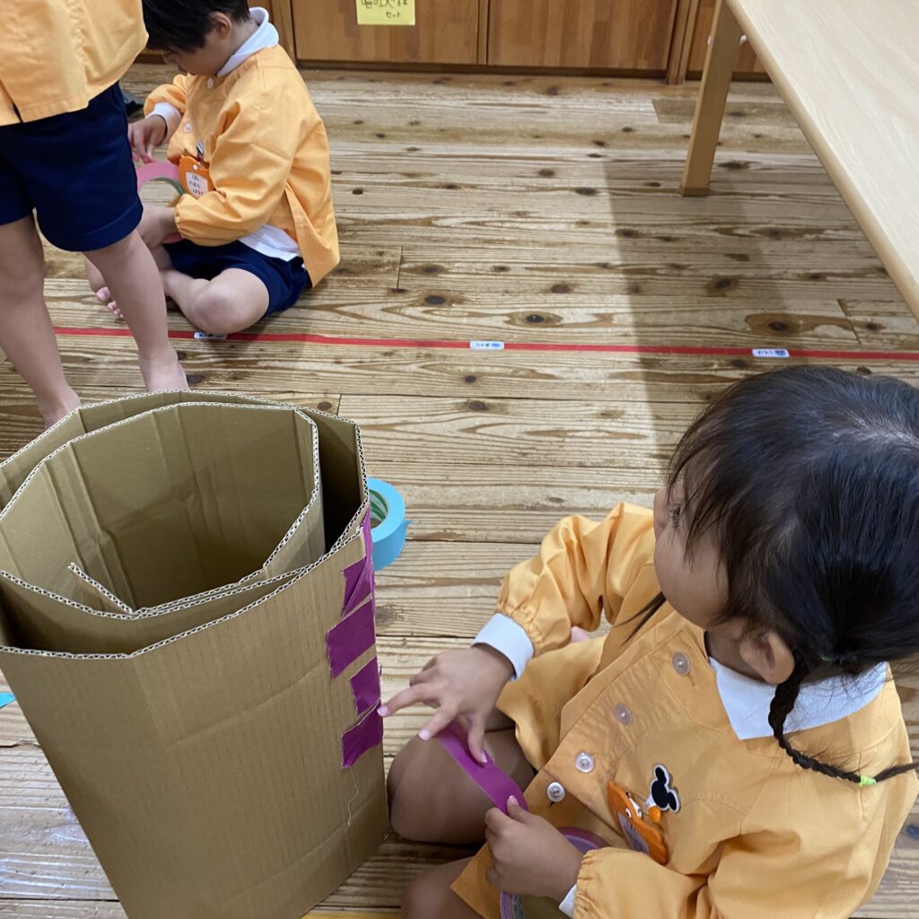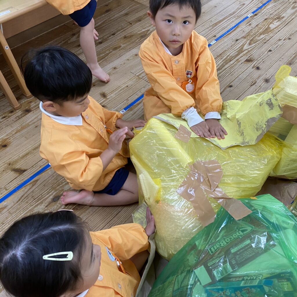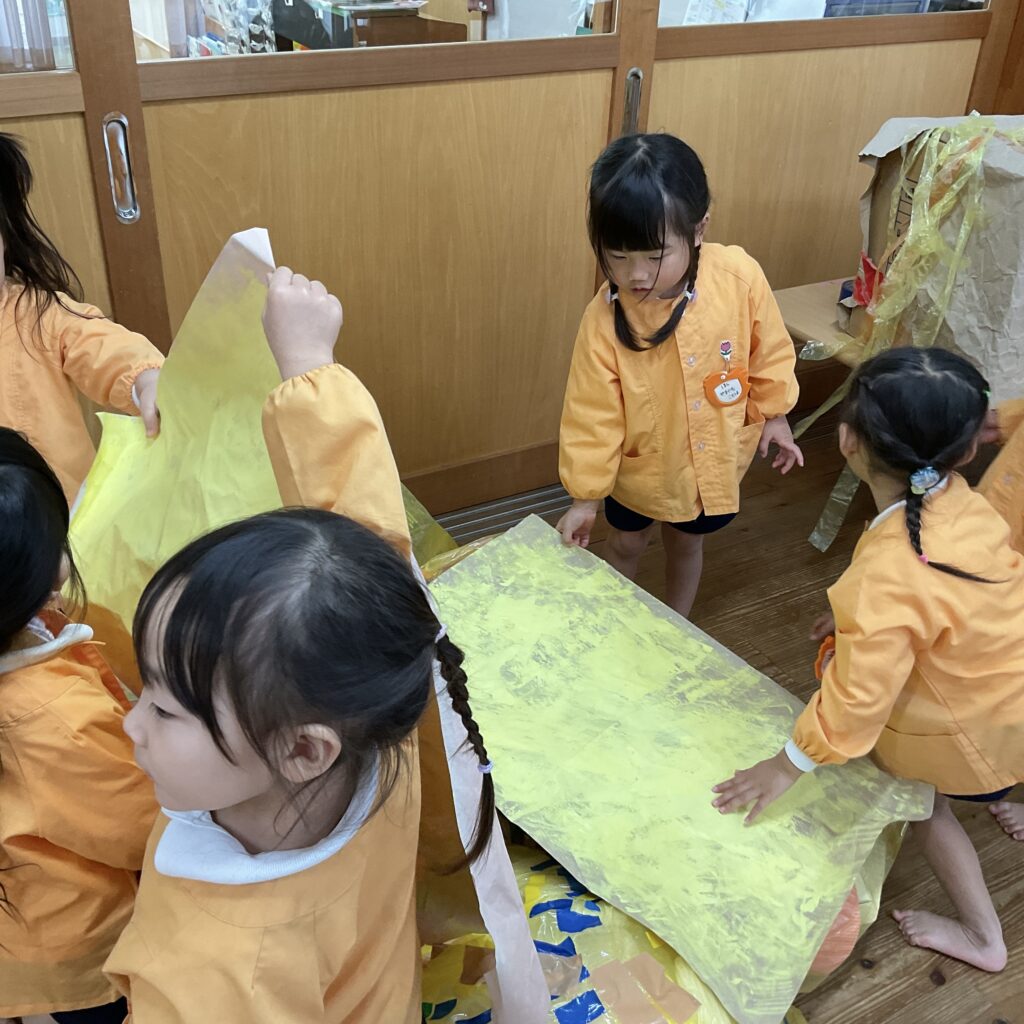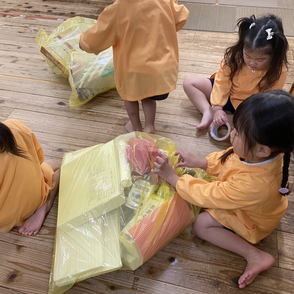 スズランテープをたてがみに見立てて大きな紙に貼るところから始めました。平面の部分から作り始めたので最初の方は立体になるイメージがつかない子もいましたが、廃材入りのポリ袋をつなぎ合わせたりして形が出来上がっていくにつれて「ライオンっぽくなってきた!」「もっとふくろのなかに箱(廃材)をいれたら大きくなるかも!」と少しずつ立体的なライオンを作るイメージを膨らませていきました。