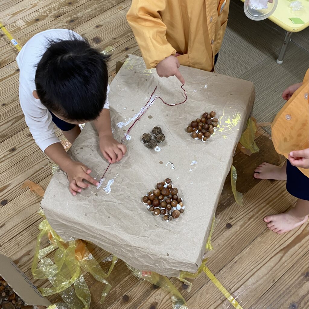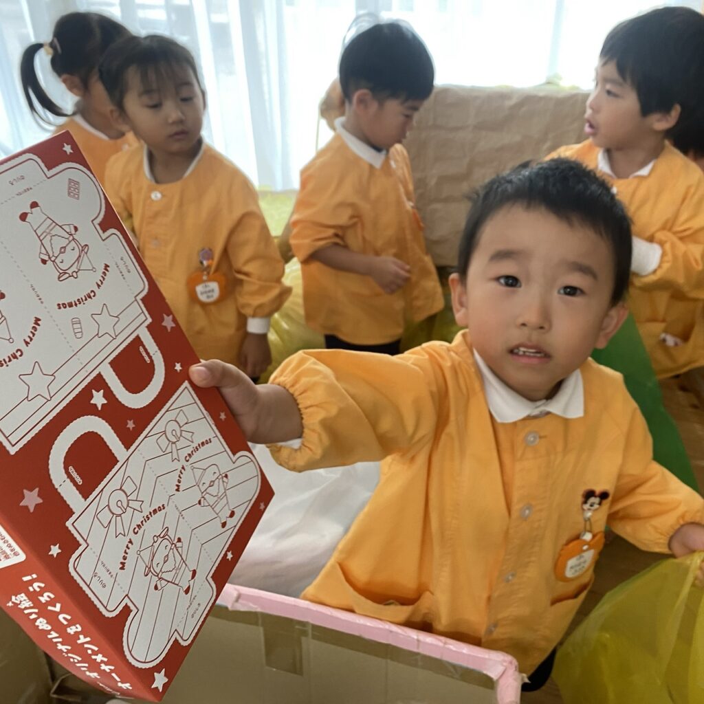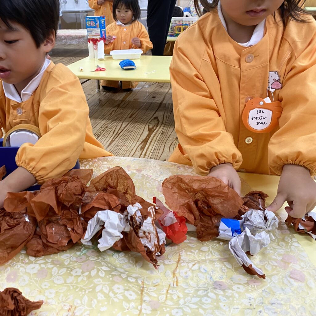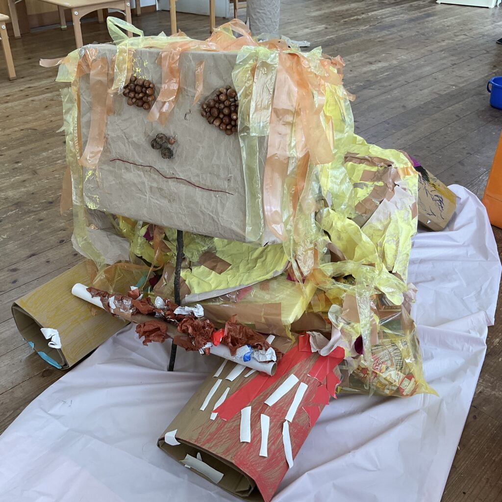 スズランテープをたてがみに見立てて大きな紙に貼るところから始めました。平面の部分から作り始めたので最初の方は立体になるイメージがつかない子もいましたが、廃材入りのポリ袋をつなぎ合わせたりして形が出来上がっていくにつれて「ライオンっぽくなってきた!」「もっとふくろのなかに箱(廃材)をいれたら大きくなるかも!」と少しずつ立体的なライオンを作るイメージを膨らませていきました。