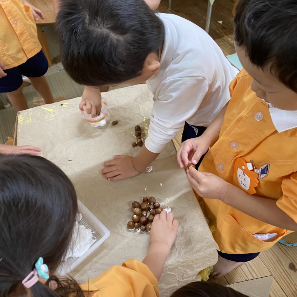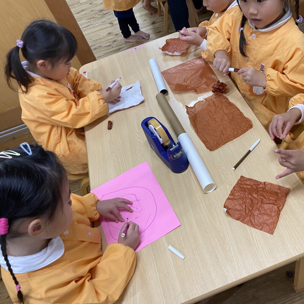年少組で読んでいる「トミーのぼうけん」、「おうちジャングル」の絵本が大好きな子どもたち。どんな動物を作りたいか聞くと、「えほんに出てくるライオンをつくりたい!」という意見が出てきました!他にもいろんな動物の候補がありましたが最終的に多数決で1番人気のライオンに決まりました!
