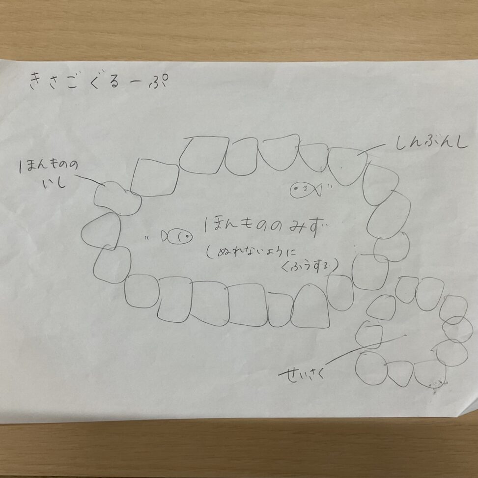 キャンプ場の中にある、大きな池をイメージして作ることにしました。話し合いのなかで、“10匹のかえるが遊びにきてくれるかも!?”…と、池の水は本物の水を使うことに。ダンボールが水に弱いことを知っていた子どもたちは、「水は入れ物に入れた方がいいなぁ」と材料の中から透明のカップを探し出し、水を入れました。「かえるさん来てくれたらいいなぁ」ととても楽しみにしています。