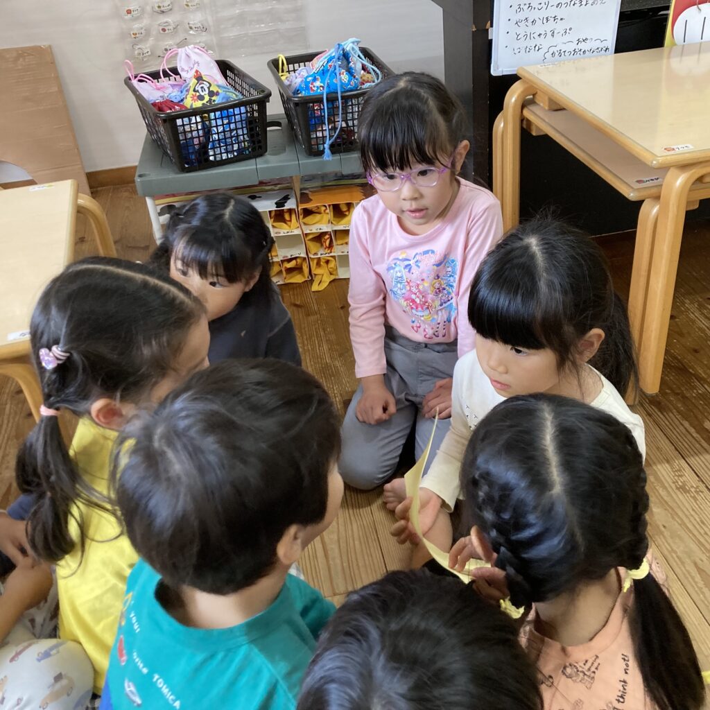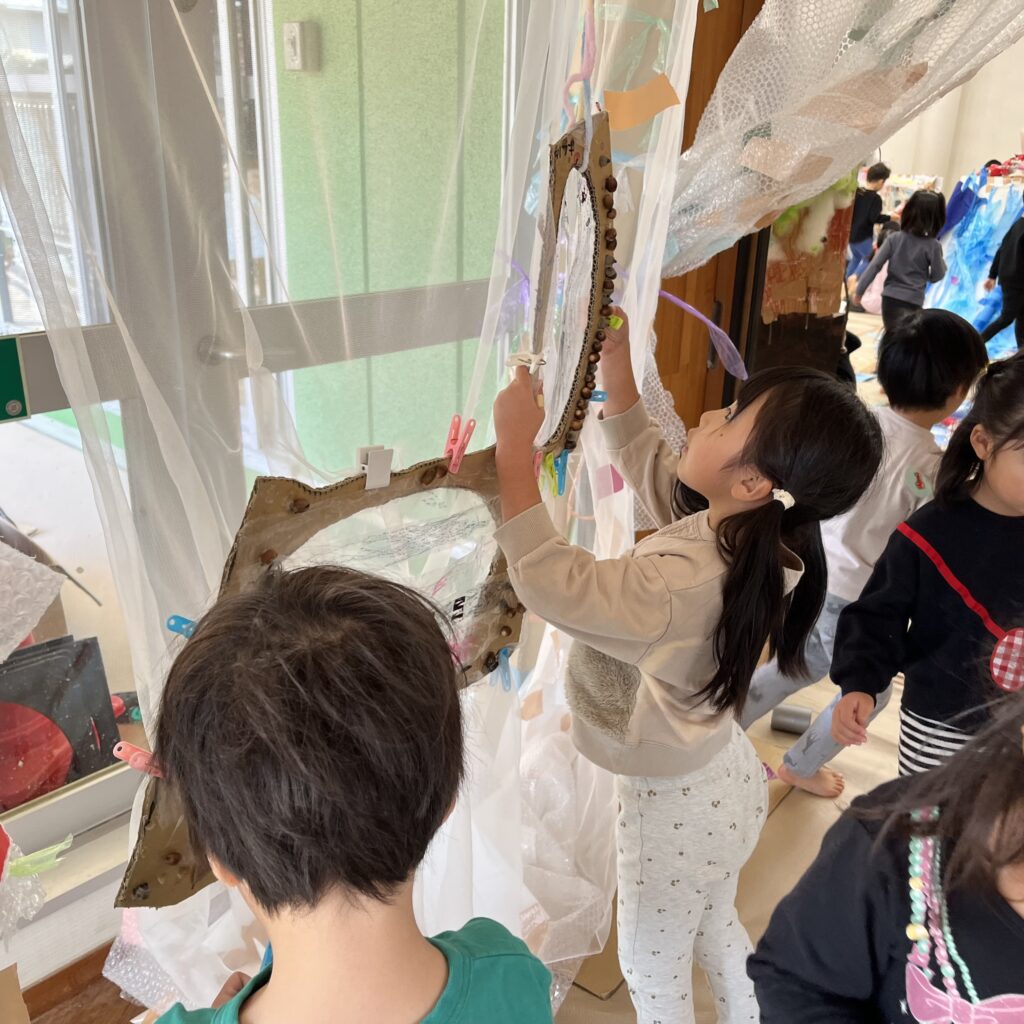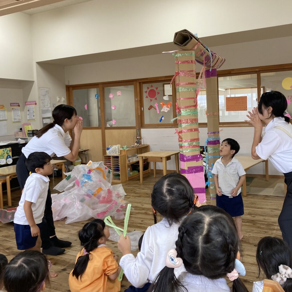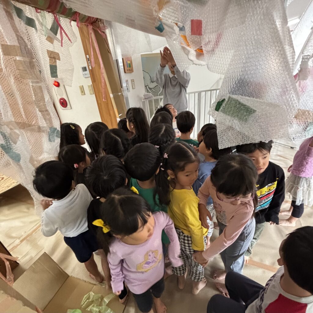 完成したテントを見て、「“10匹のかえる”遊びに来てくれるといいね!」と胸を弾ませるみんな♪もしかしたら、“かえるさん”に出会うかも、しれませんね。テントの中で子どもたちと一緒に写真も沢山撮ってみて下さいね!
