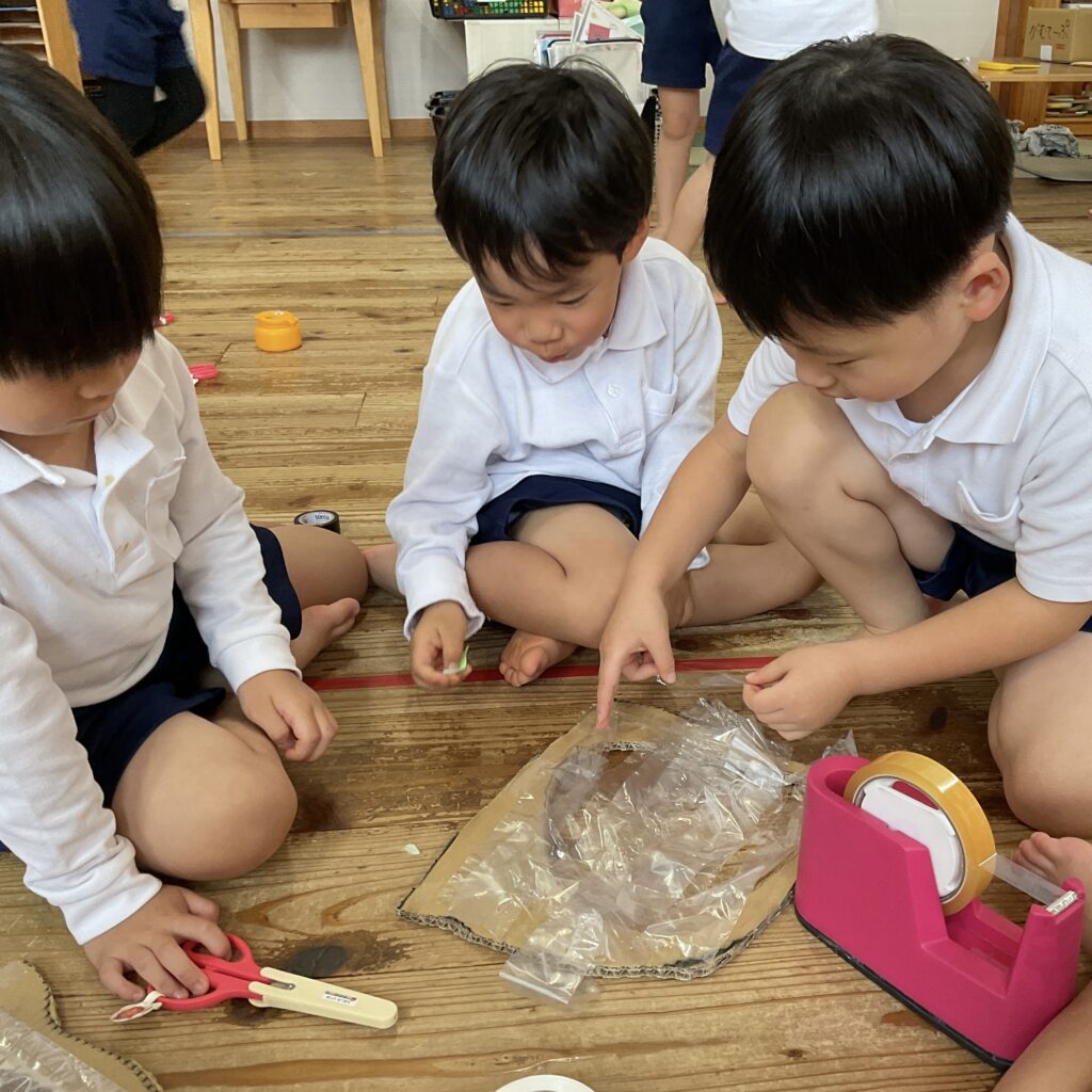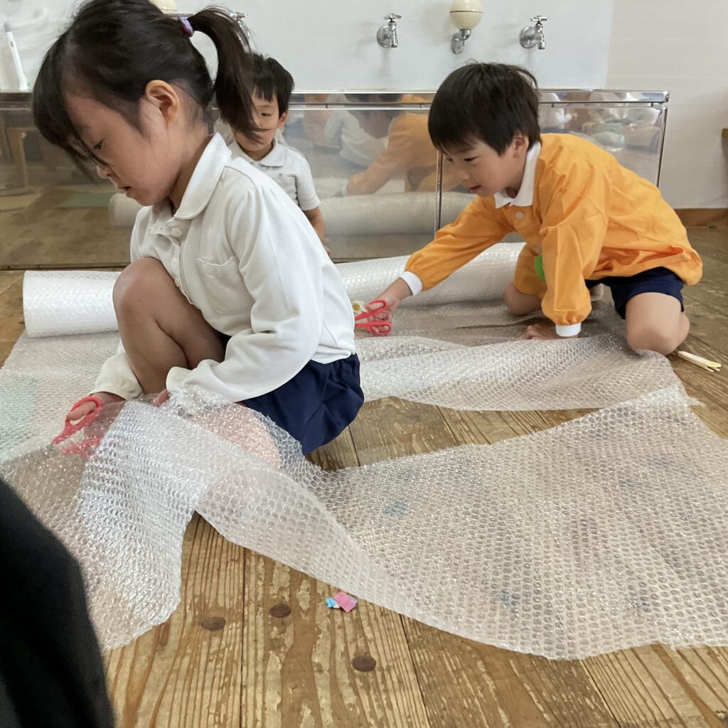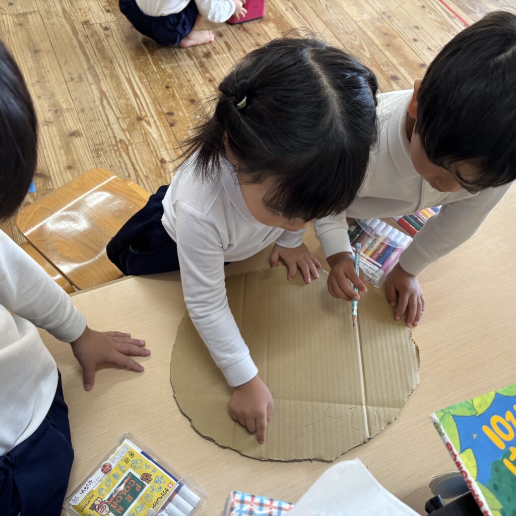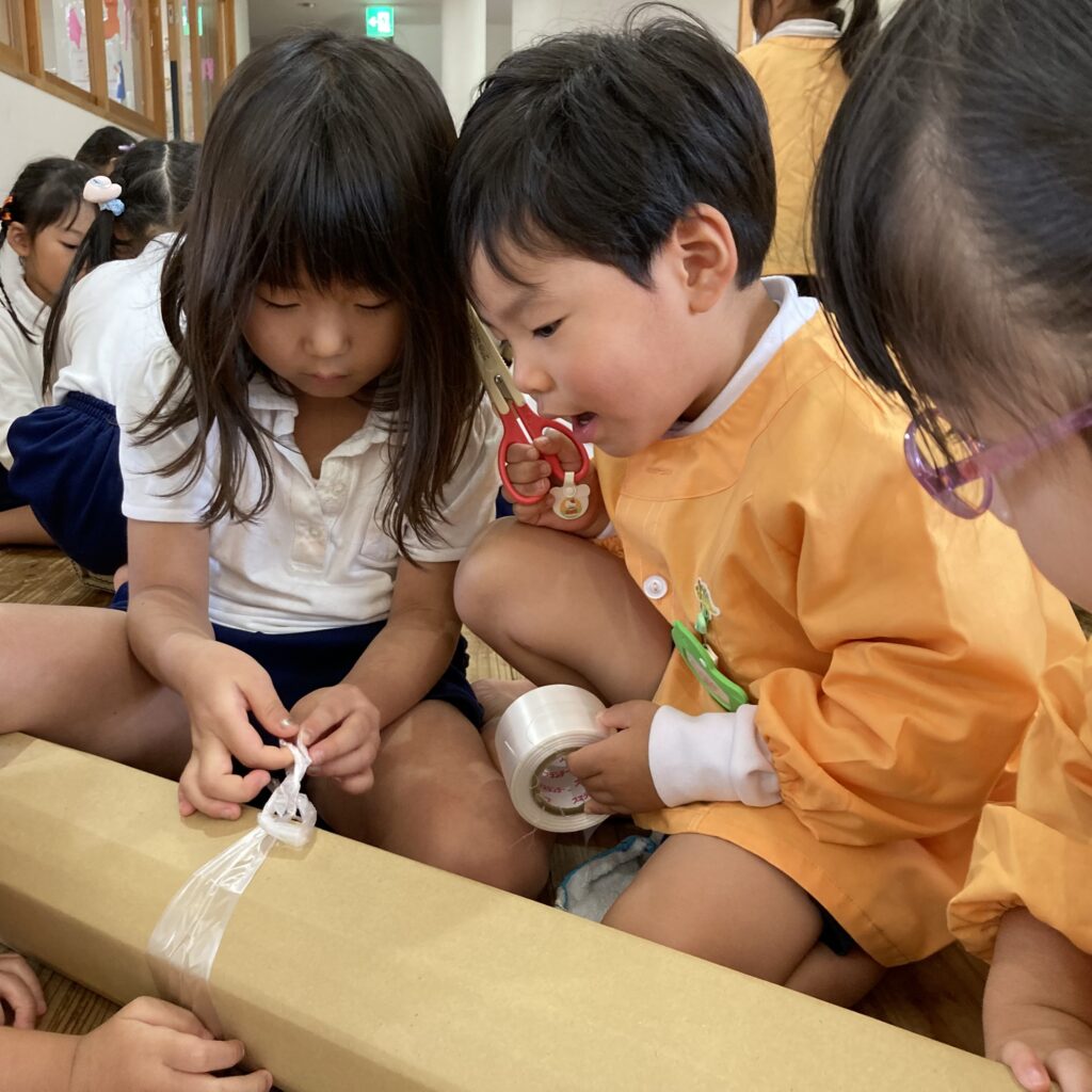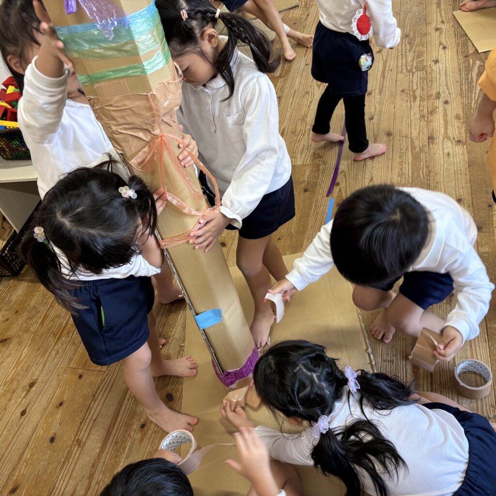 『10匹のかえる』の絵本を読んでいたゆき組の子どもたち。すると、「僕たちもテント作ってキャンプしたい!」という声が上がりました。「いいね!テント作ろう!」と、やる気いっぱいのみんな。“困った時は話し合う” ことを大切にして設計図、柱、天井、ドア、、を作っていきました。
