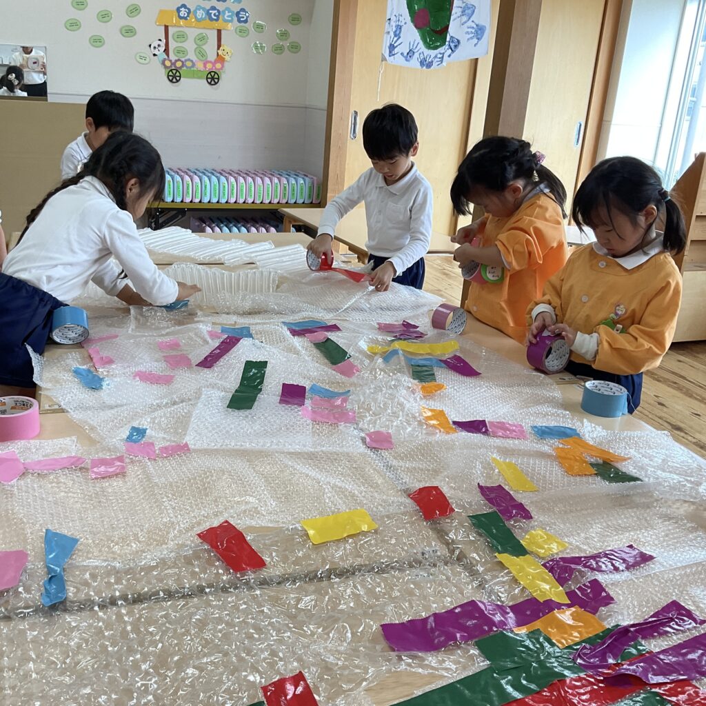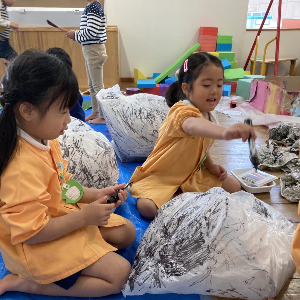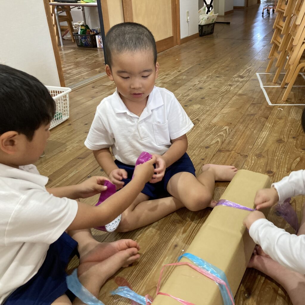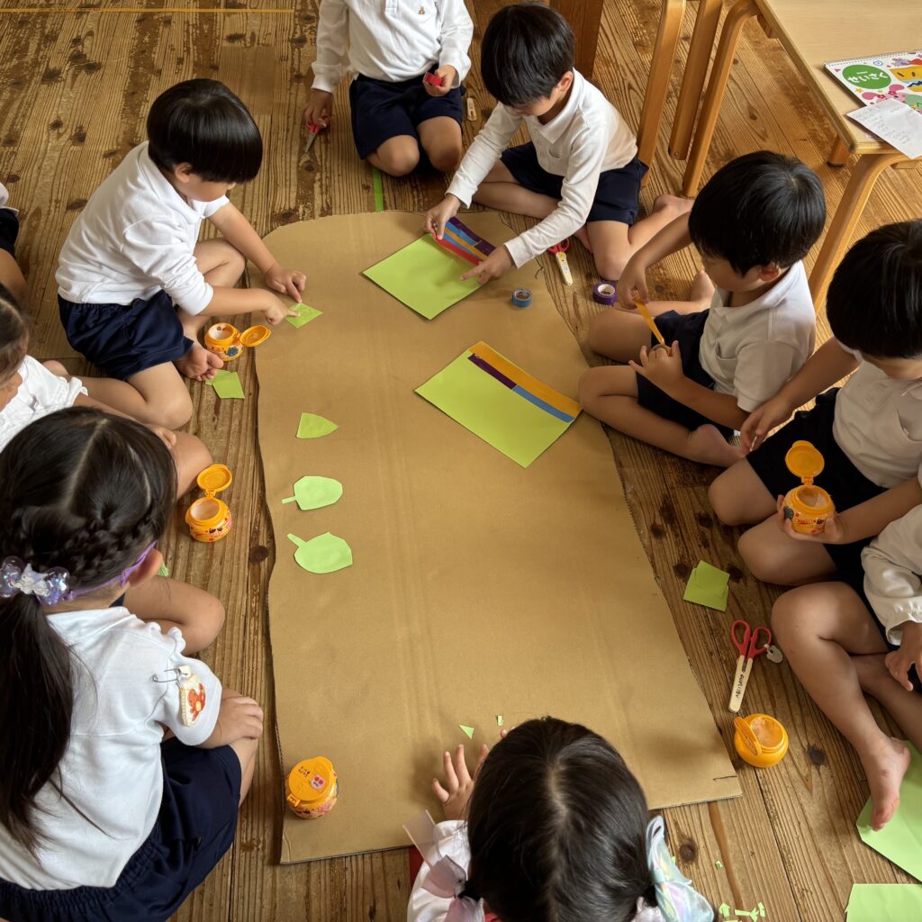 『10匹のかえる』の絵本を読んでいたゆき組の子どもたち。すると、「僕たちもテント作ってキャンプしたい!」という声が上がりました。「いいね!テント作ろう!」と、やる気いっぱいのみんな。“困った時は話し合う” ことを大切にして設計図、柱、天井、ドア、、を作っていきました。