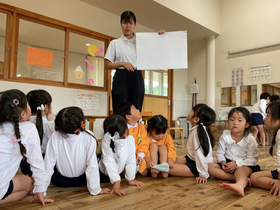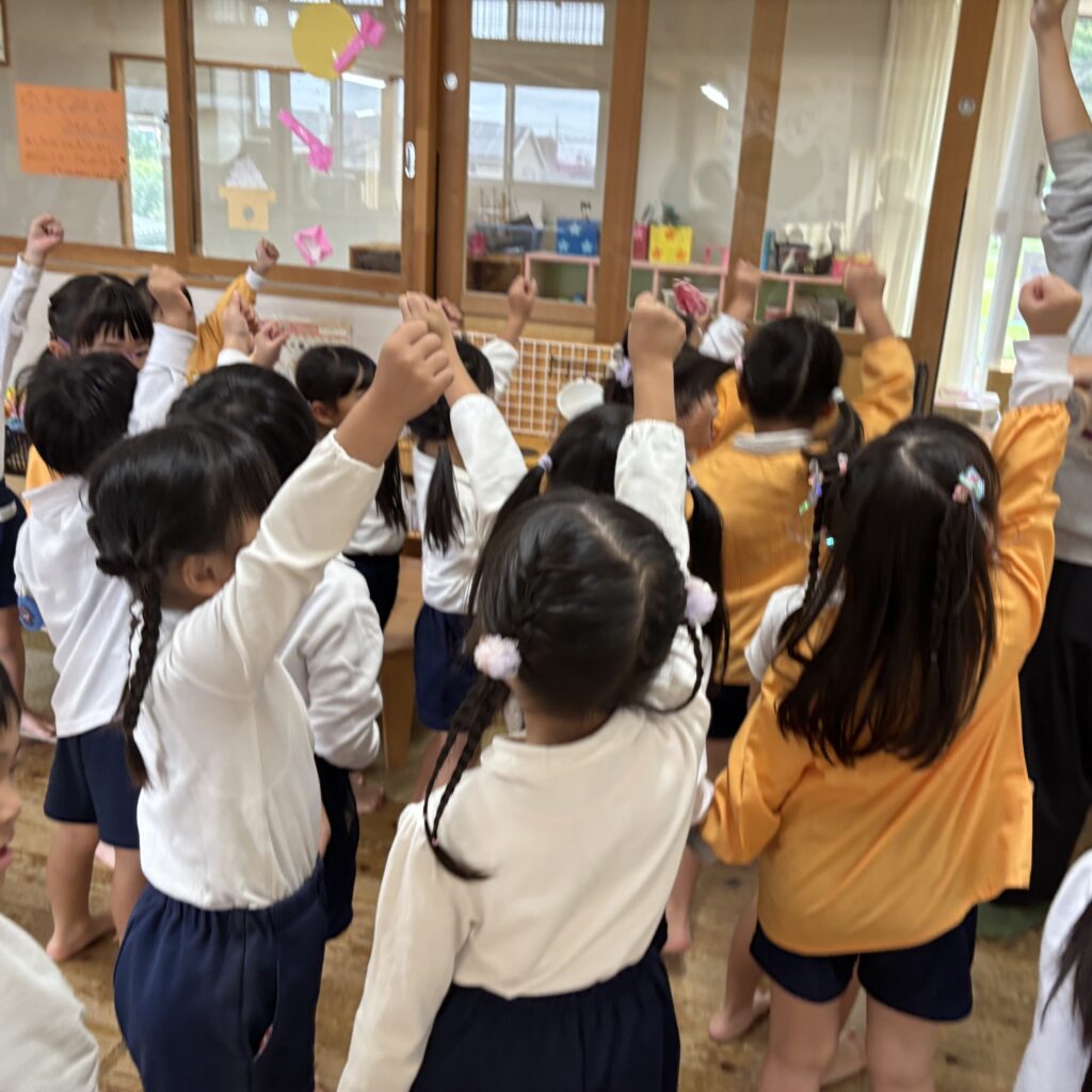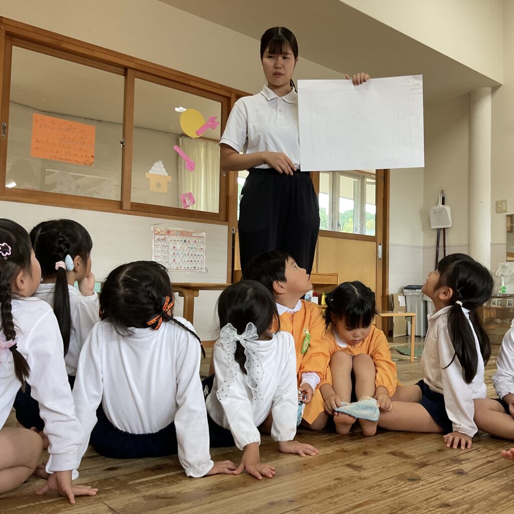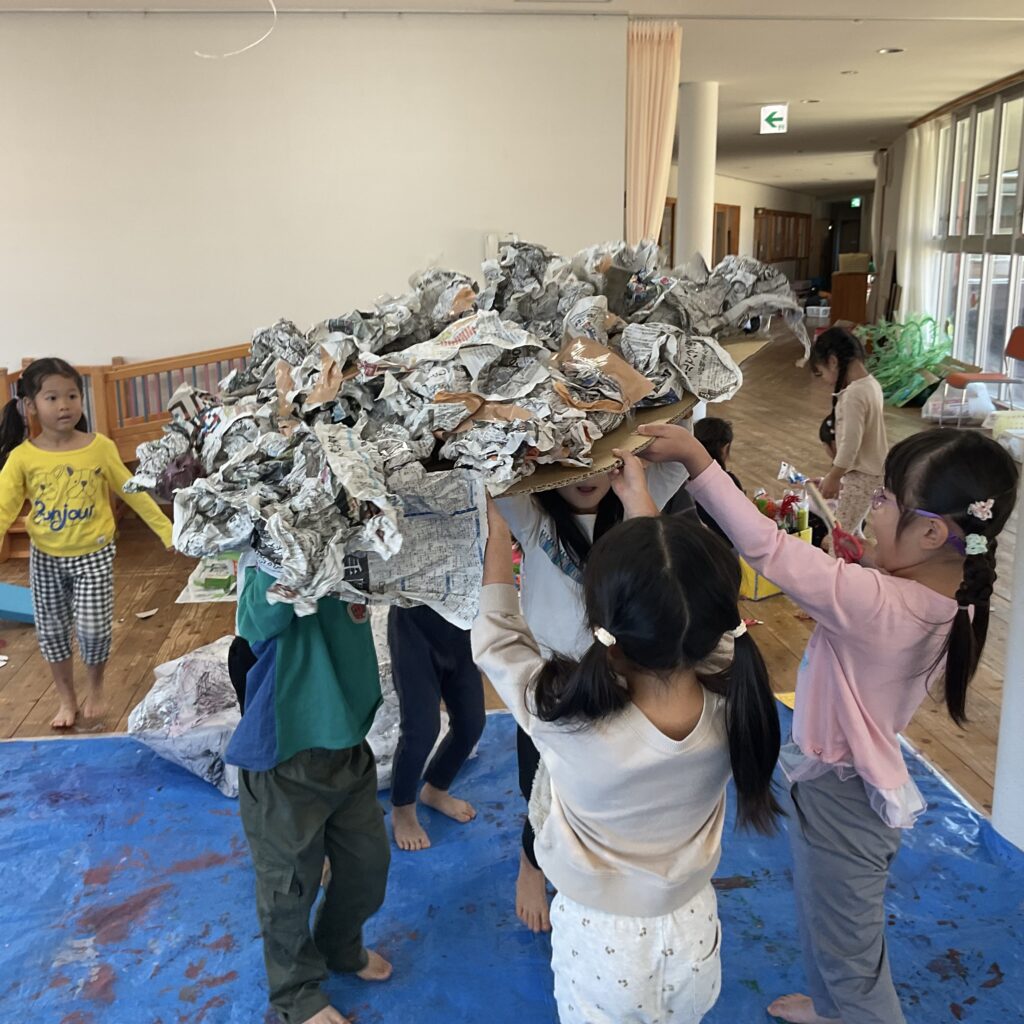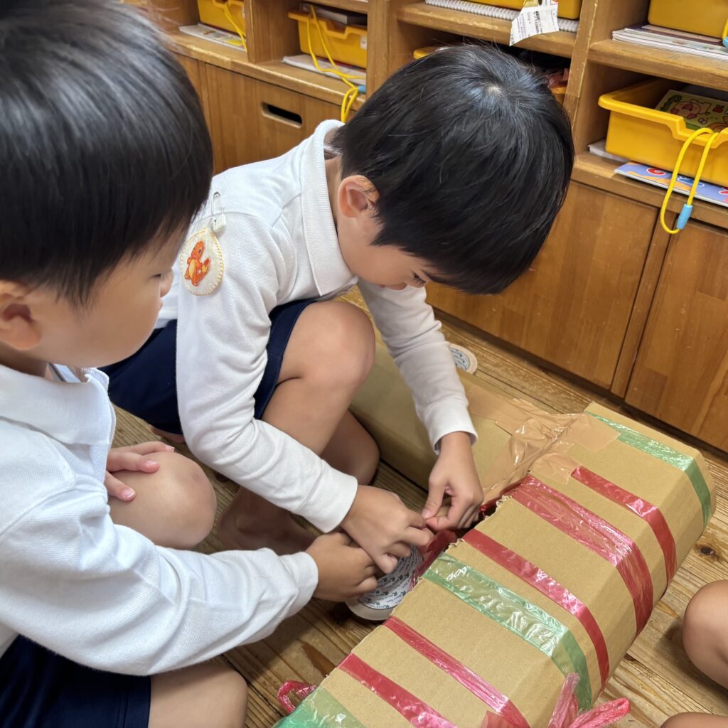 『10匹のかえる』の絵本を読んでいたゆき組の子どもたち。すると、「僕たちもテント作ってキャンプしたい!」という声が上がりました。「いいね!テント作ろう!」と、やる気いっぱいのみんな。“困った時は話し合う” ことを大切にして設計図、柱、天井、ドア、、を作っていきました。