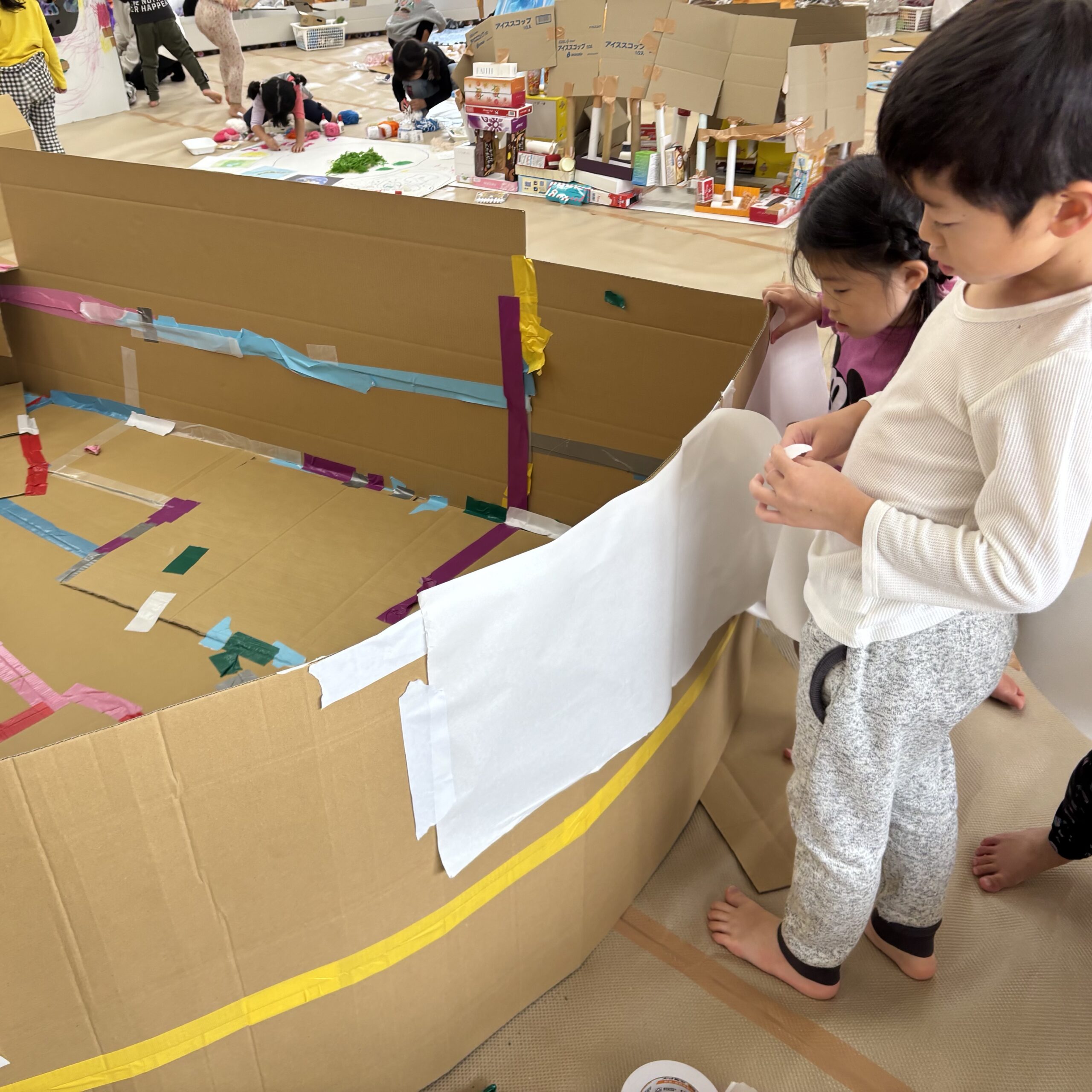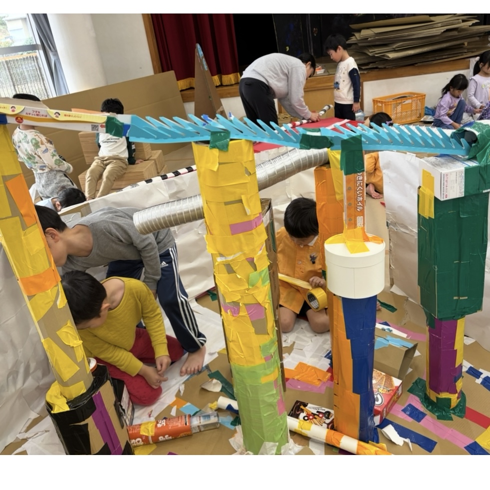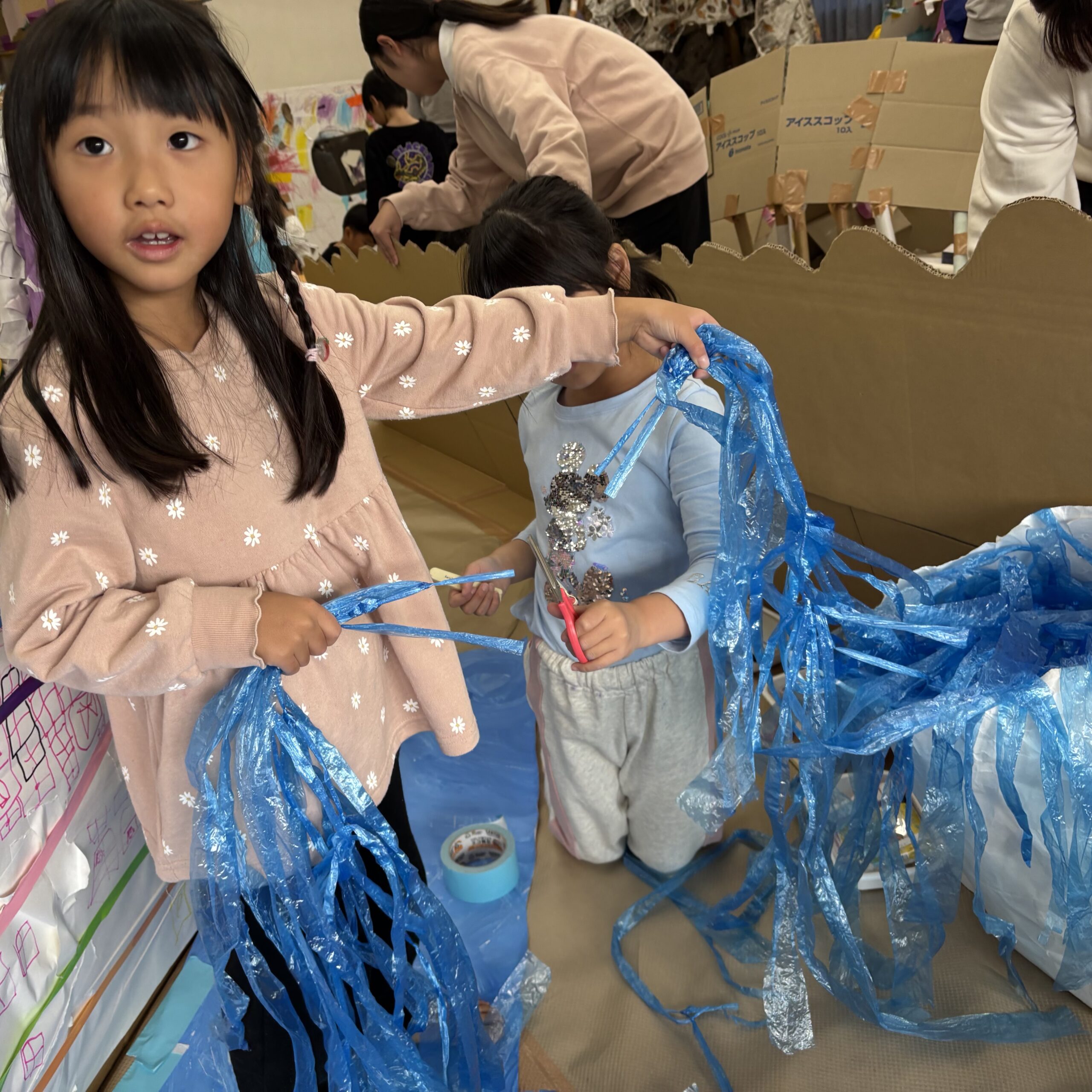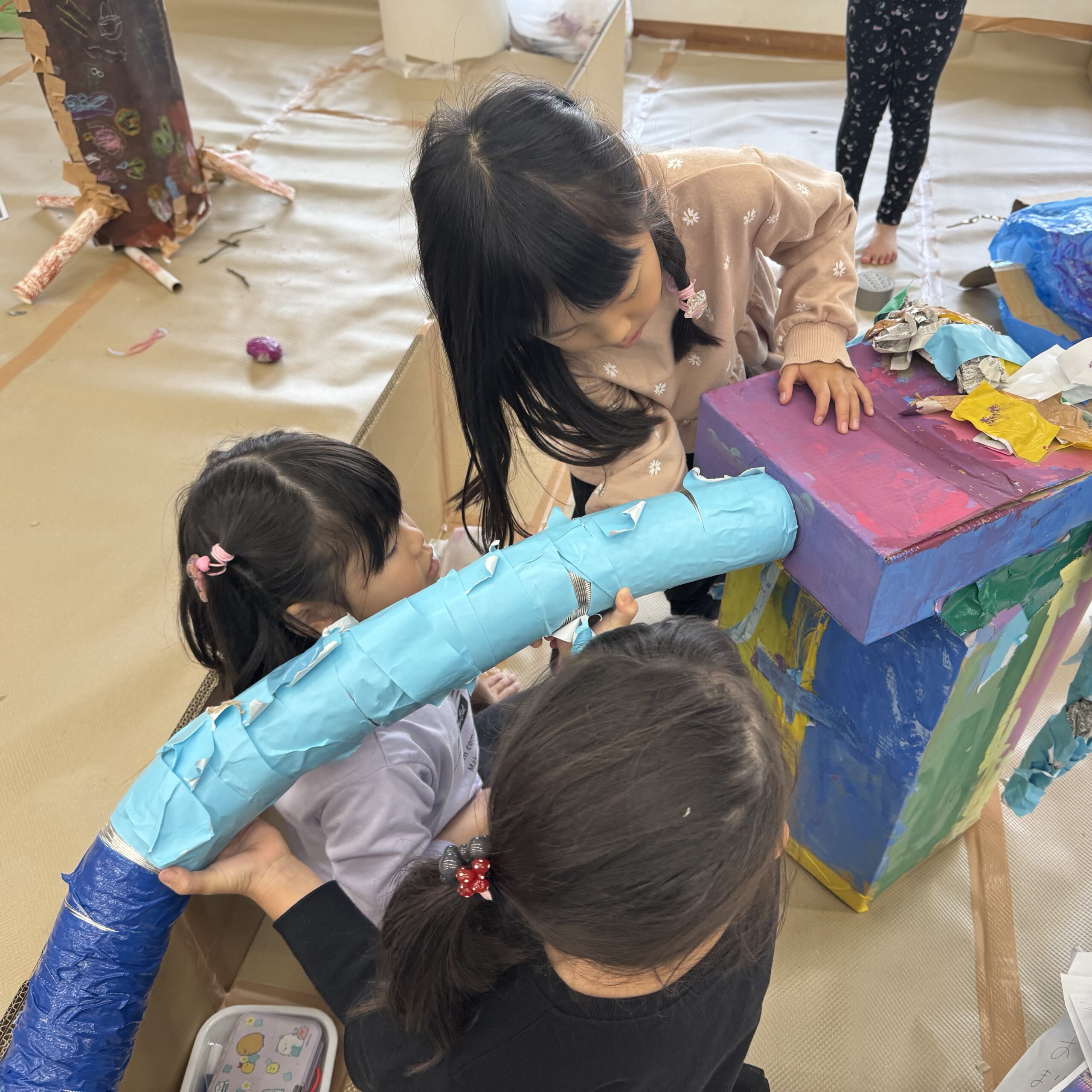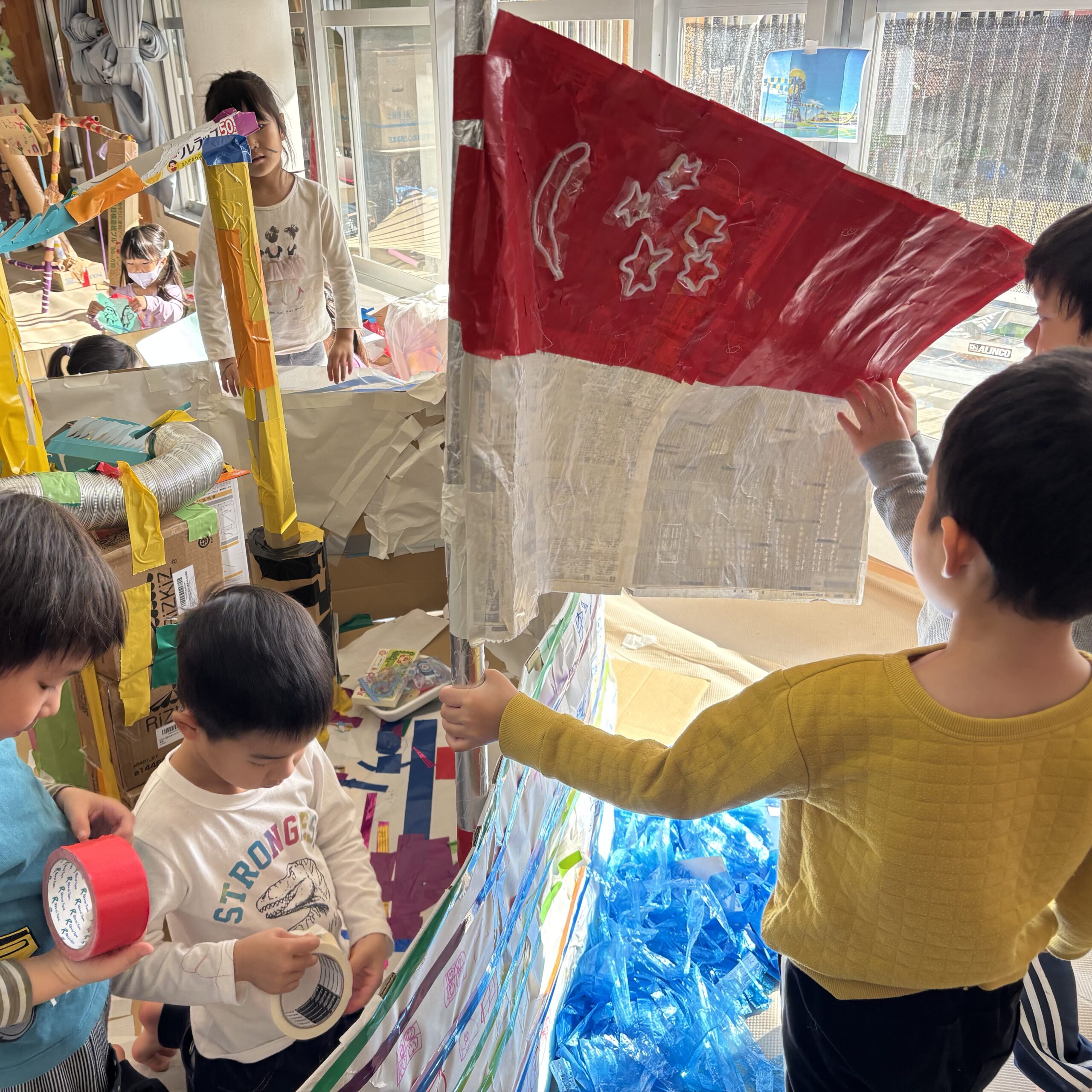 調べている中で、「ロイヤルカリビアンクルーザー」という豪華客船が出航していることを知った子どもたち。船の上でウォータスライダーが出来ることを知ると「楽しそう!作ってみたい!」と大盛り上がり⭐︎みんなで乗れる大きな船をメインに、有名な“マーライオン”や民族衣装の“ケバヤ”を着た船長も加えて、シンガポールの世界が完成しました!ウォータースライダーでは、実際にどんぐりを転がして遊ぶこともできますよ!ぜひ、遊んでみてください⭐︎ただし、プールまでたどり着く可能性は、五分五分です(笑)