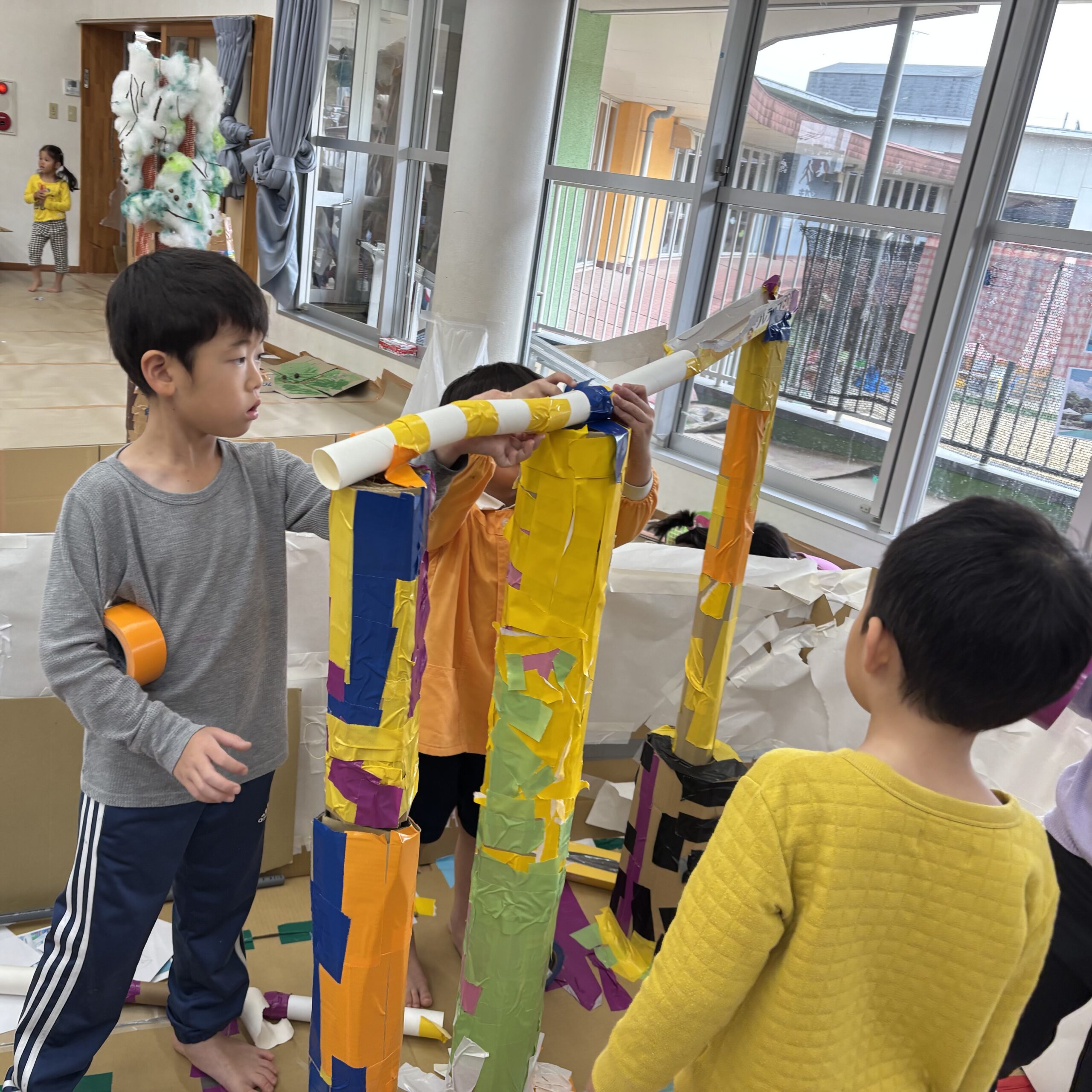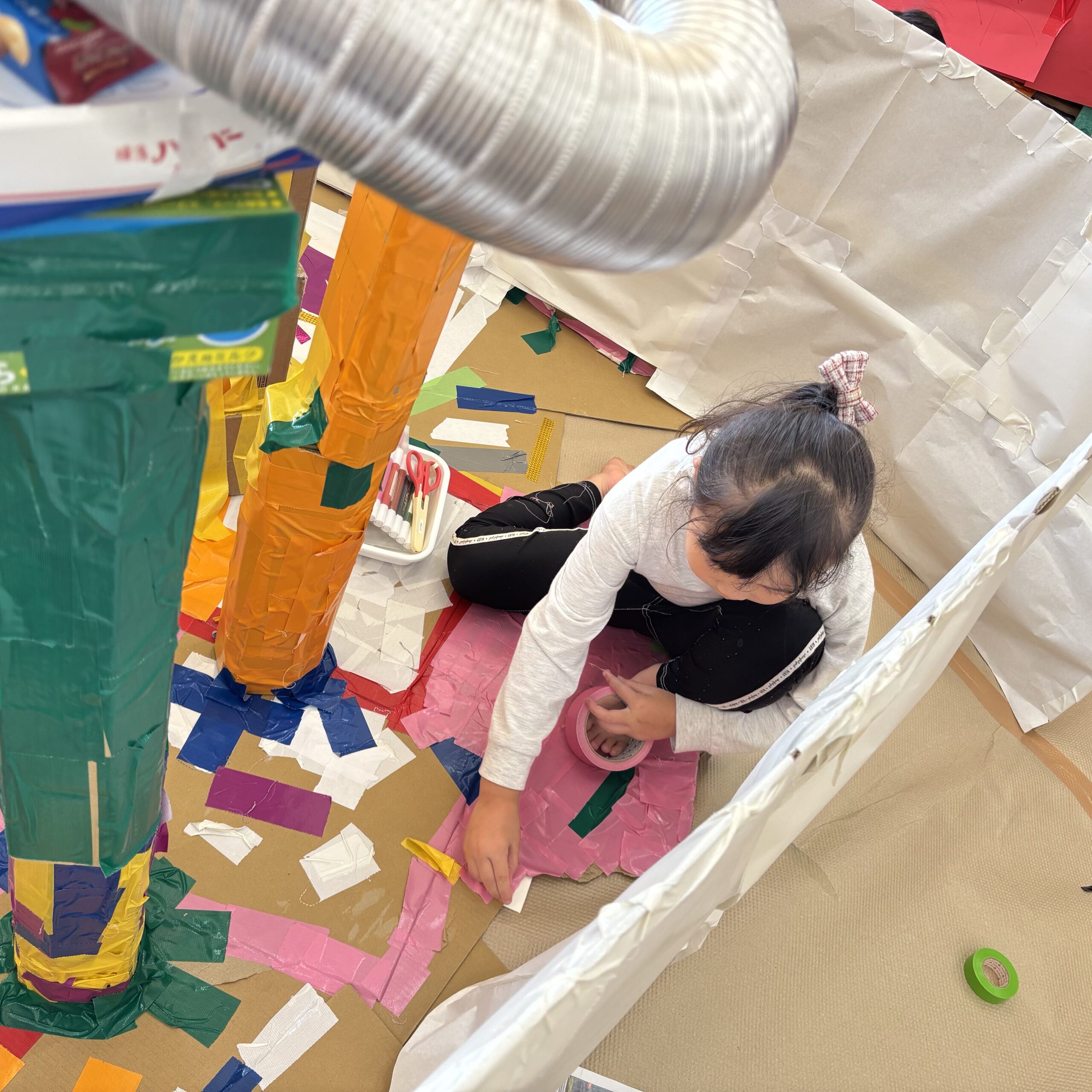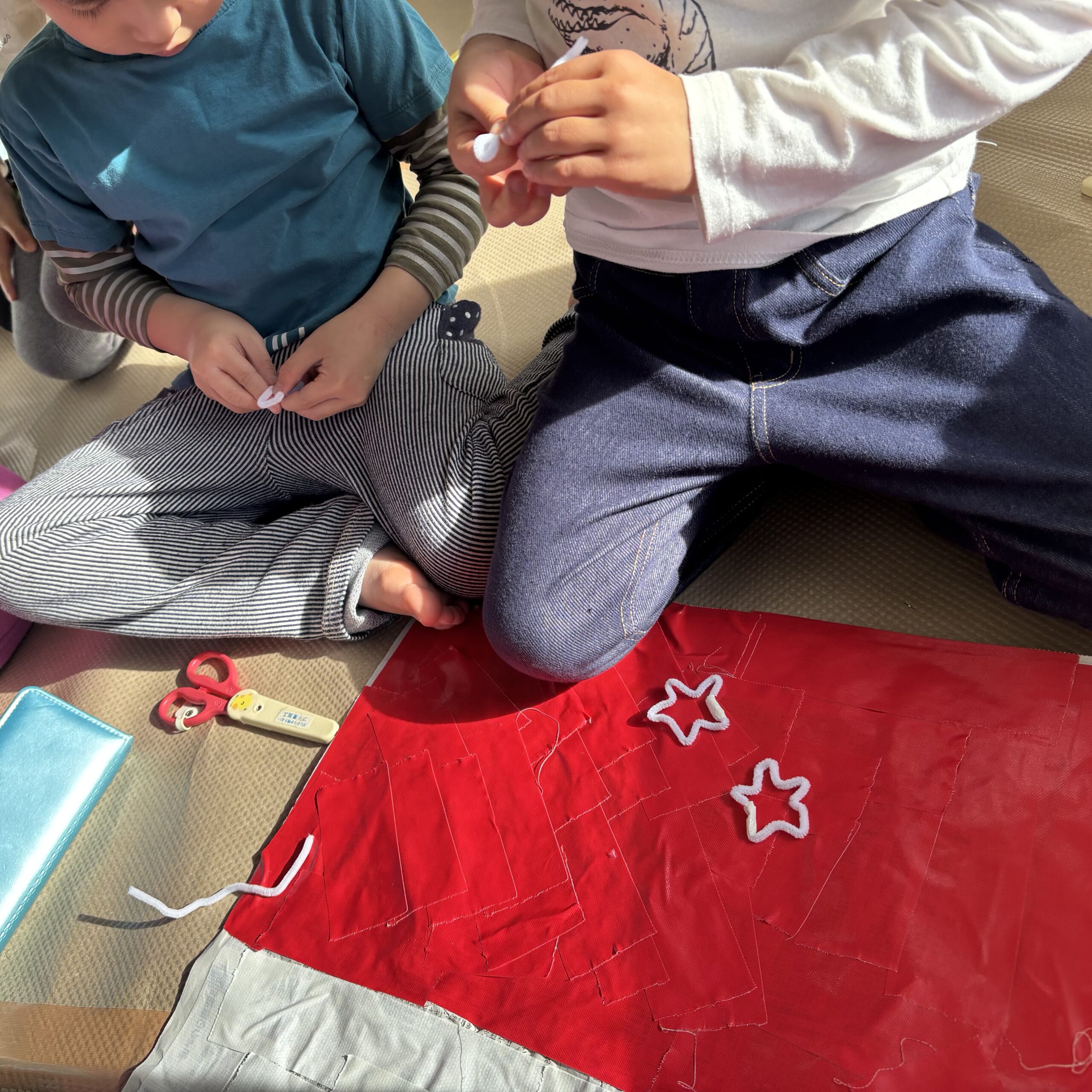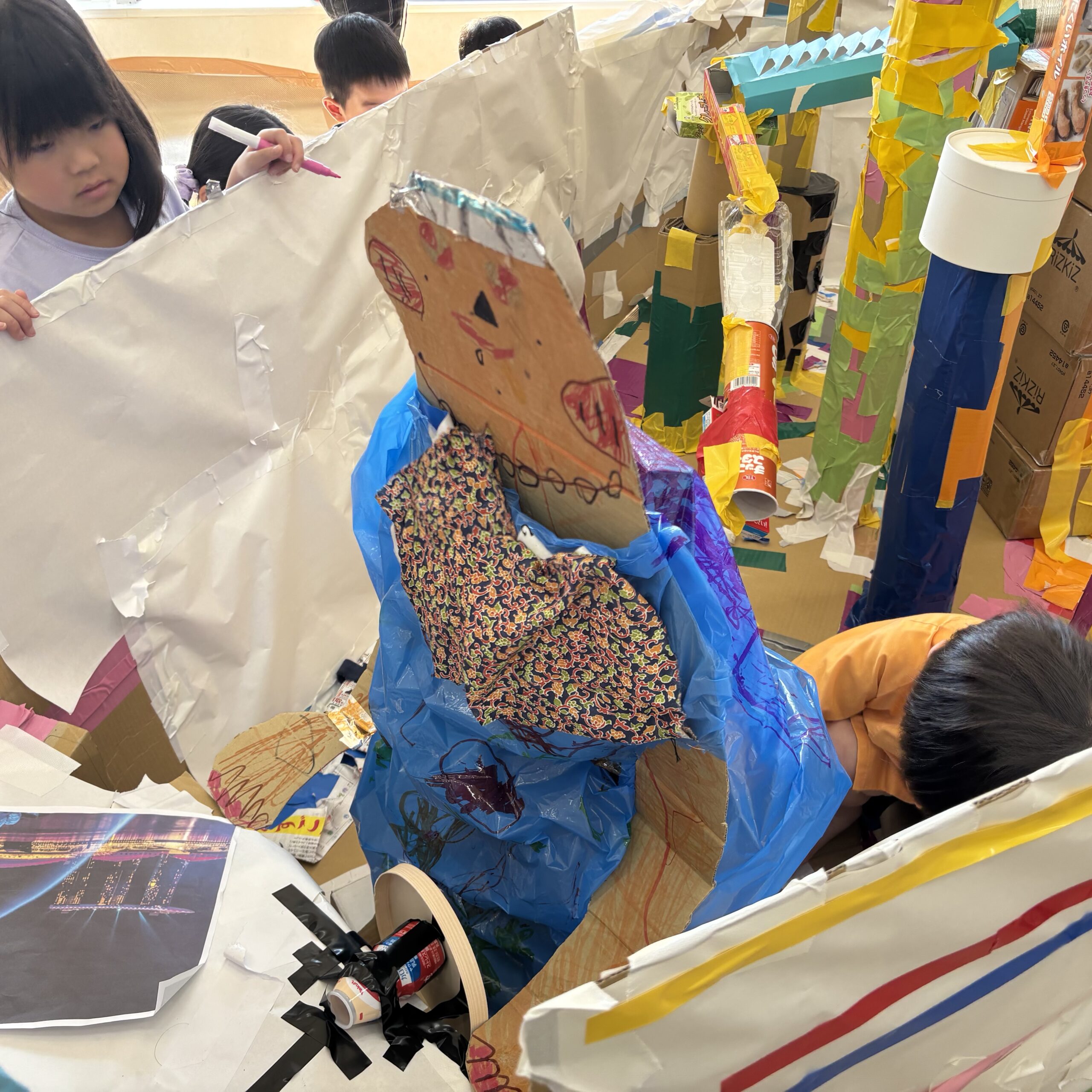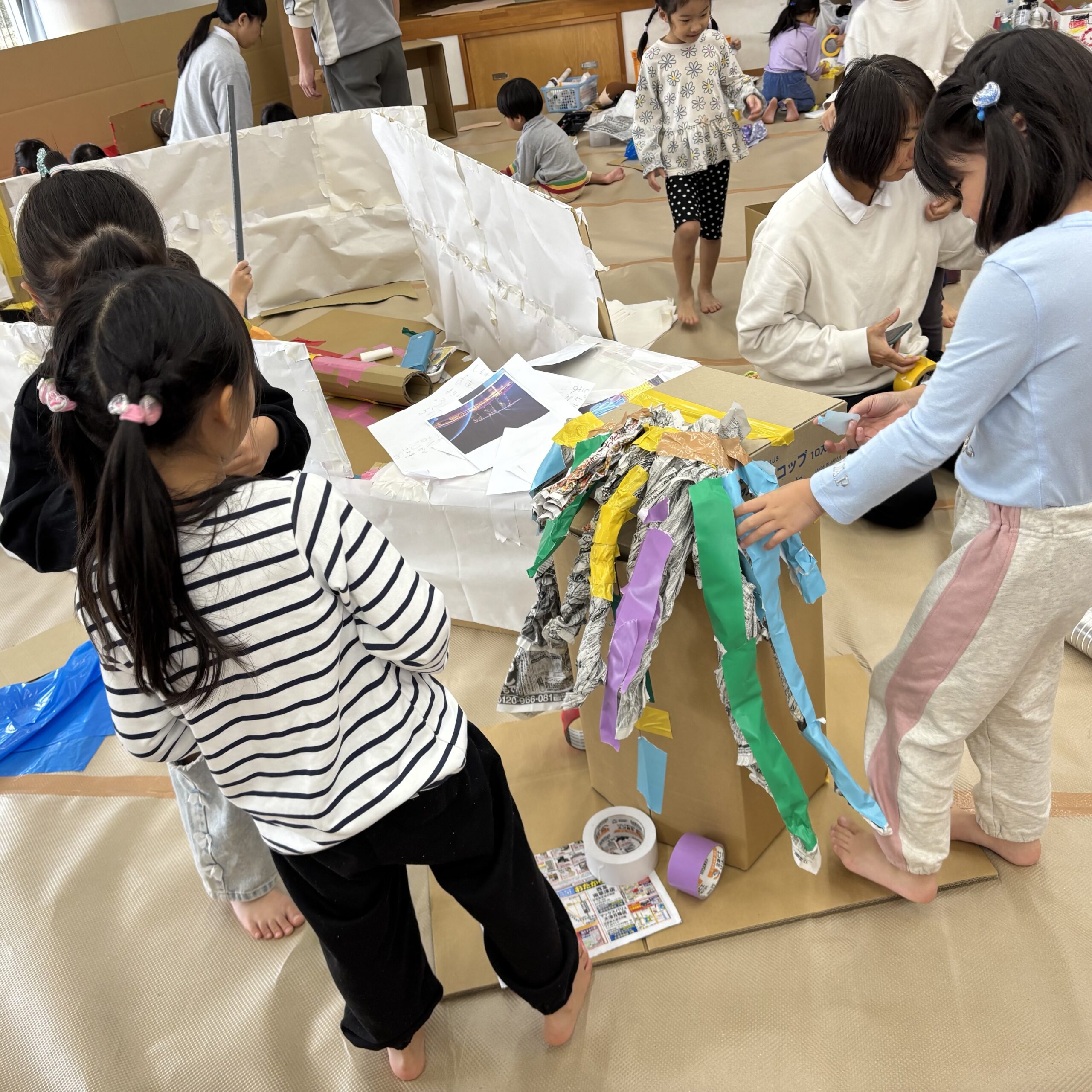 調べている中で、「ロイヤルカリビアンクルーザー」という豪華客船が出航していることを知った子どもたち。船の上でウォータスライダーが出来ることを知ると「楽しそう!作ってみたい!」と大盛り上がり⭐︎みんなで乗れる大きな船をメインに、有名な“マーライオン”や民族衣装の“ケバヤ”を着た船長も加えて、シンガポールの世界が完成しました!ウォータースライダーでは、実際にどんぐりを転がして遊ぶこともできますよ!ぜひ、遊んでみてください⭐︎ただし、プールまでたどり着く可能性は、五分五分です(笑)