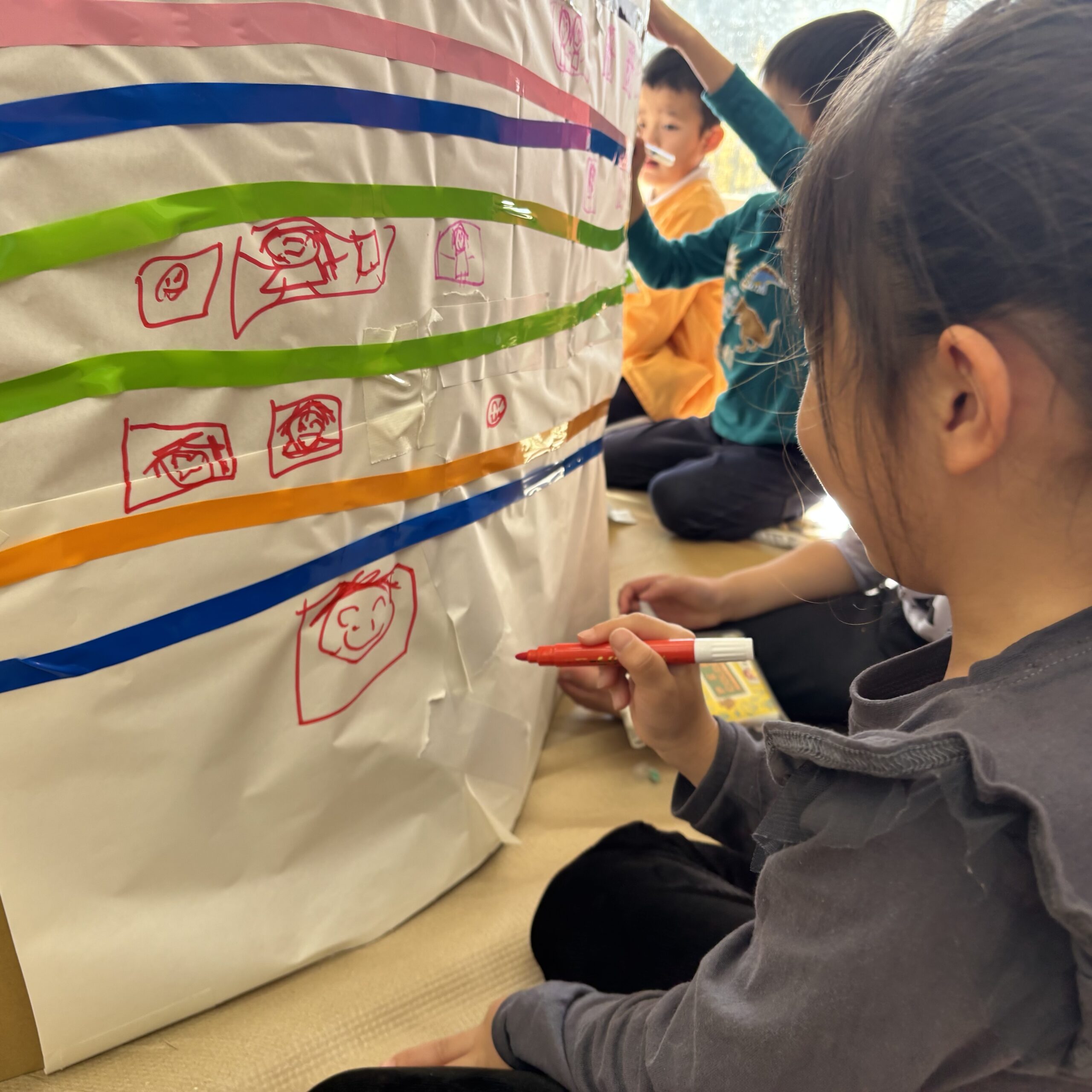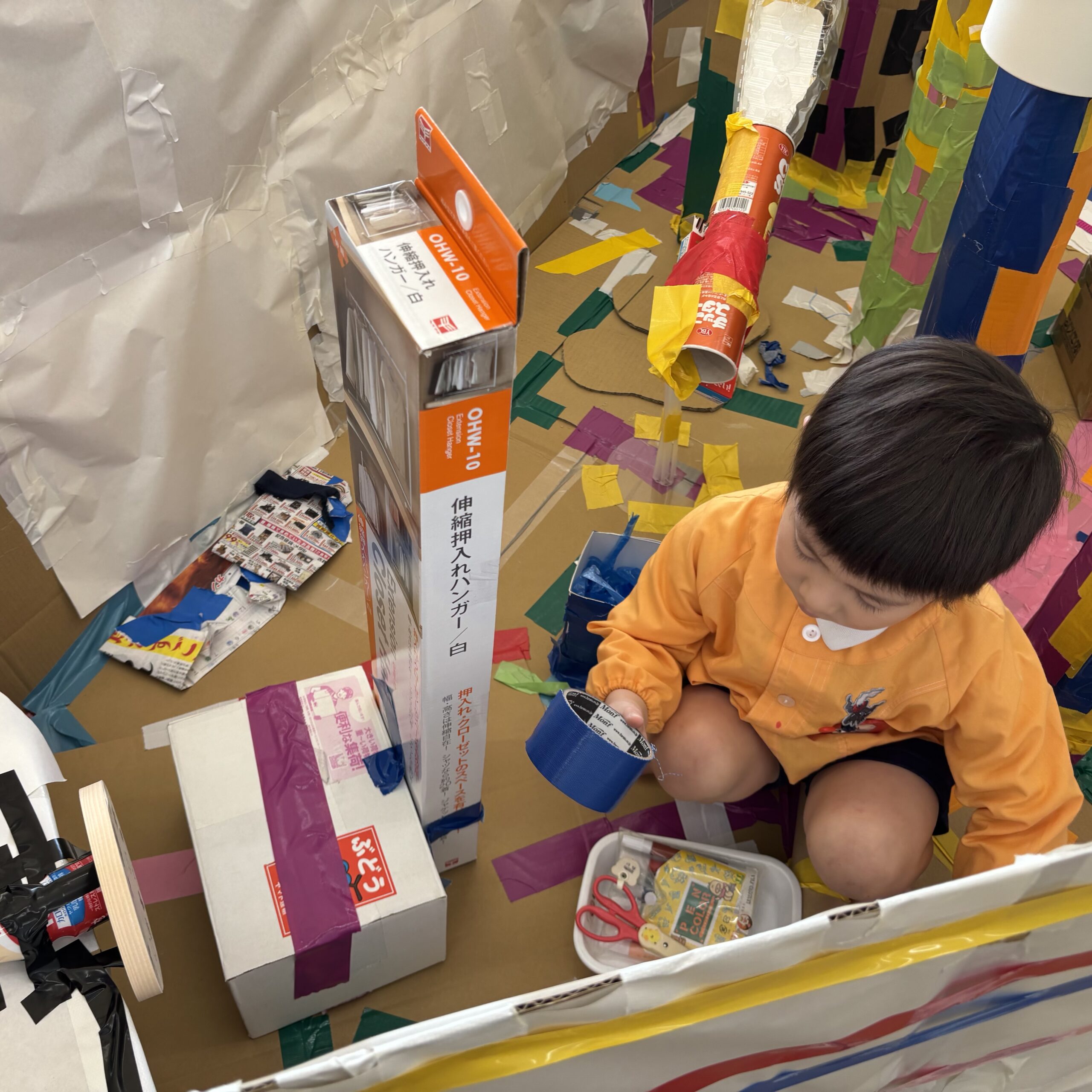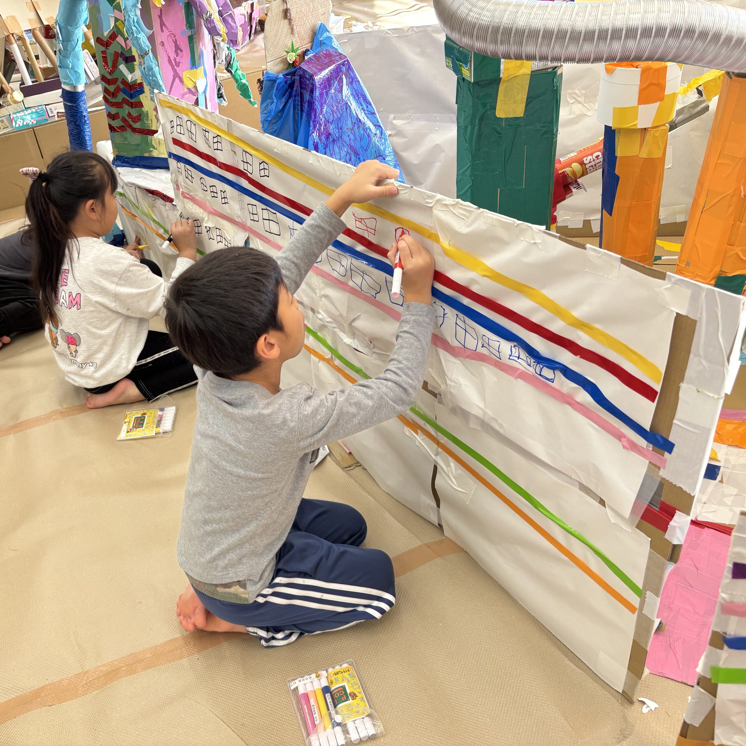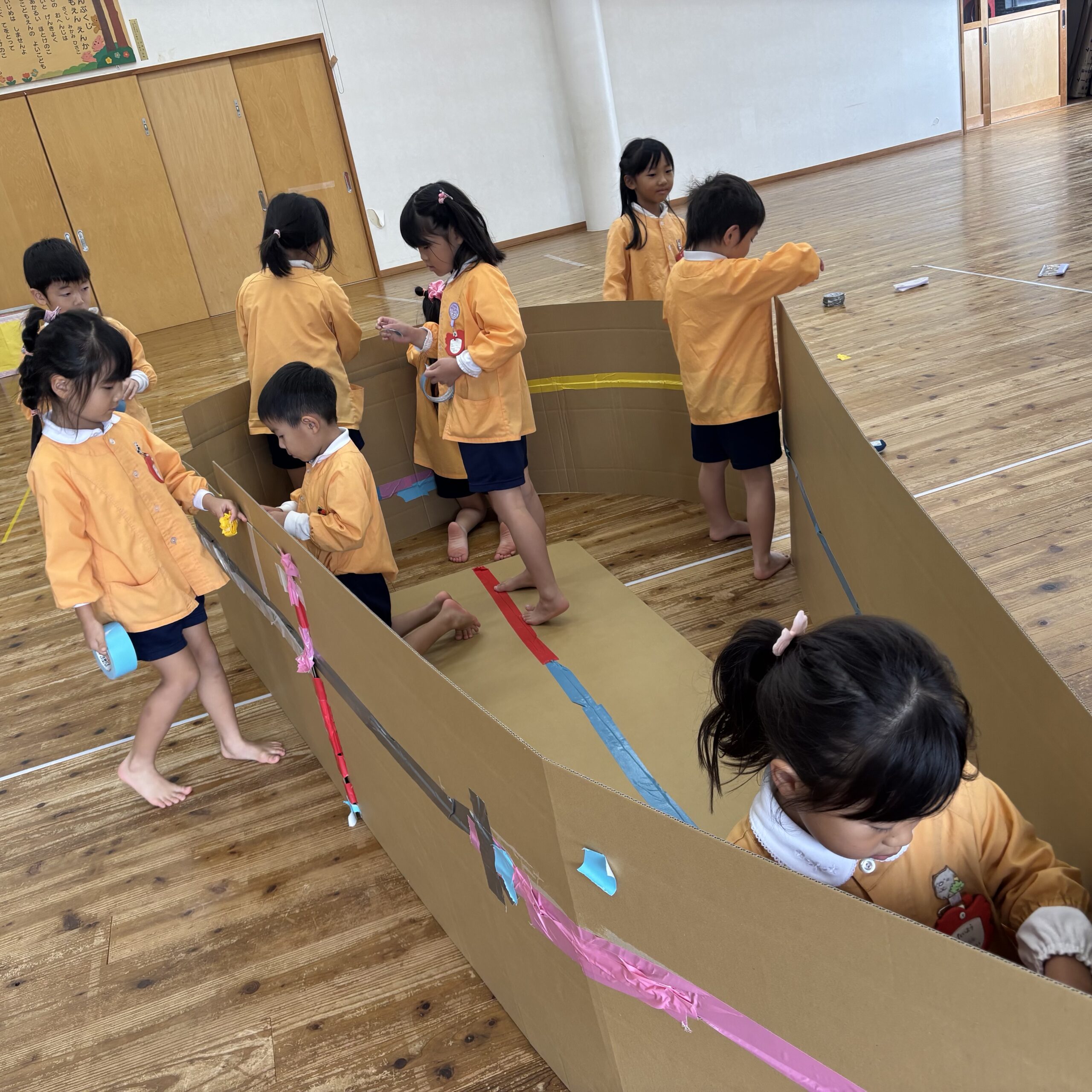 調べている中で、「ロイヤルカリビアンクルーザー」という豪華客船が出航していることを知った子どもたち。船の上でウォータスライダーが出来ることを知ると「楽しそう!作ってみたい!」と大盛り上がり⭐︎みんなで乗れる大きな船をメインに、有名な“マーライオン”や民族衣装の“ケバヤ”を着た船長も加えて、シンガポールの世界が完成しました!ウォータースライダーでは、実際にどんぐりを転がして遊ぶこともできますよ!ぜひ、遊んでみてください⭐︎ただし、プールまでたどり着く可能性は、五分五分です(笑)