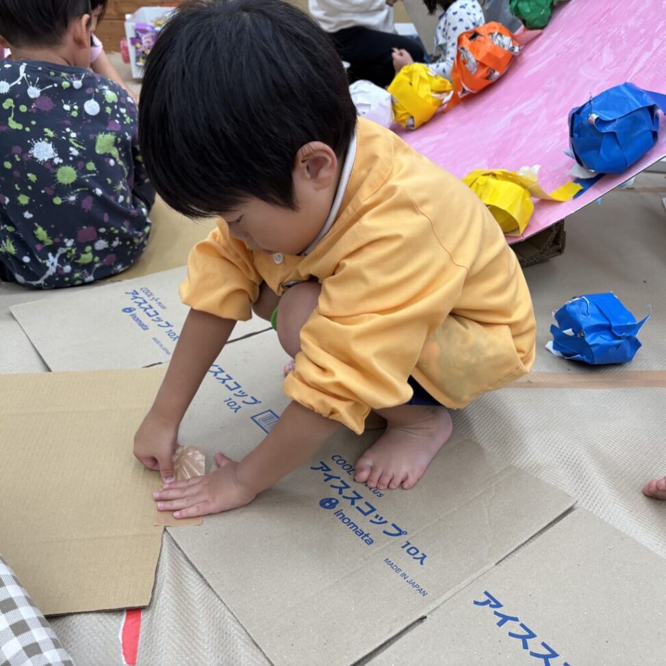 “こんな道があったらおもしろそう”と考えながら、道路の上に飾りをつけて遊びました。「ここは踏んでもいいよ」「こっちに行ってもいいよ」「ここは気を付けてね!」…など、子どもたちからのお願いも看板に書いてあります。