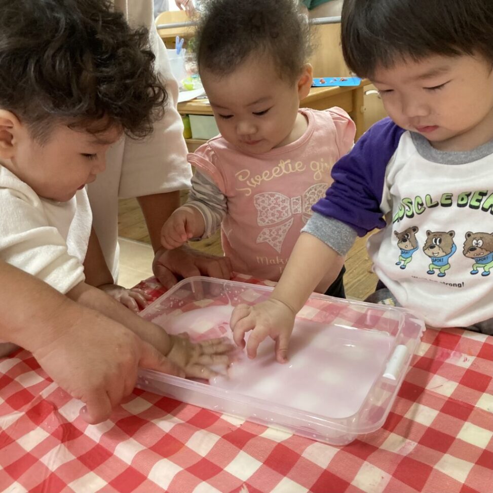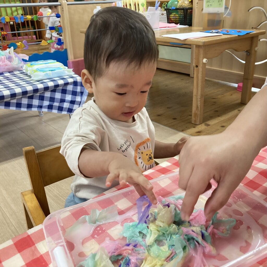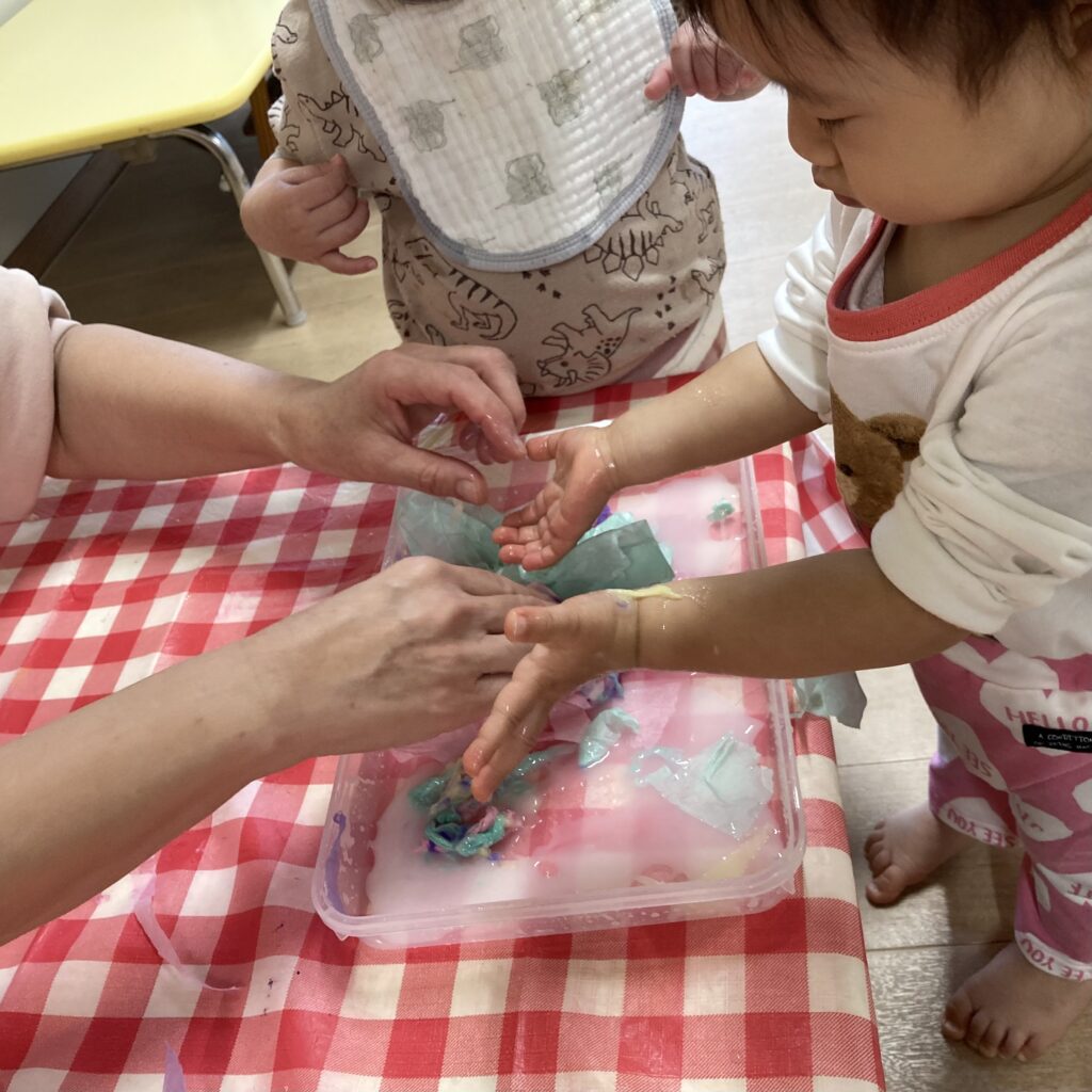まずは、水のりをトレーに入れて感触を確かめてみました!人差し指でチョンチョンと突いてみたり手をそっと入れてトロトロの感触を味わいました。そして水のりが行き渡るように保育者と一緒に混ぜていきます。“モミモミ、マゼマゼ“の時には、手に張り付くお花紙が気になり取ろうとする子も!でも反対の手に張り付いて取れず保育者に見せてくれる子もいました。
