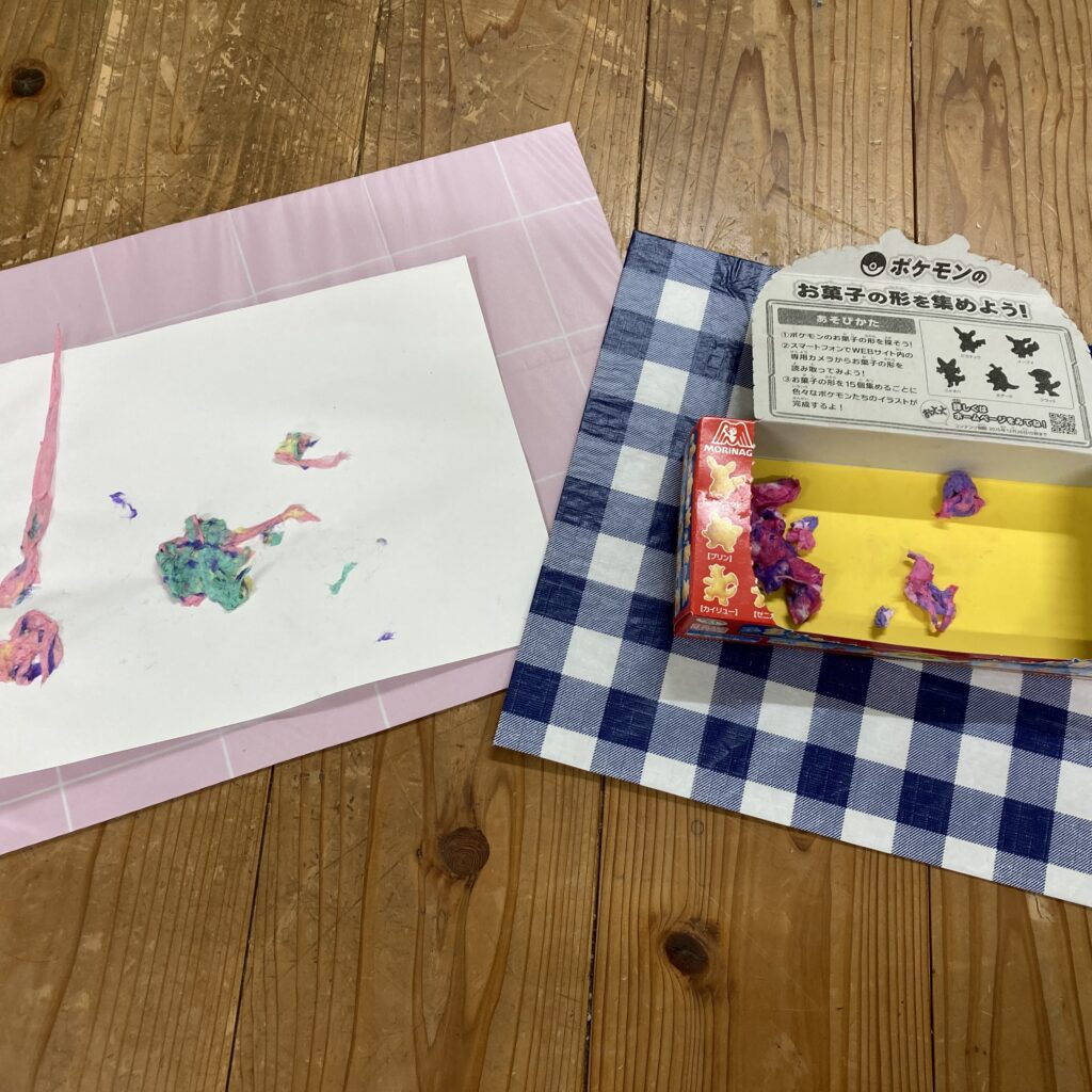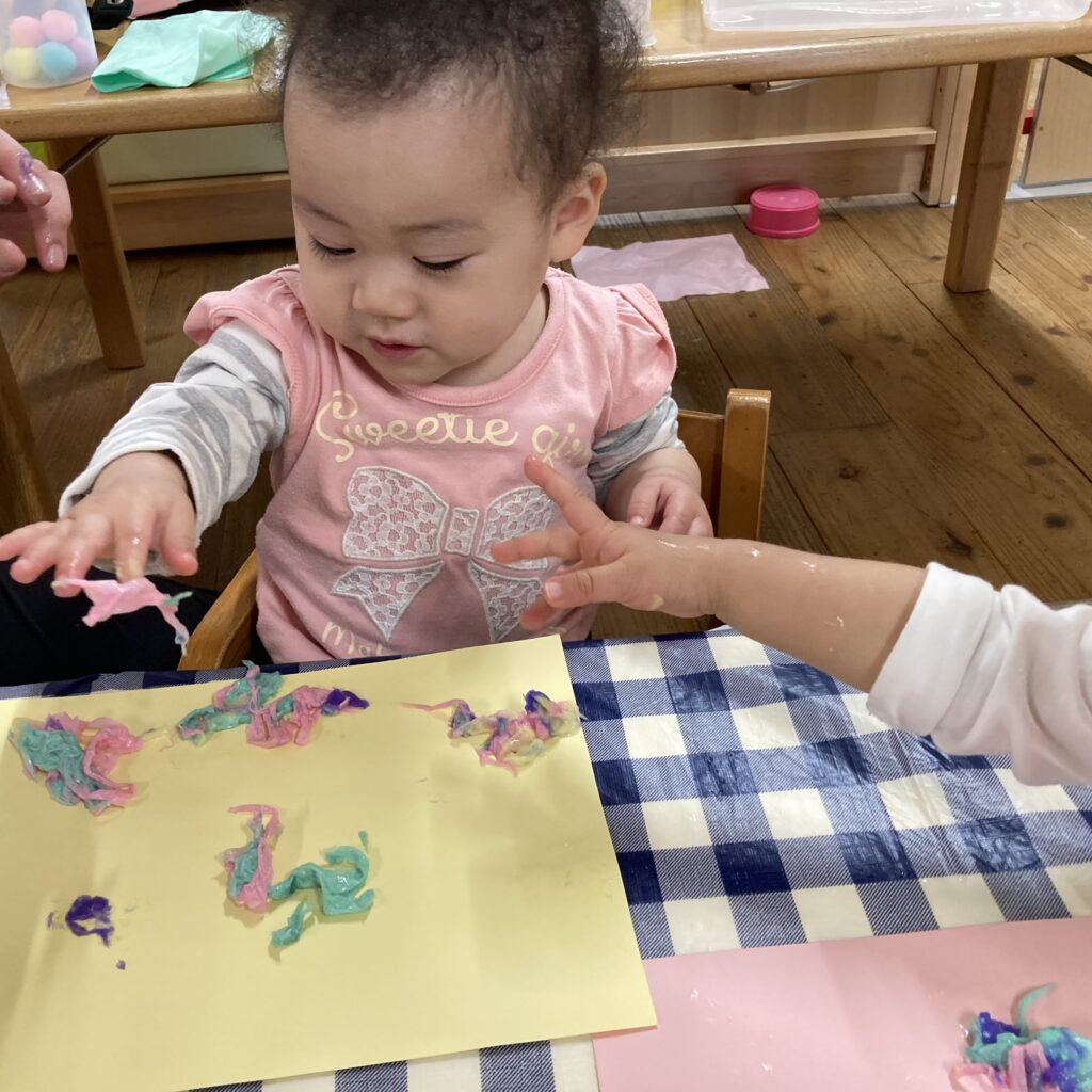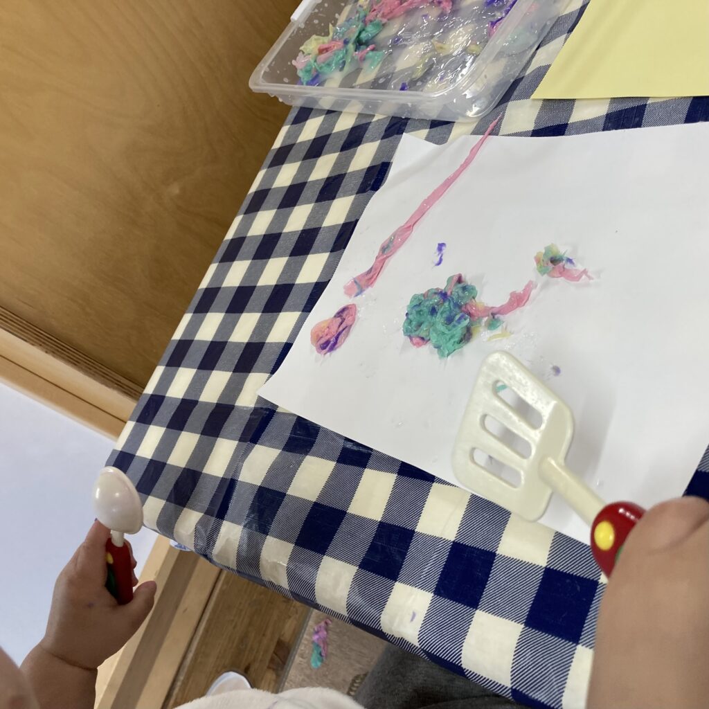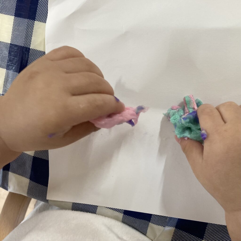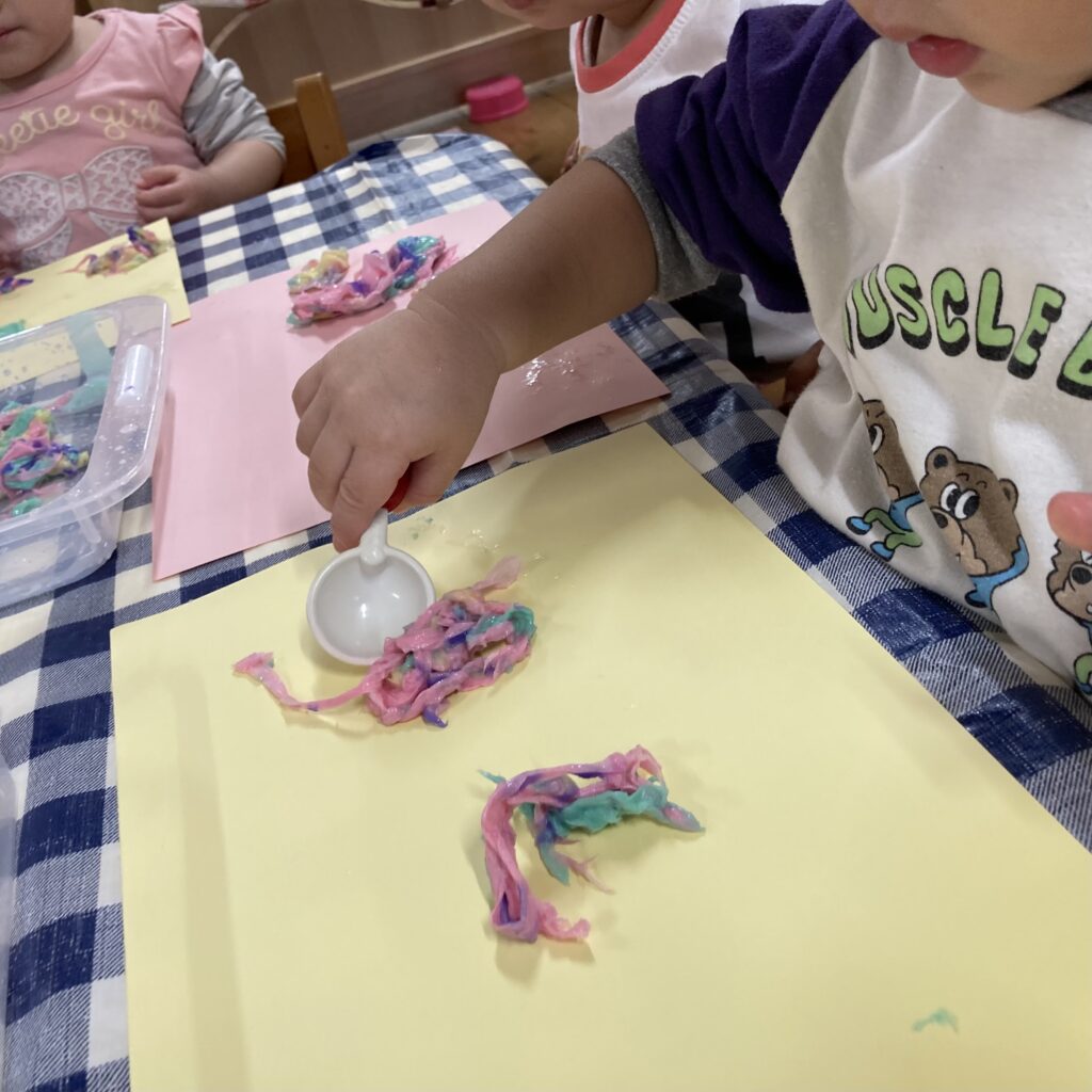 混ぜ終わったら画用紙の上に乗せ、その上で丸めたり引っ張ってちぎったり広げて感触を楽しみました。中にはスプーンやフライ返しを使って混ぜたり押し付けて楽しむ子もいましたよ!