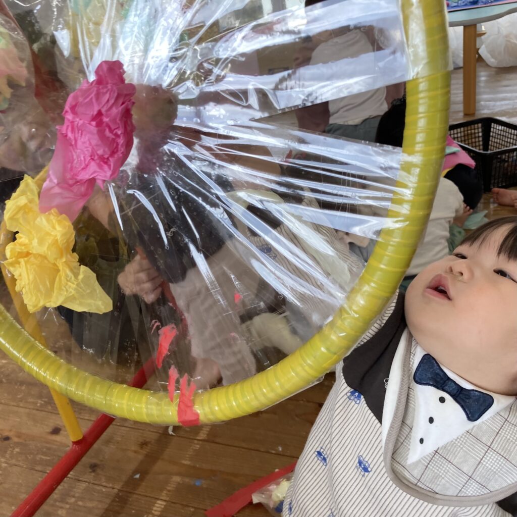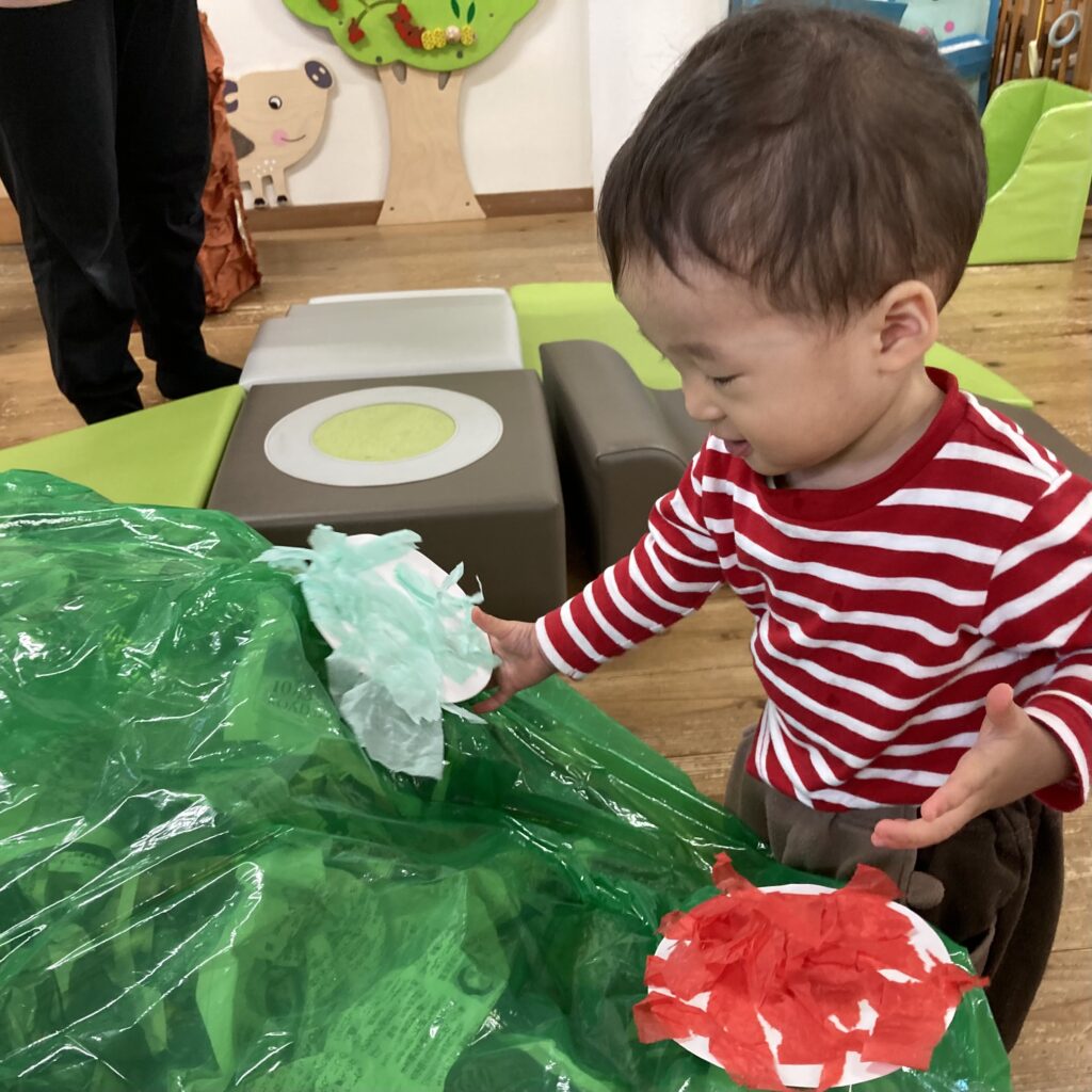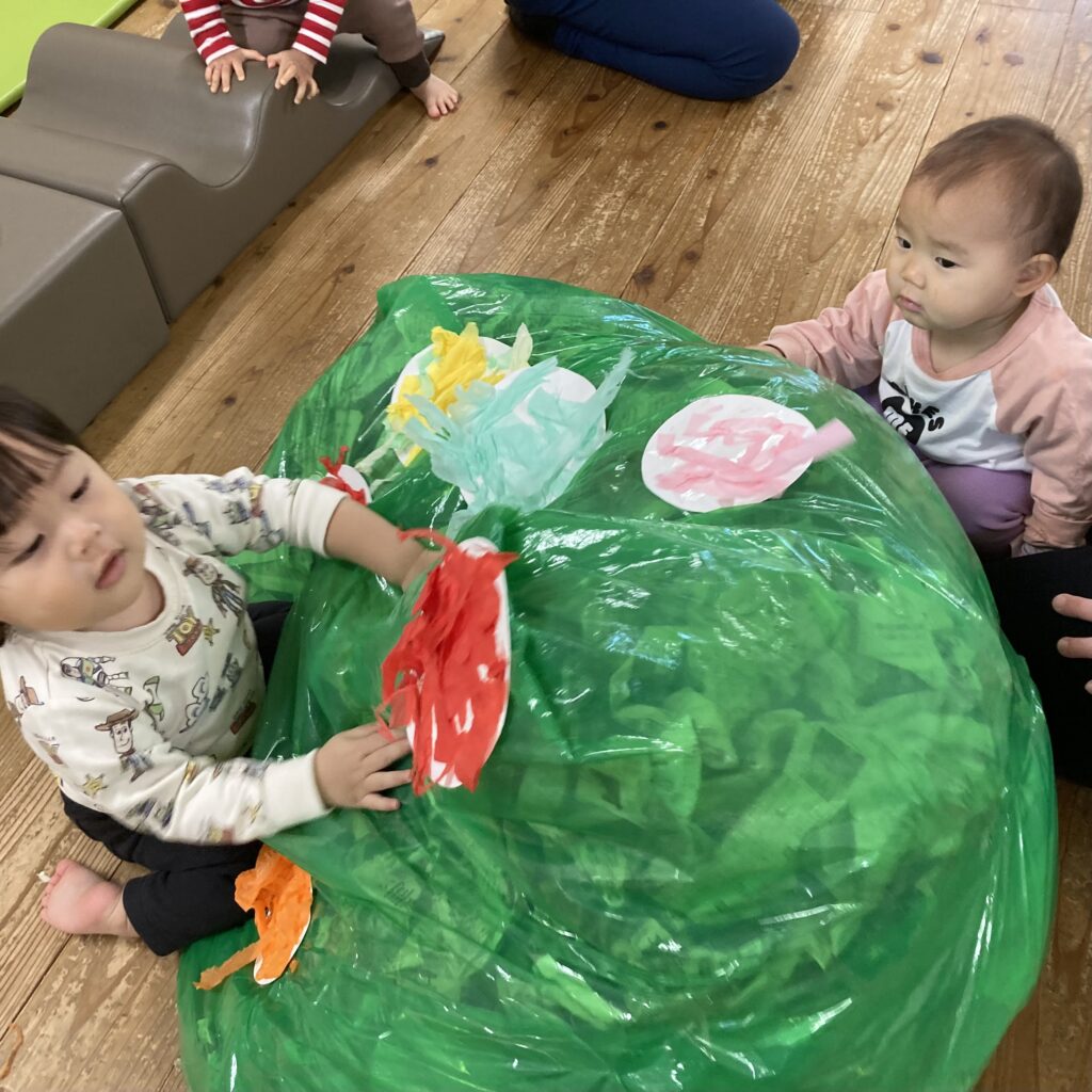 フープにテープを巻きつけてどこからでも何でもくっつくキャッチャーを作りました。子どもたちは遊んだ後のお花紙を貼り付けていきます。くるくる回るキャッチャーを手で押さえながら貼っている子もいました。ビニール袋にお花紙を詰めたカラフルボールもくだものの仲間入りをしています。大きなくだものはどの色が美味しいかな?