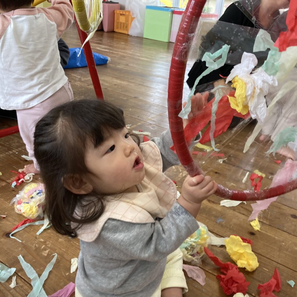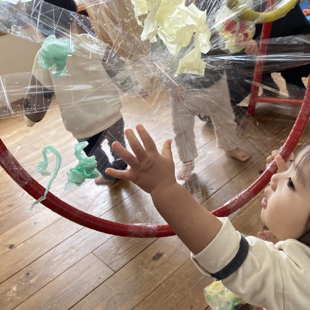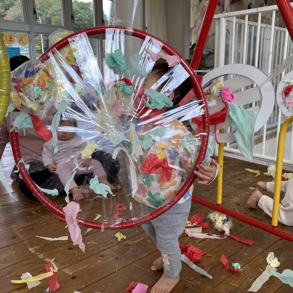 フープにテープを巻きつけてどこからでも何でもくっつくキャッチャーを作りました。子どもたちは遊んだ後のお花紙を貼り付けていきます。くるくる回るキャッチャーを手で押さえながら貼っている子もいました。ビニール袋にお花紙を詰めたカラフルボールもくだものの仲間入りをしています。大きなくだものはどの色が美味しいかな?