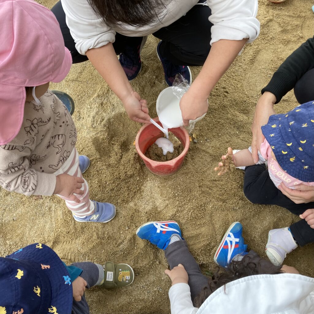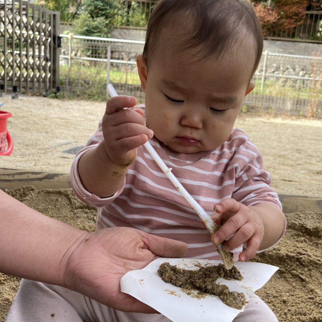 砂遊びをしている時に水のりを砂に混ぜて不思議な感触を楽しみました。そして小さな画用紙に少し泥をのせてみると指でつついたり手の平と紙を擦り合わせて塗りつけました。またスコップやスプーンで紙に擦り付け色がつくことを楽しむ子もいましたよ。