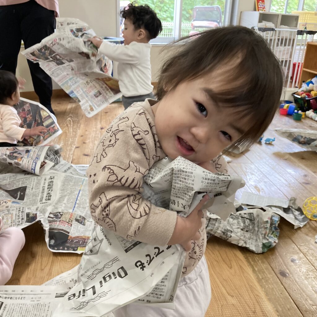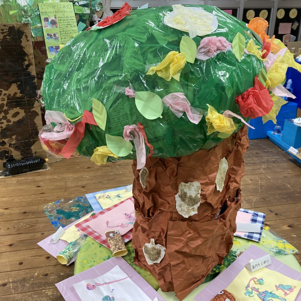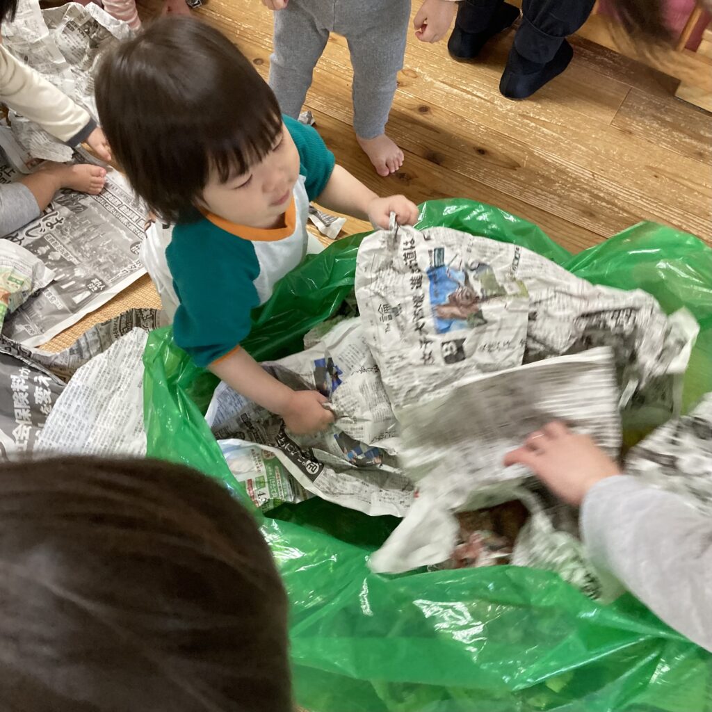 新聞紙を丸めたりくしゃくしゃにして楽しんだ後は、みんなで大きな緑色の袋に新聞を入れる“新聞集め競走!“子どもたちは新聞をさらにギュッと丸めて袋に入れたり、ちぎって小さくなった新聞も集めて袋に入れてくれました。全部集まったら保育者が袋の口をギュッと結んで木の幹と合体したら“大きな木“が、出来上がりました!